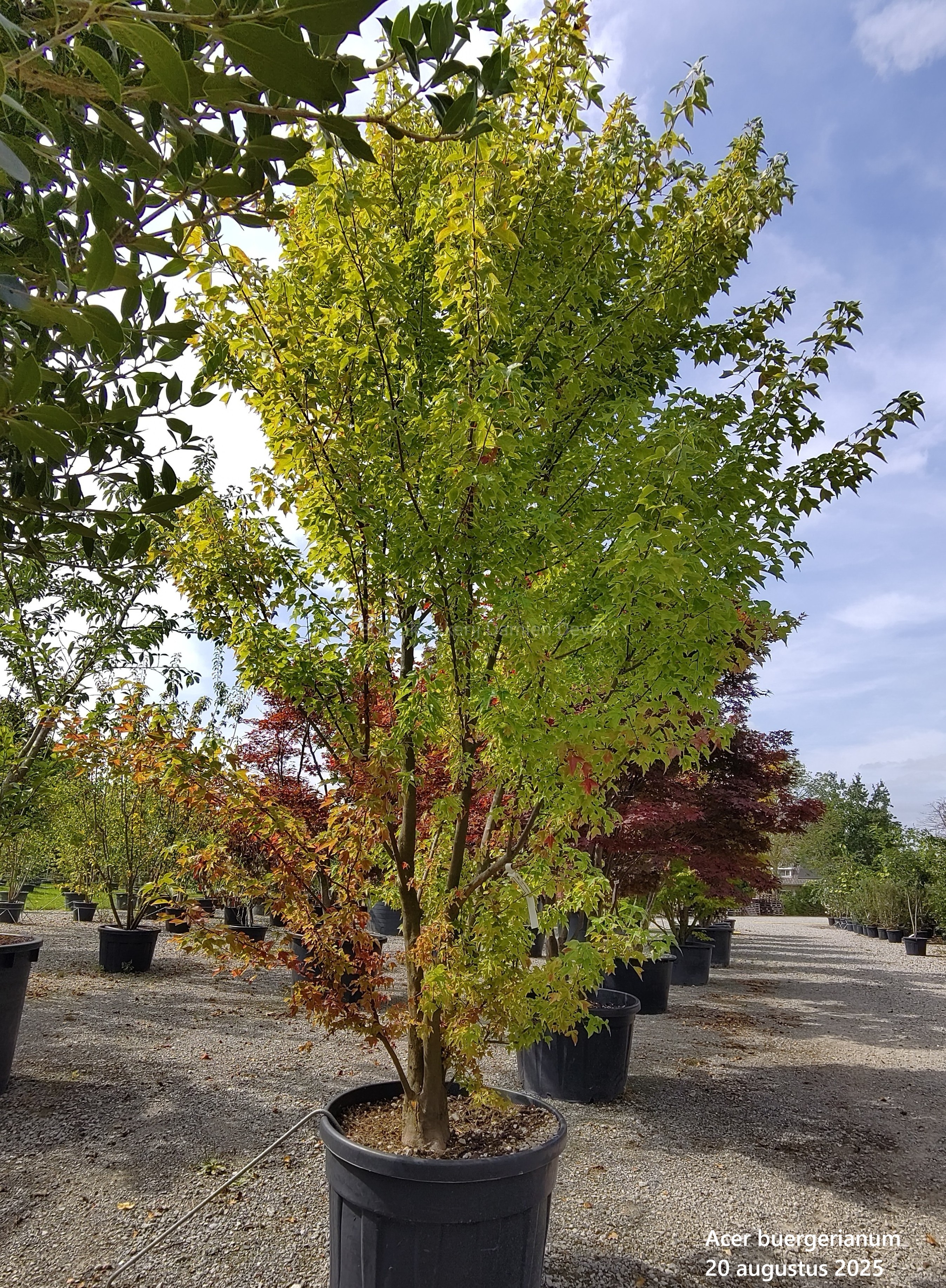 Cette espèce est également connue pour ses feuilles qui ont trois lobes orientés vers l'avant. Les feuilles brillantes, d'un vert foncé, se colorent en automne de jaune et de rouge orangé. En avril et mai, la floraison est discrète et les fleurs jaune pâle et crème apparaissent en corymbes sur la plante. Les fleurs sont suivies de fruits ailés. Préfère la mi-ombre dans un sol acide. L'espèce est bien rustique et supporte bien la sécheresse.