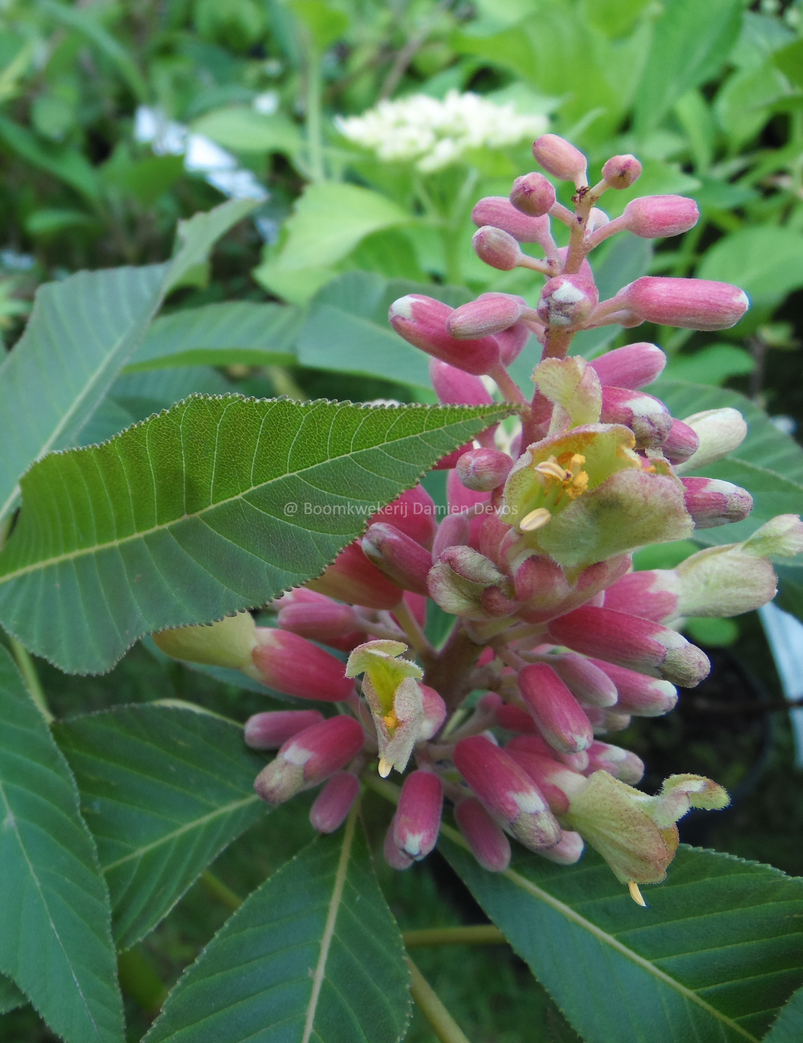 Aesculus pavia ‘Purple Spring’ est un petit arbre compact à croissance lente, avec une cime conique et dense. Au printemps, les feuilles sont pourpre?rouge et deviennent ensuite vert foncé. À la fin du printemps, apparaissent des panicules dressées, de jaune à rose, attirantes pour les abeilles. La couleur des fleurs varie selon les conditions environnementales et l’âge de l’arbre.