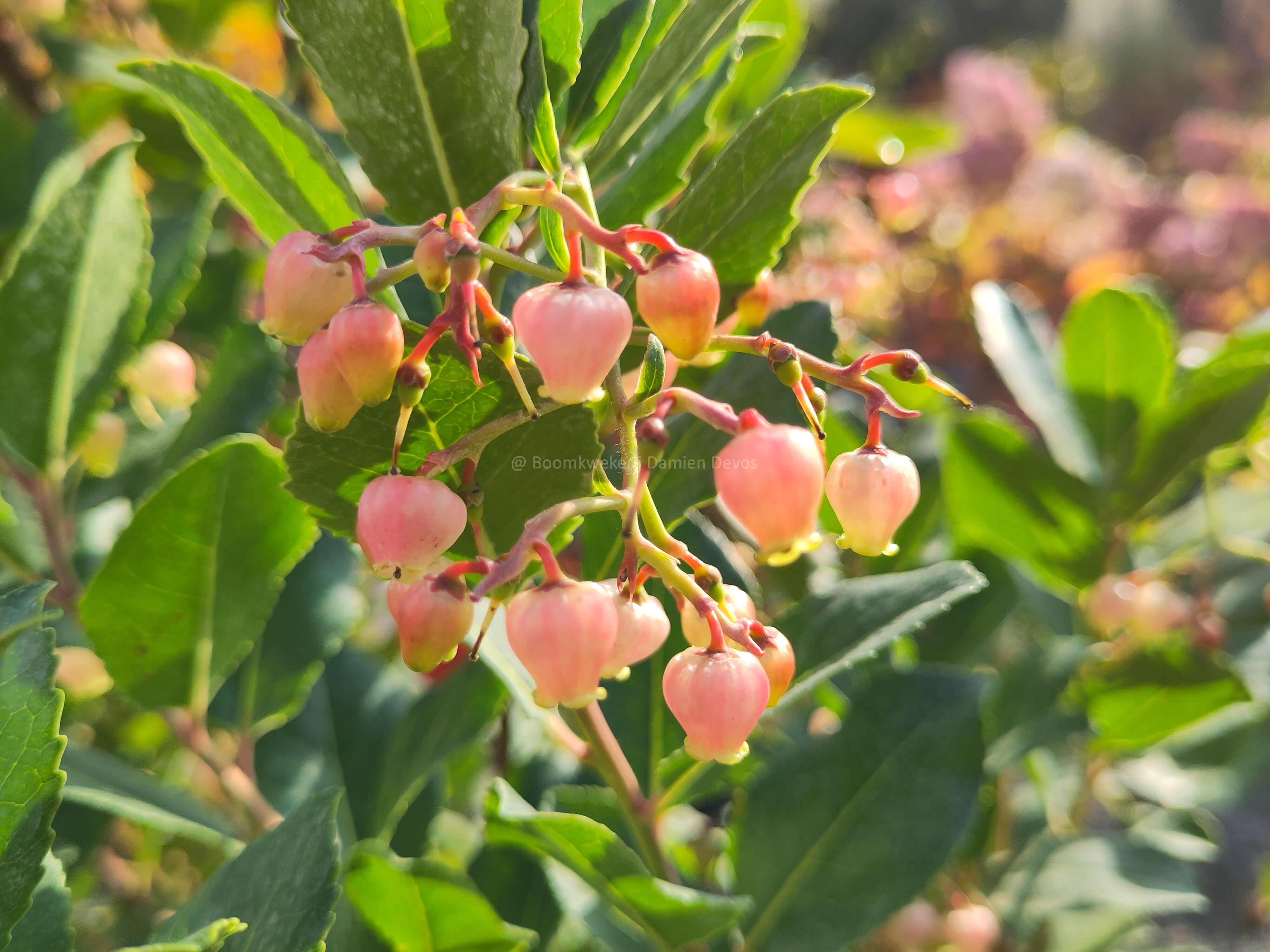 Arbutus unedo 'Rubra' a une longue floraison automnale (septembre jusqu'au décembre/janvier) avec de fleurs en grappes de clochettes rose.