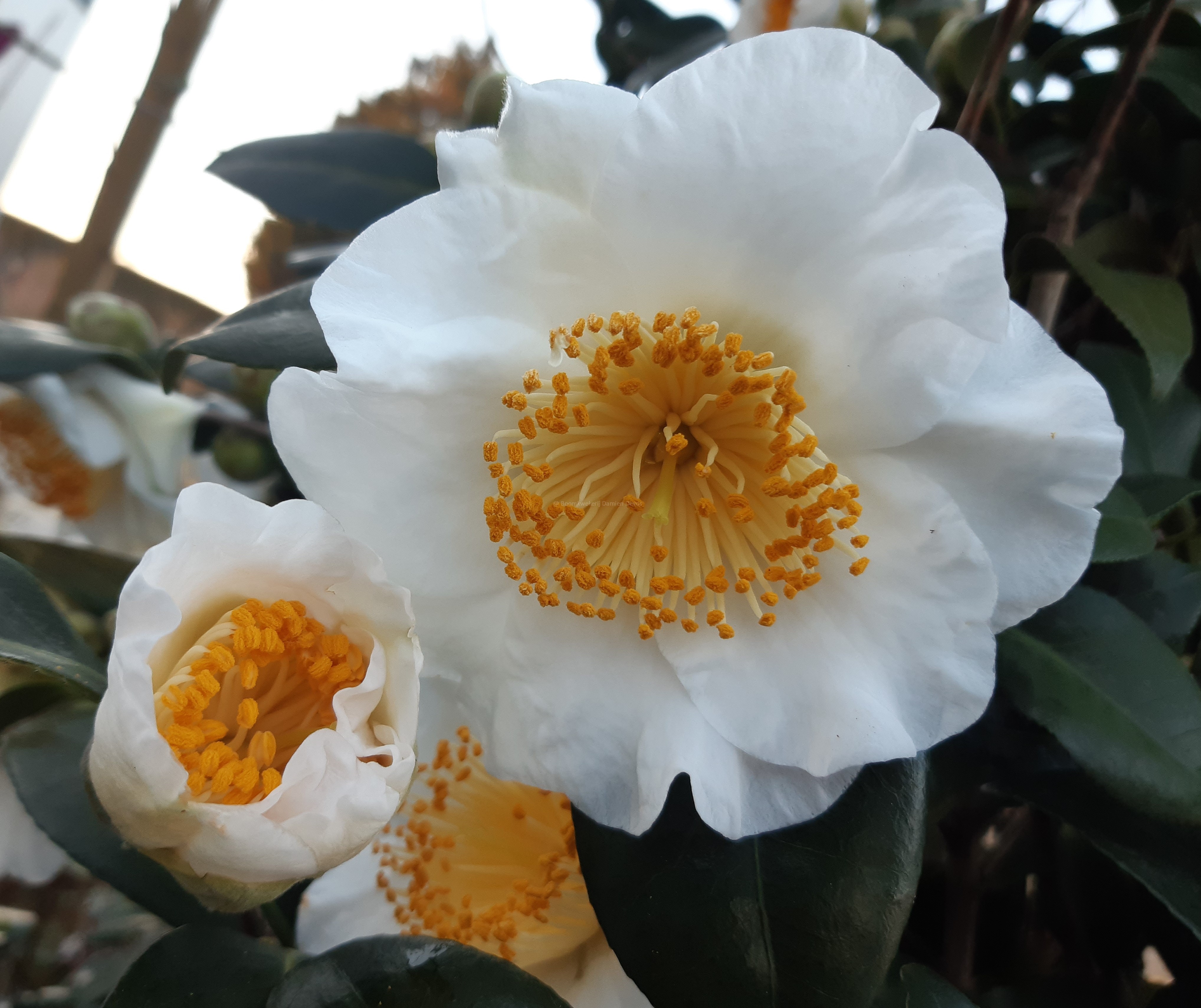 Ce camélia fleurit avec des fleurs simples d'un blanc pur avec de nombreuses étamines jaunes.