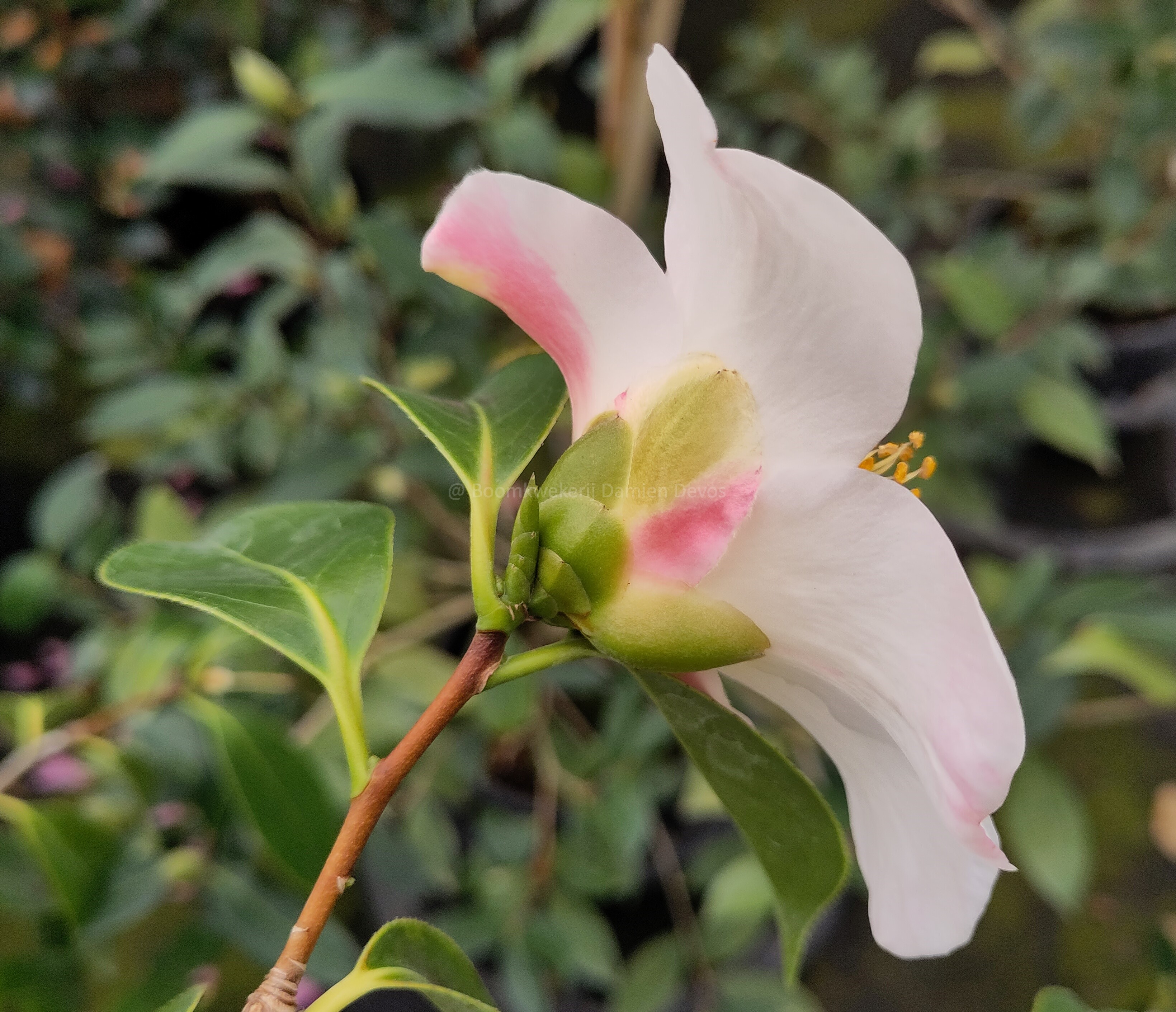 Camellia saluenensis 'Apple Blossom' est une espèce à fleurs simples et blanches, légèrement parfumées qui peuvent devenir légèrement rose pâle sur le bord.