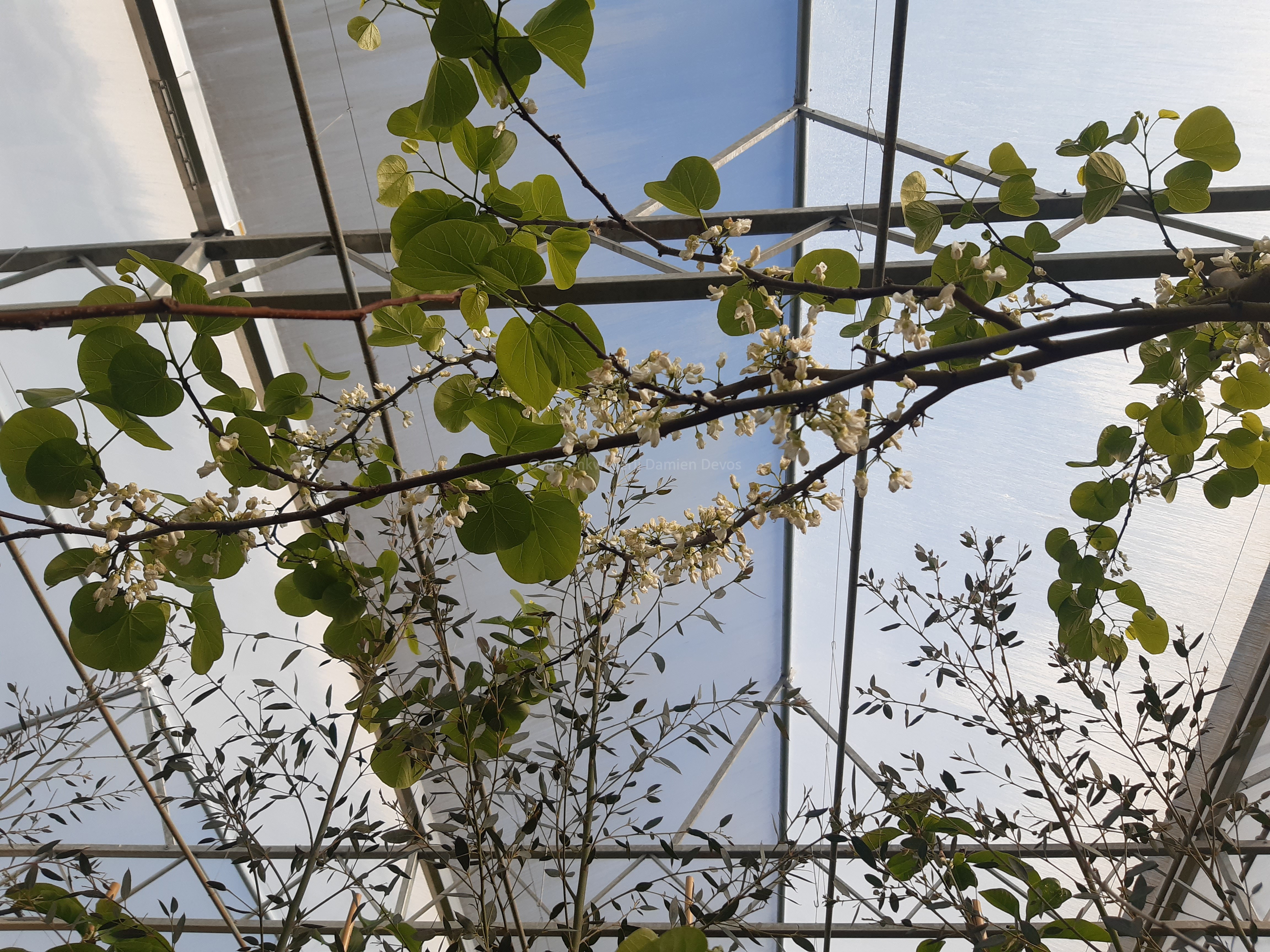 Les fleurs blanches apparaissent avant le développement des feuilles. Après les fleurs, des légumineuses plates se forment.