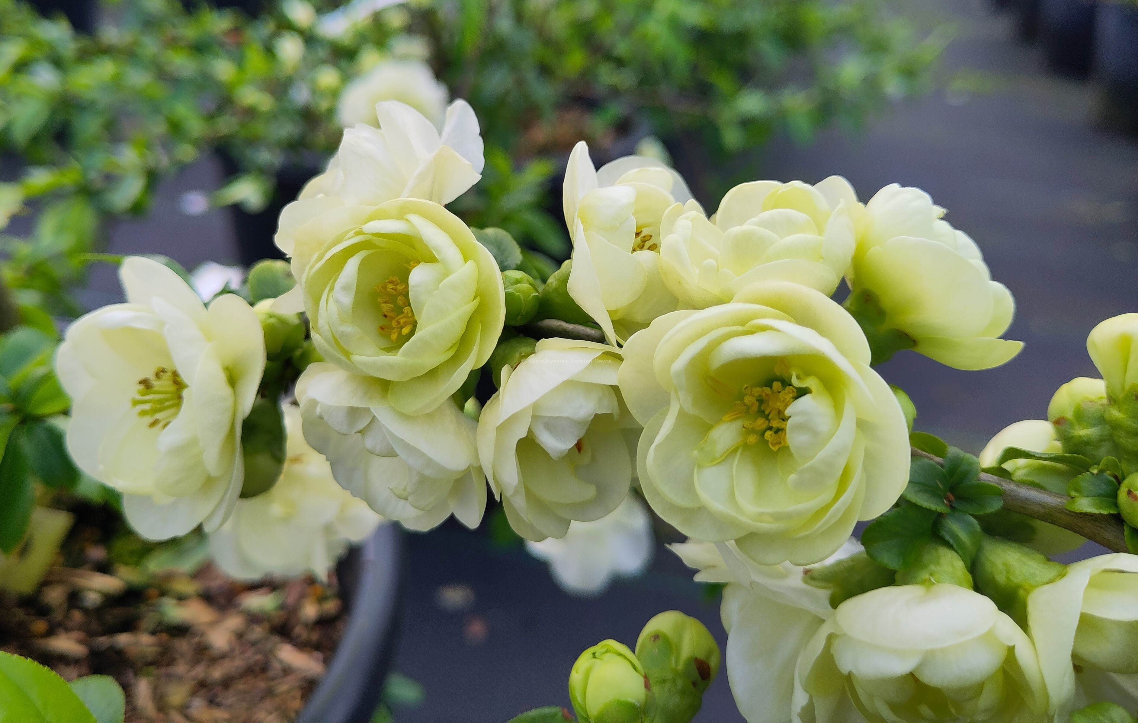 Chaenomeles speciosa 'Yukigoten' fleurit avec des grappes de fleurs semi-doubles blanc crème sur le bois nu en avril-mai.