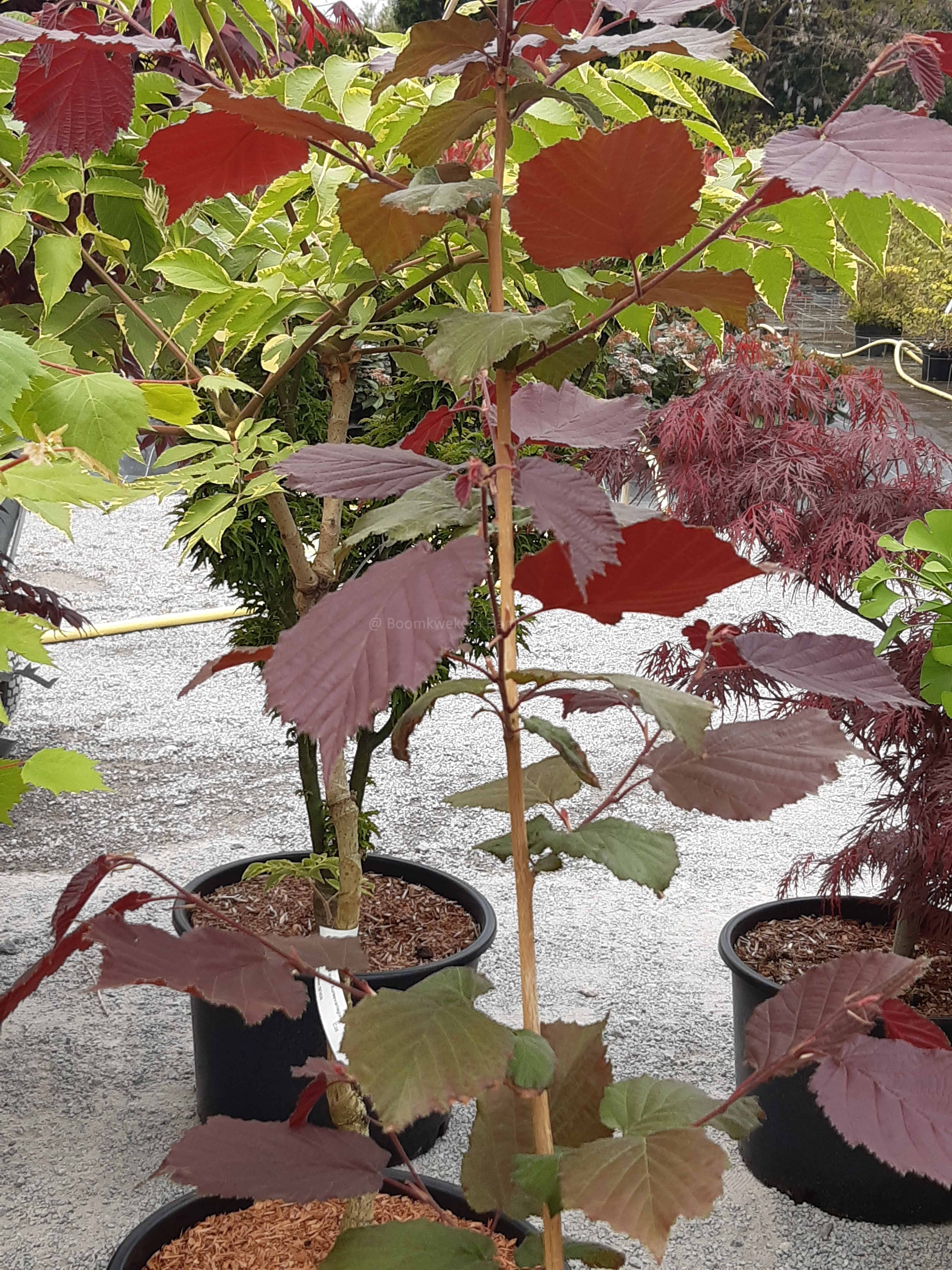 Le noisetier est un arbre à feuilles rouges. Lorsqu'elles apparaissent, les feuilles ont une belle couleur rouge pourpre, puis elles deviennent vertes en été. Cela crée une belle palette de couleurs bicolores qui rend l'arbre très attrayant. En automne, des noix comestibles apparaissent sur la plante, mais cet arbre n'est pas autogame. Le tronc se distingue également par son écorce liégeuse. L'arbre est peu exigeant quant au type de sol, mais il préfère les sols sablonneux calcaires. Il supporte également très bien la sécheresse.