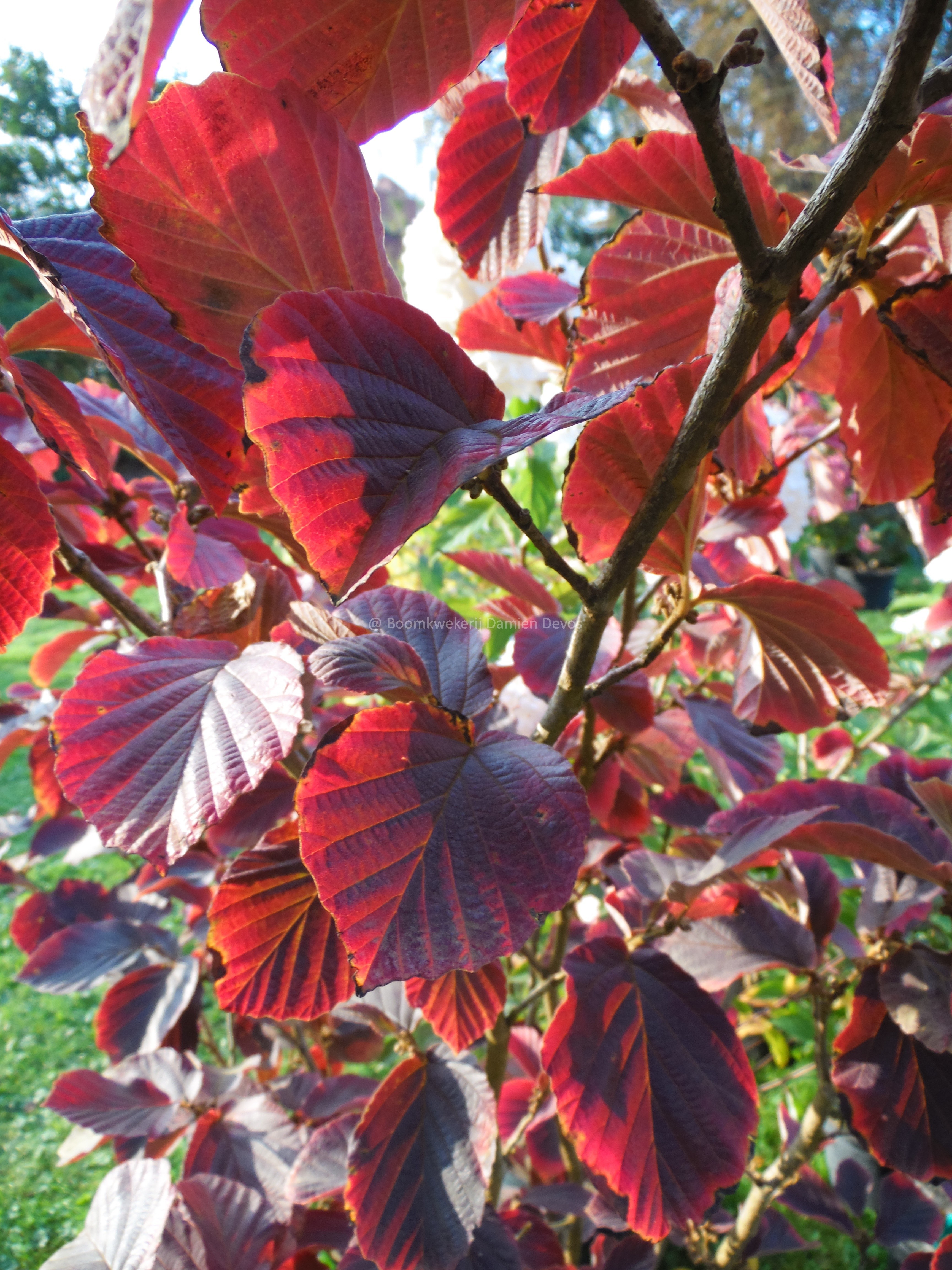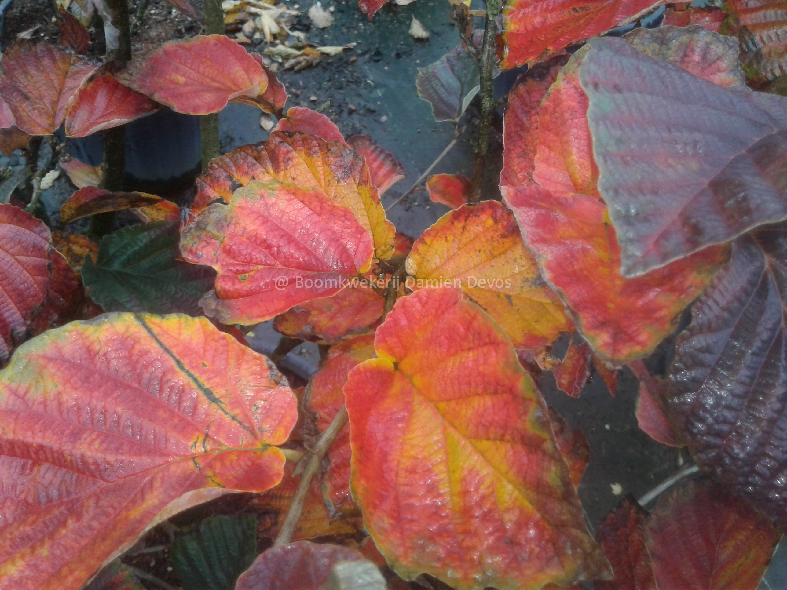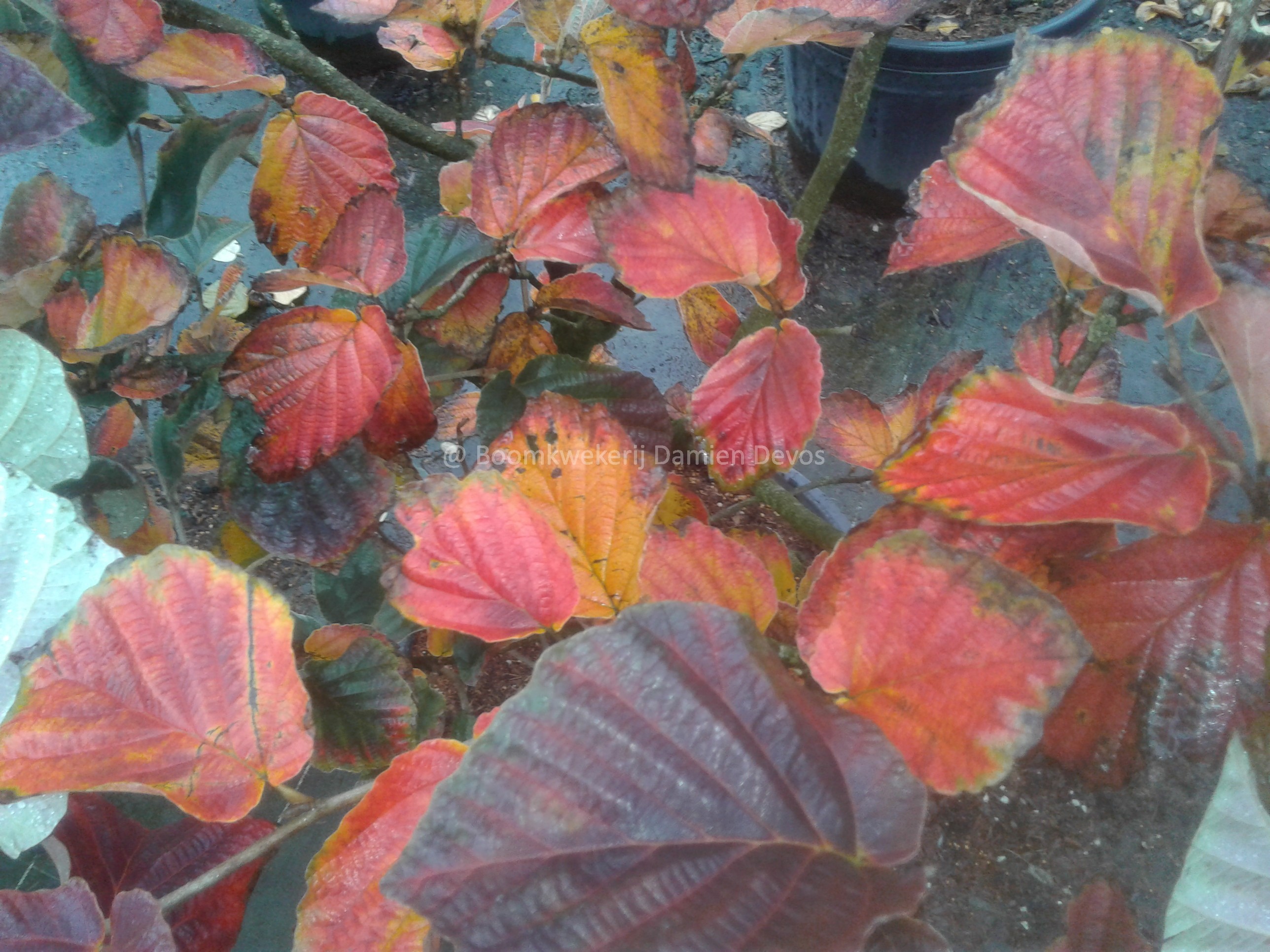 Il se distingue des autres hamamélis par ses belles feuilles pourpres, qui deviennent rouge-orange-jaune en automne.