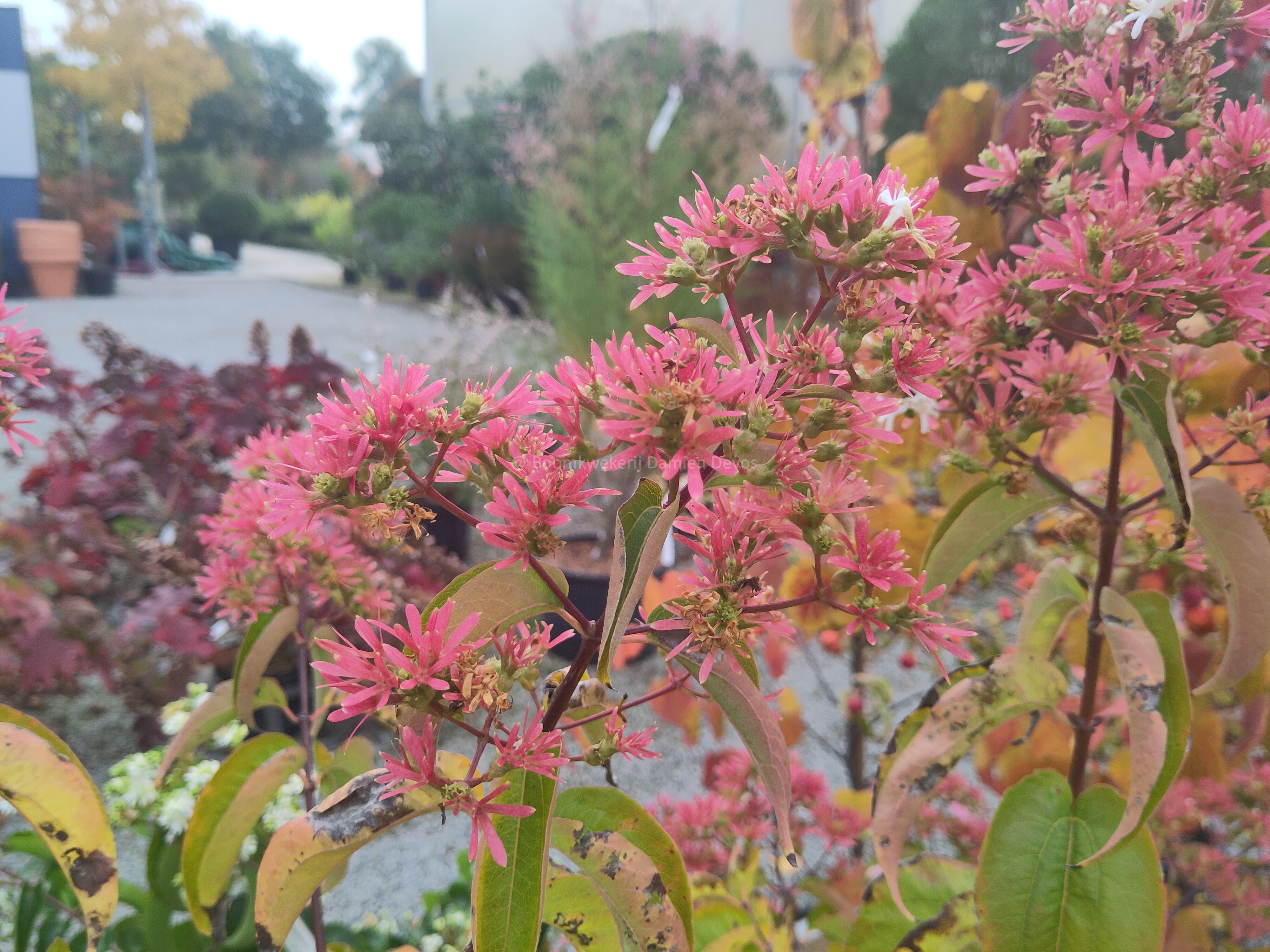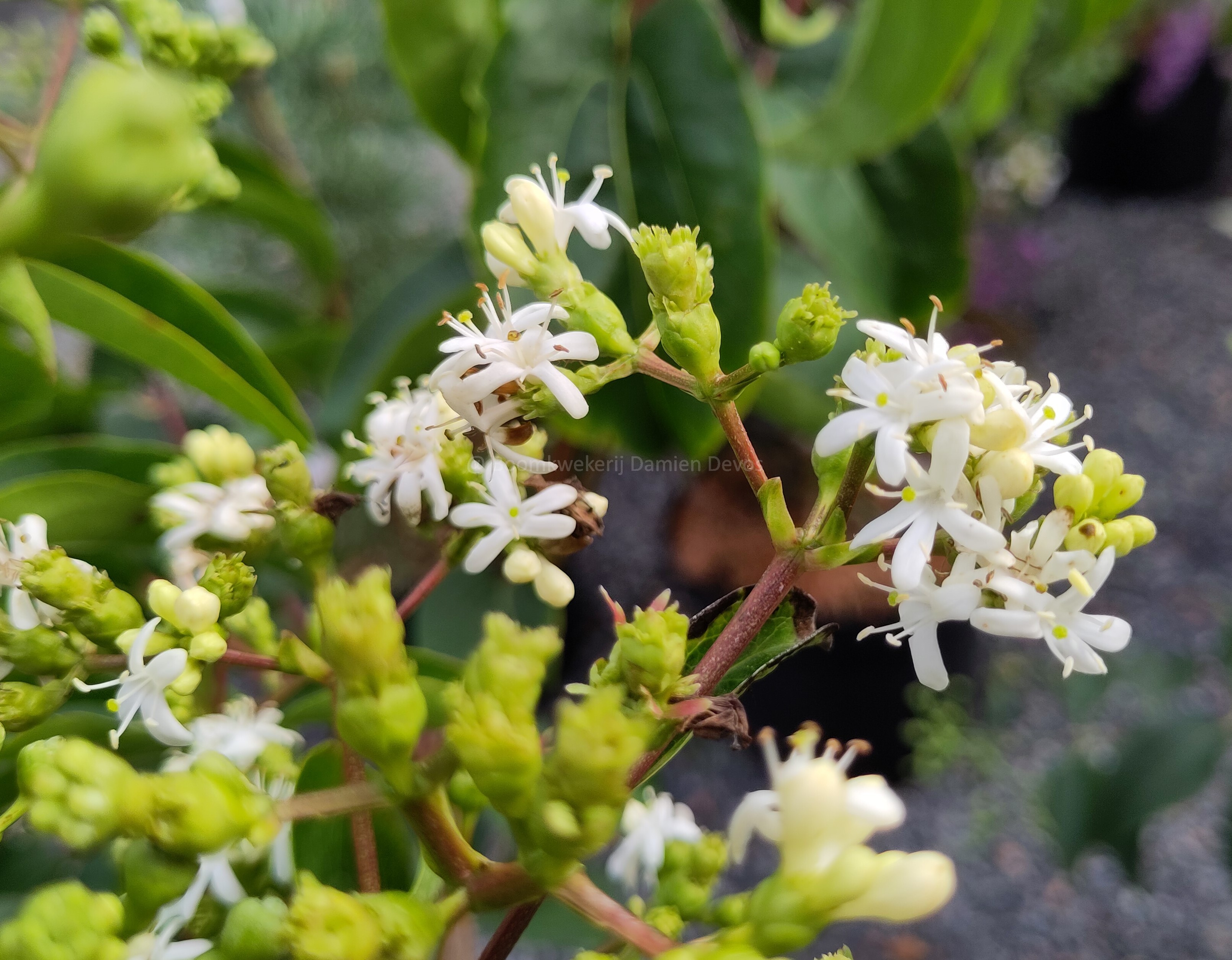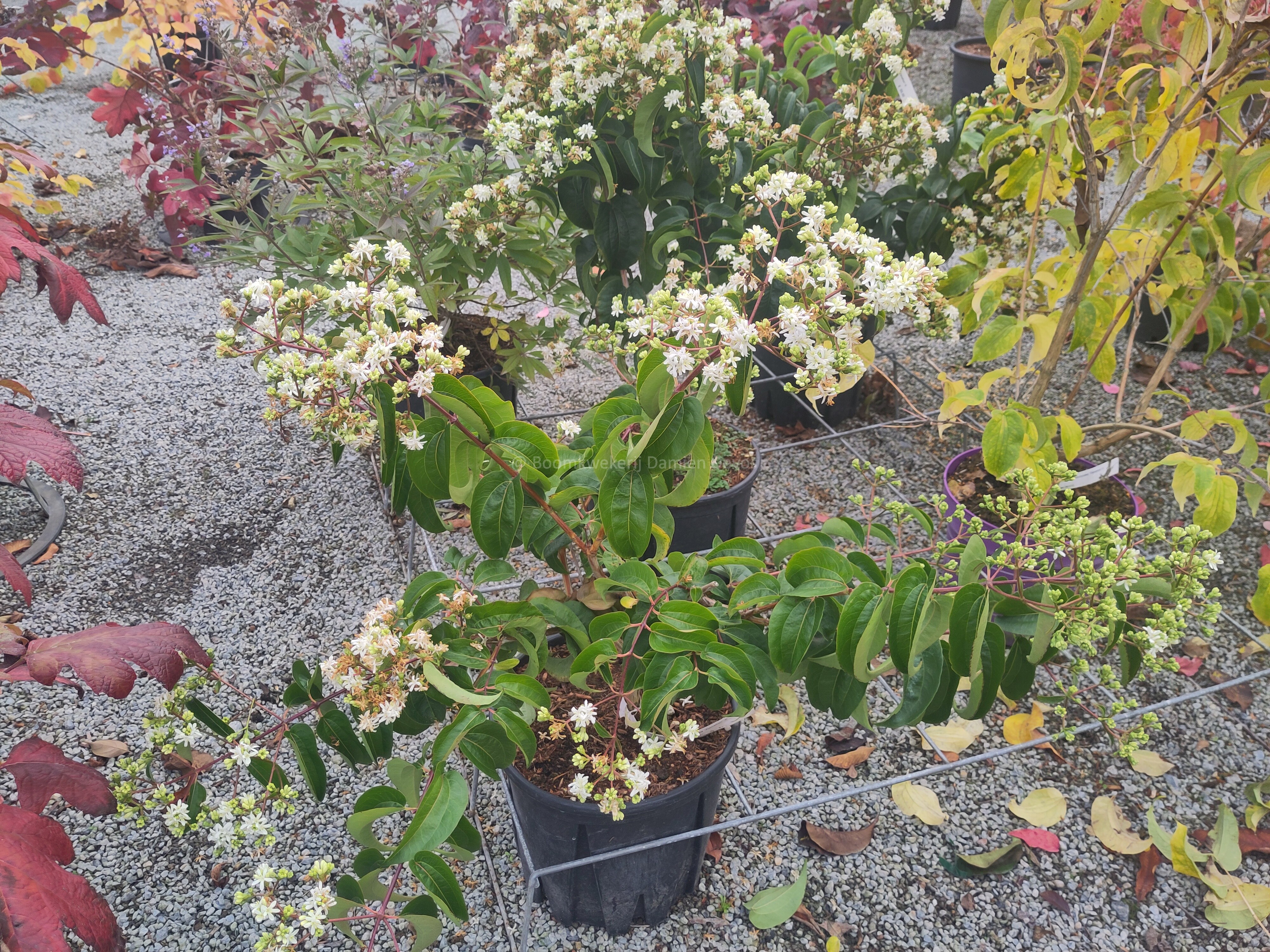 Ce magnifique Heptacodium est un peu plus petit que l'Heptacodium miconioides commun et fleurit très abondamment dès son jeune âge. Dès le mois d'août, de belles fleurs blanches apparaissent sur la plante, répandant un parfum agréable. Ensuite, les sépales prennent une belle couleur rouge vif qui reste très longtemps. La tige est également très caractéristique en raison de son exfoliation frappante.