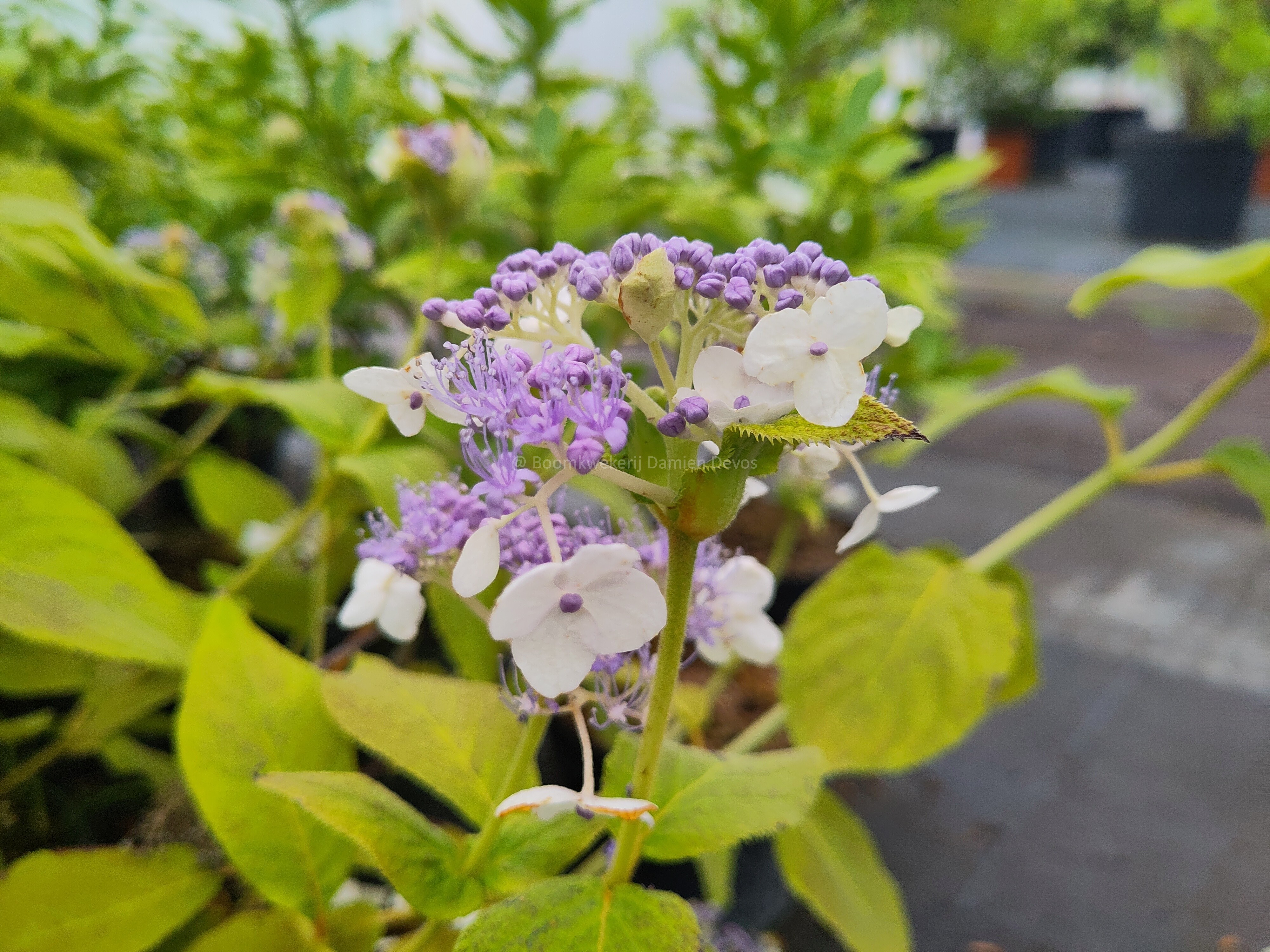 Hydrangea involucrata ‘Late Love’ est un arbuste caduc au feuillage vert foncé et à port compact et buissonnant. Il fleurit de la fin de l’été à l’automne avec des inflorescences plates mauves/violacées et blanches, très décoratives lorsque les autres hortensias ont déjà fini de fleurir. Très rustique et facile d’entretien.