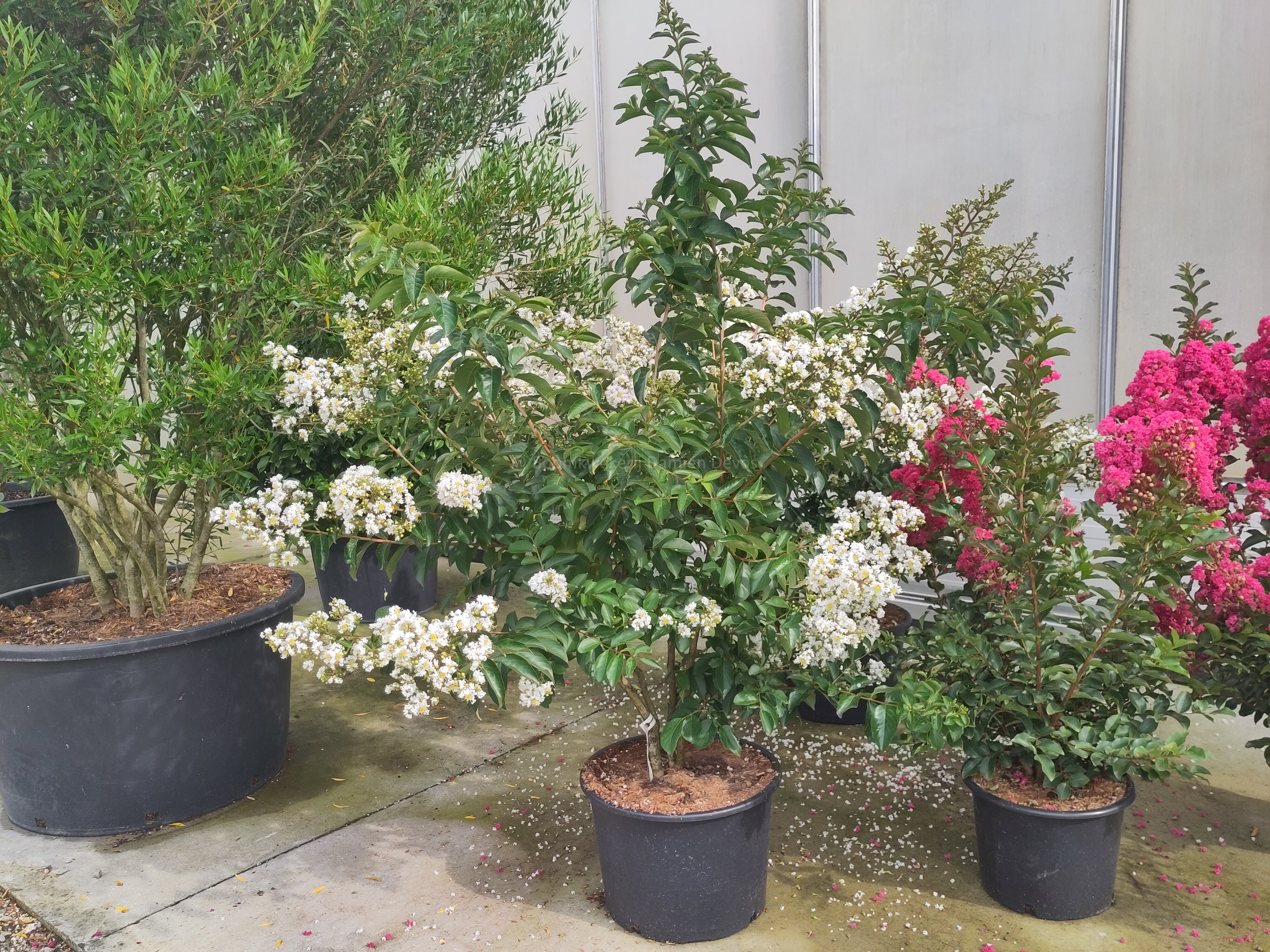 Le Lagerstroemia 'Sarah's Favorite' fleurit très longtemps avec de nombreuses fleurs blanches en été.