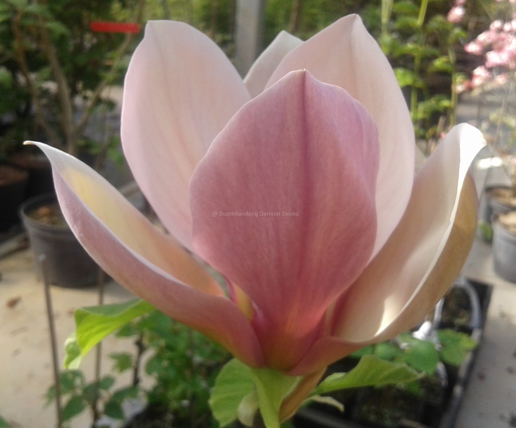 Ce magnifique Magnolia 'Eva Maria' fleurit en avril-mai avec des fleurs d'une couleur très inhabituelle, d'un rose fragile avec une pointe de jaune.