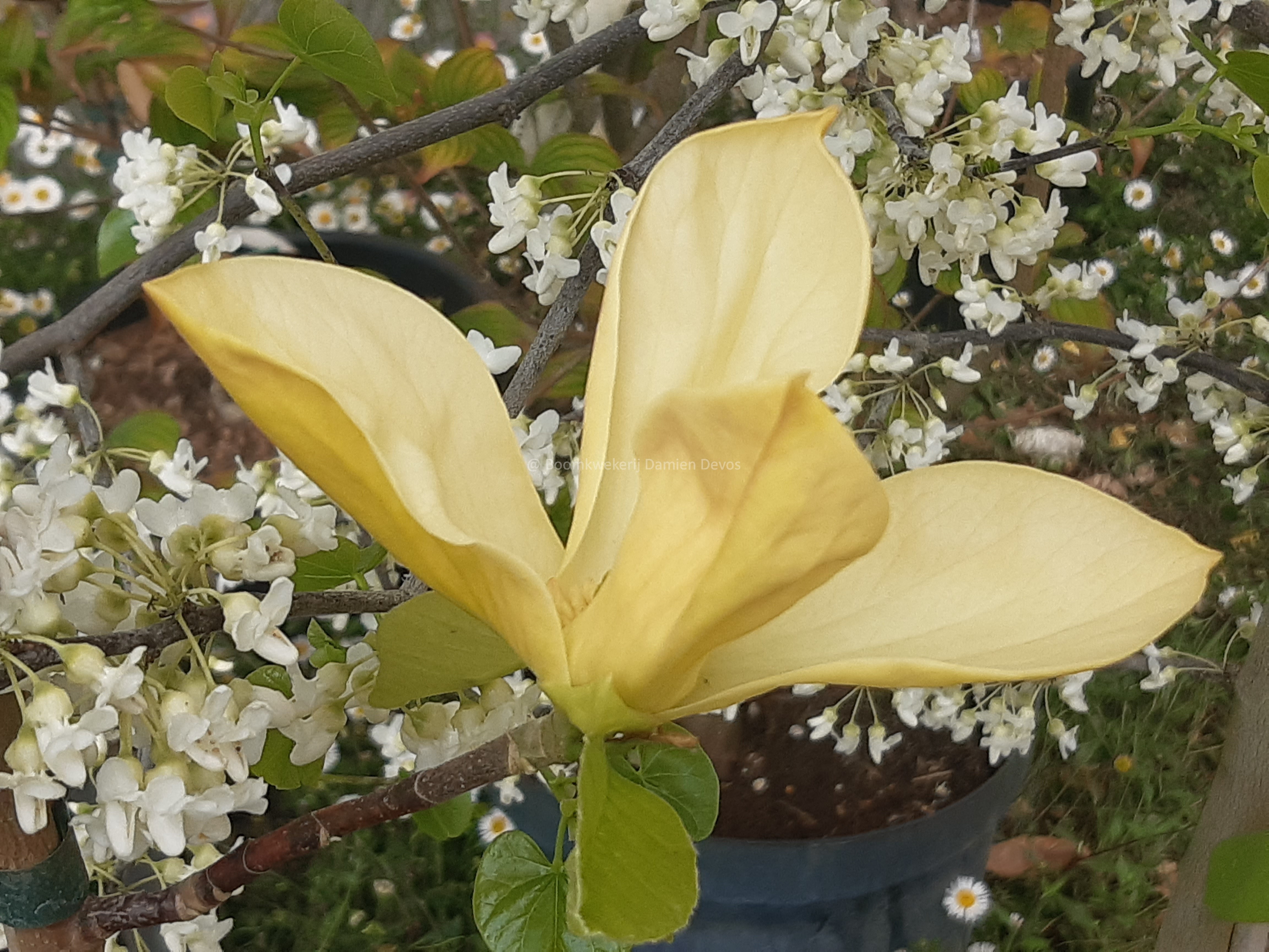 Sur le Magnolia 'Judy Zuk', les fleurs jaunes ou jaune orangé apparaissent en avril avec une petite teinte pourpre au début des pétales.