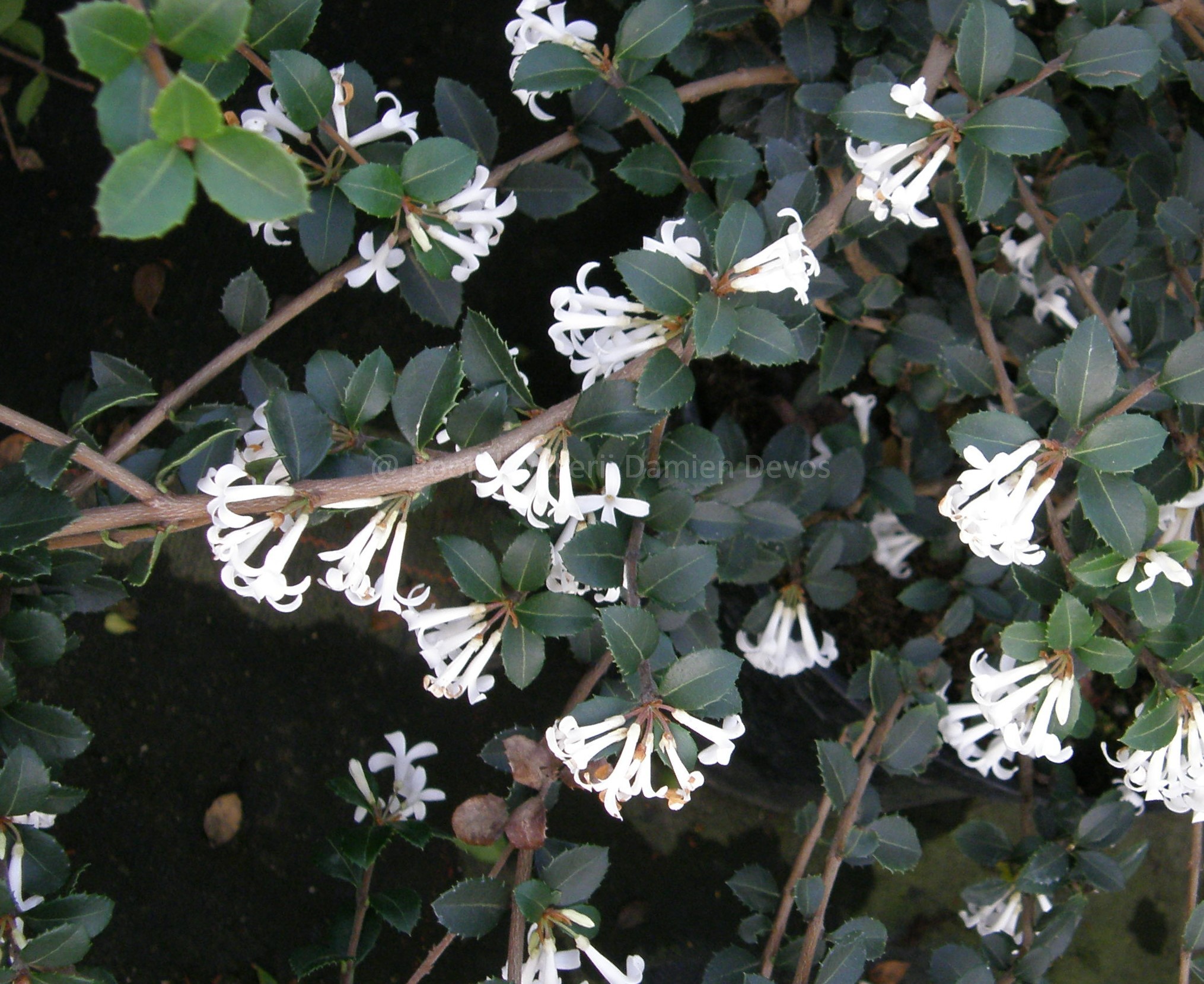 Cet arbuste persistant a une superbe floraison blanche très parfumée en fin mars - avril - mai esur de petites feuilles vertes.