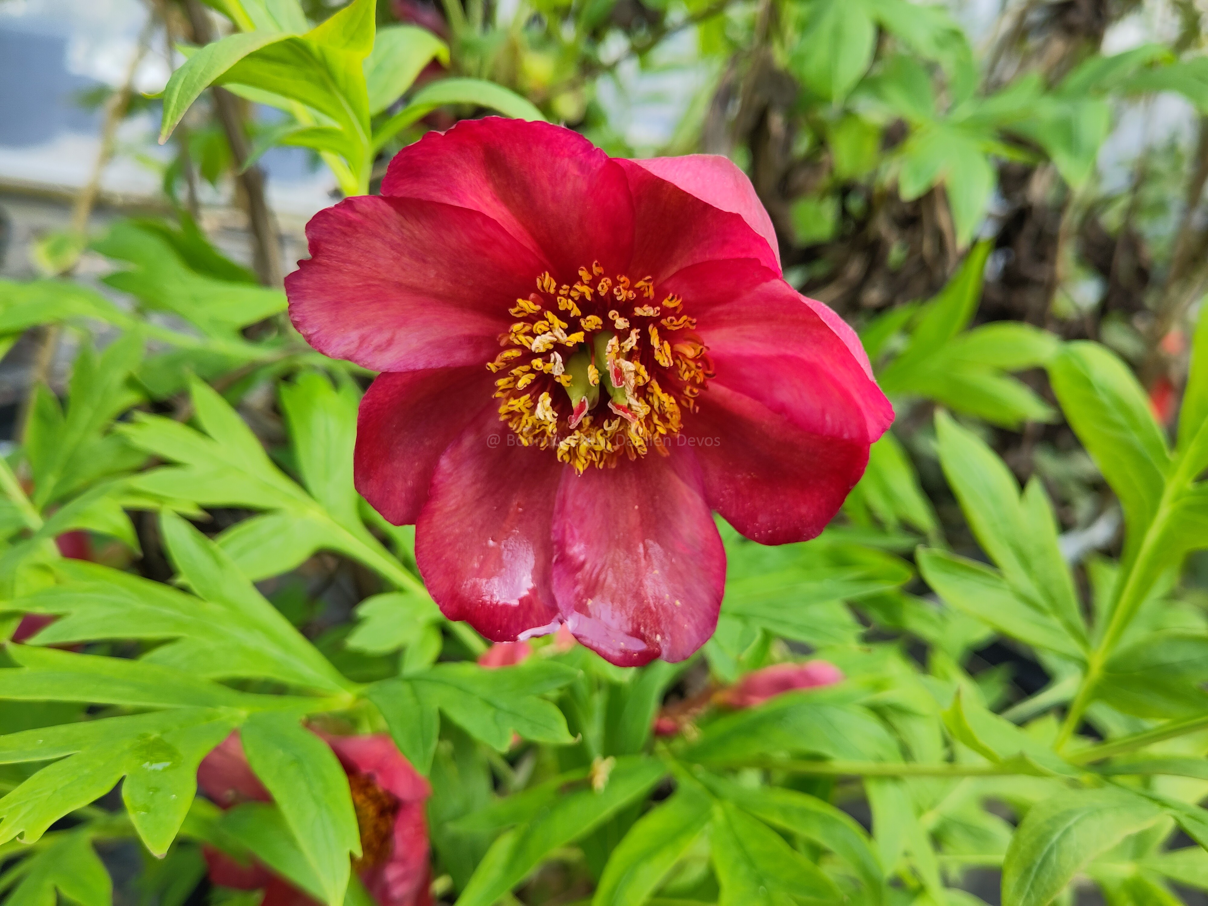 Paeonia delavayi est une pivoine arbustive aux feuilles vertes finement incisées et aux fleurs rouges foncées. Elles répandent un parfum agréable et sont très attrayantes pour les abeilles et les papillons. Elle peut être plantée au soleil ou à la mi-ombre, mais de préférence à l'abri.