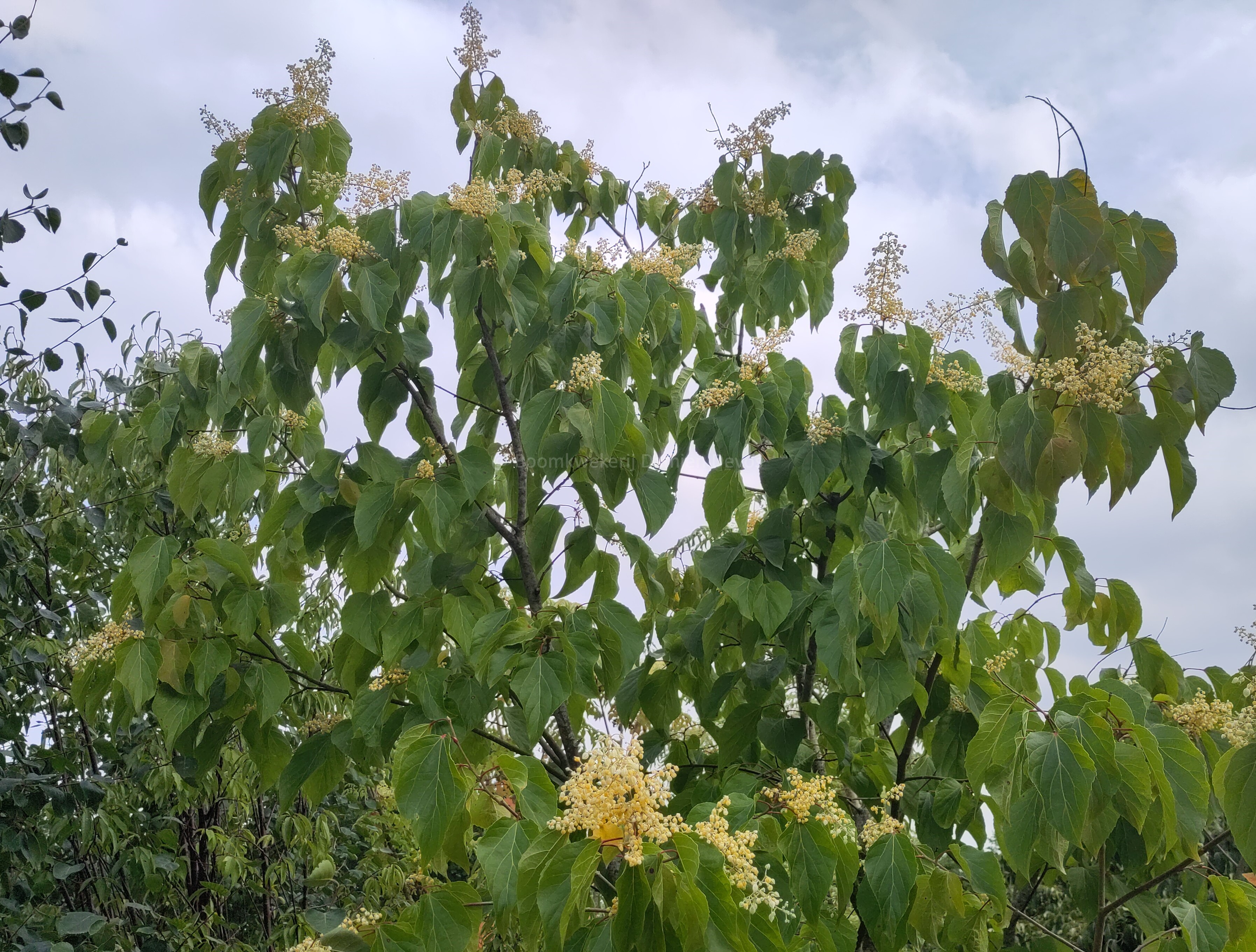 En juillet - août apparaissent des panicules lâches de fleurs crèmes parfumées.