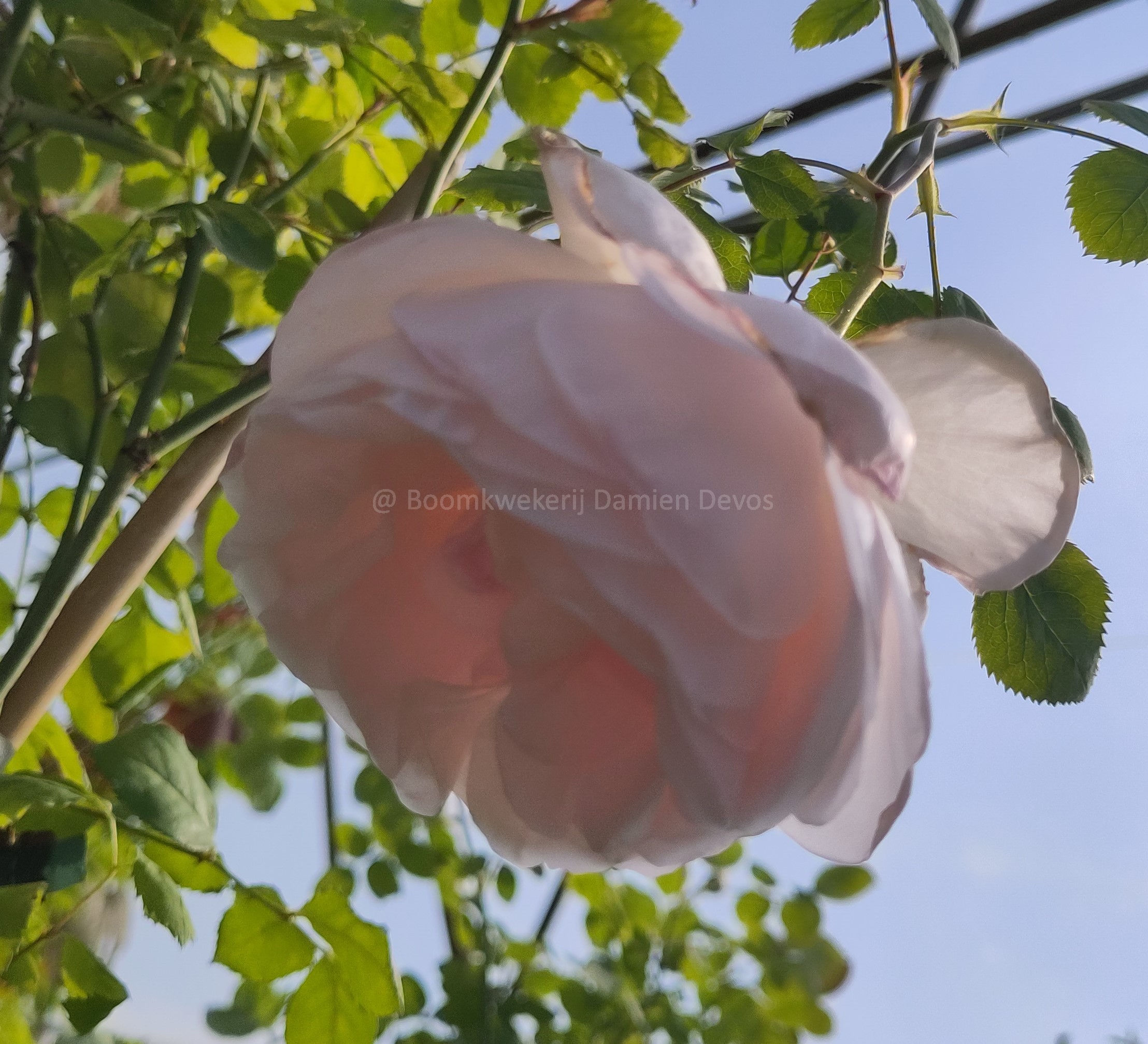 Rosa 'Caroline's Heart' est un arbuste très fleurissant depuis juin jusq'aux premiers gelées. Les fleurs sont grandes et en coupes doubles. D'abord elles sont rose tendre mais après se décolorent vers le rose clair. Les fleurs exhalent un parfum très délicieux de myrrhe.