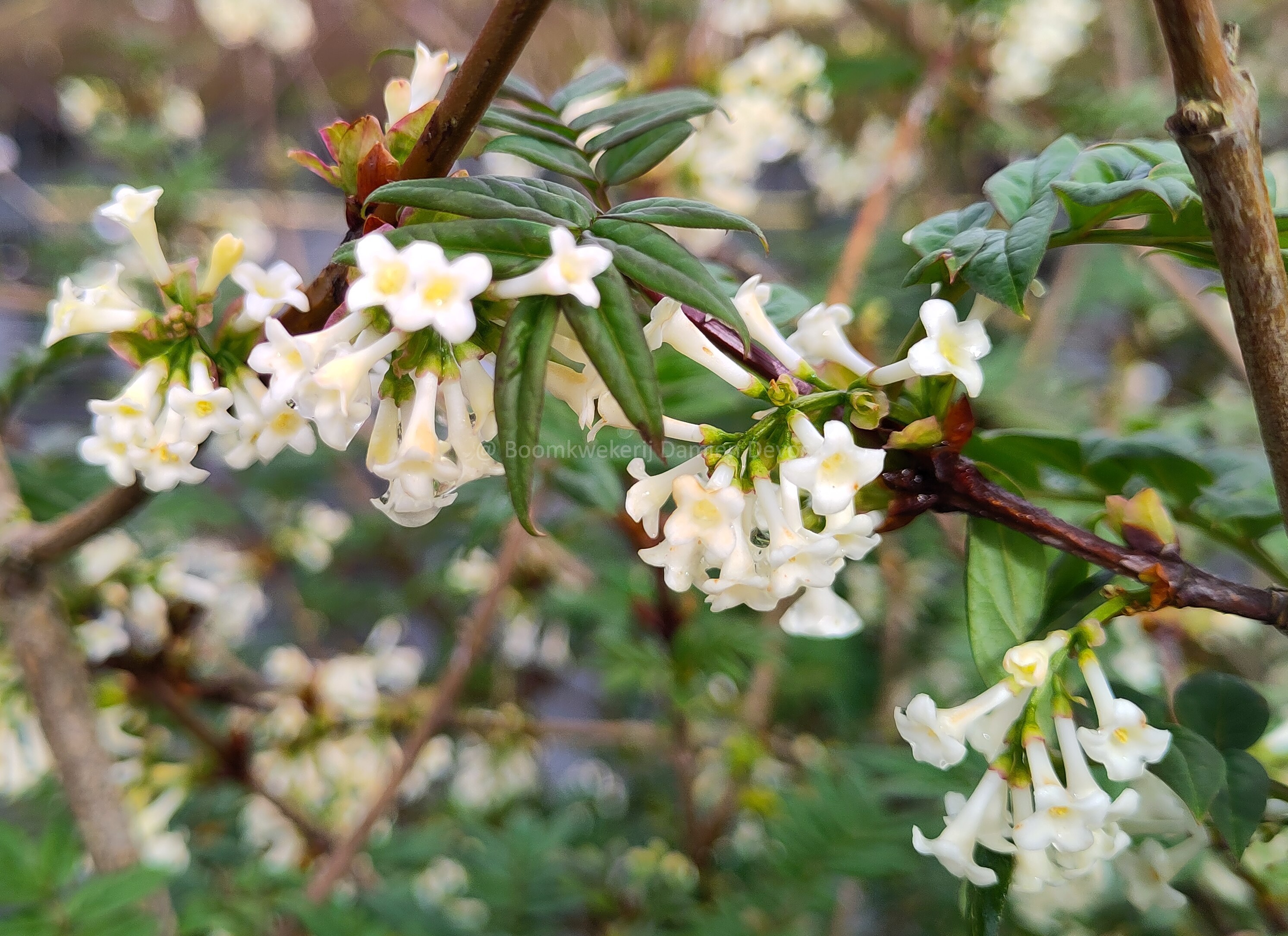 Arbuste caduc aux feuilles pennées vert foncé avec des fleurs blanches (très légèrement teinté de rose), parfumées en mars- avril.