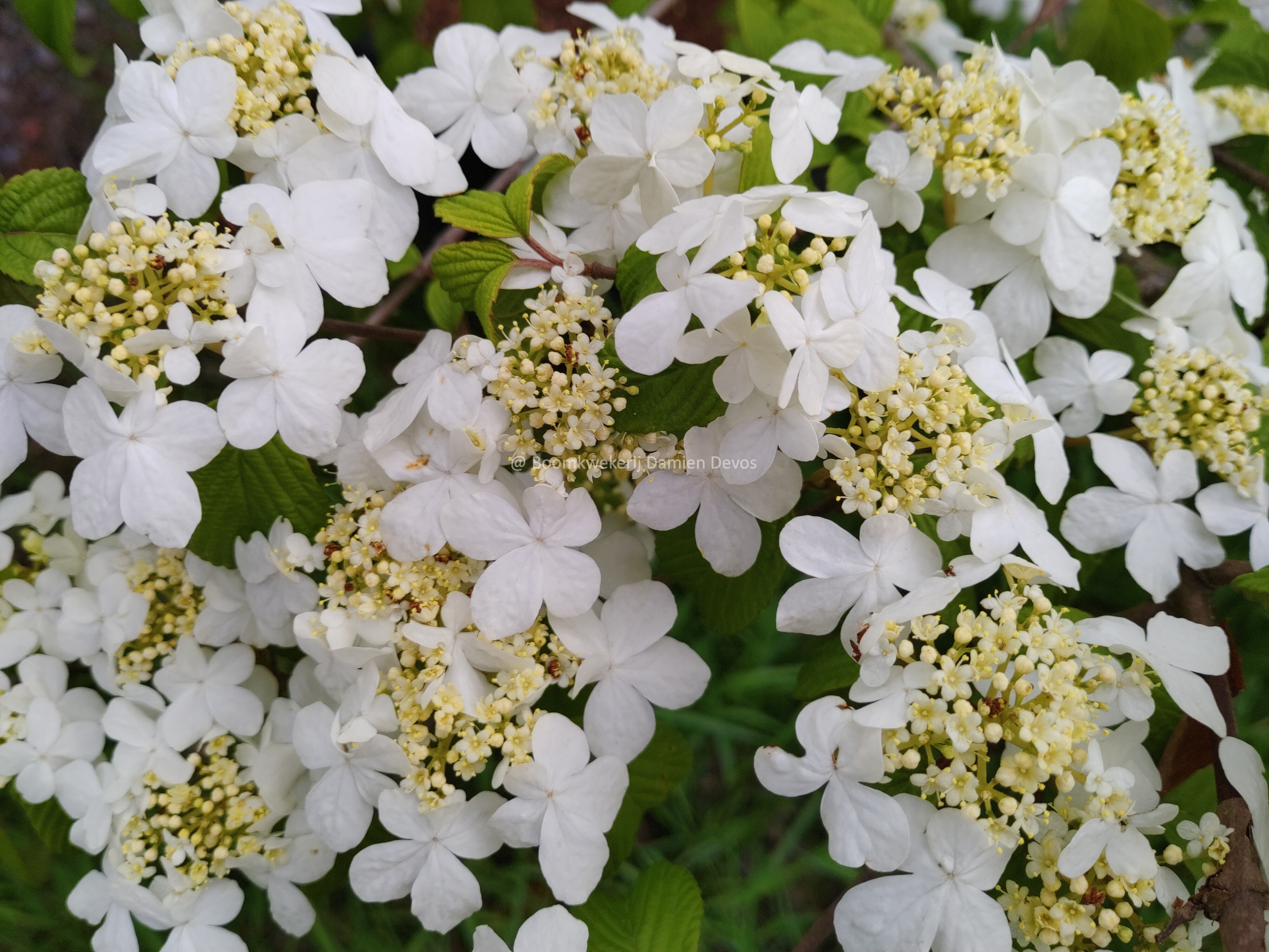 Le Viburnum plicatum 'Shasta' est un arbuste ornemental à port étalé, caractérisé par ses rameaux disposés en étages horizontaux. En mai–juin, il se couvre de nombreuses inflorescences plates blanches composées de fleurs périphériques décoratives disposées le long des branches. Après la floraison et en automne, apparaissent des baies rouges, tandis que le feuillage se teinte de nuances automnales pourpre-rouge. Tailler après la floraison.