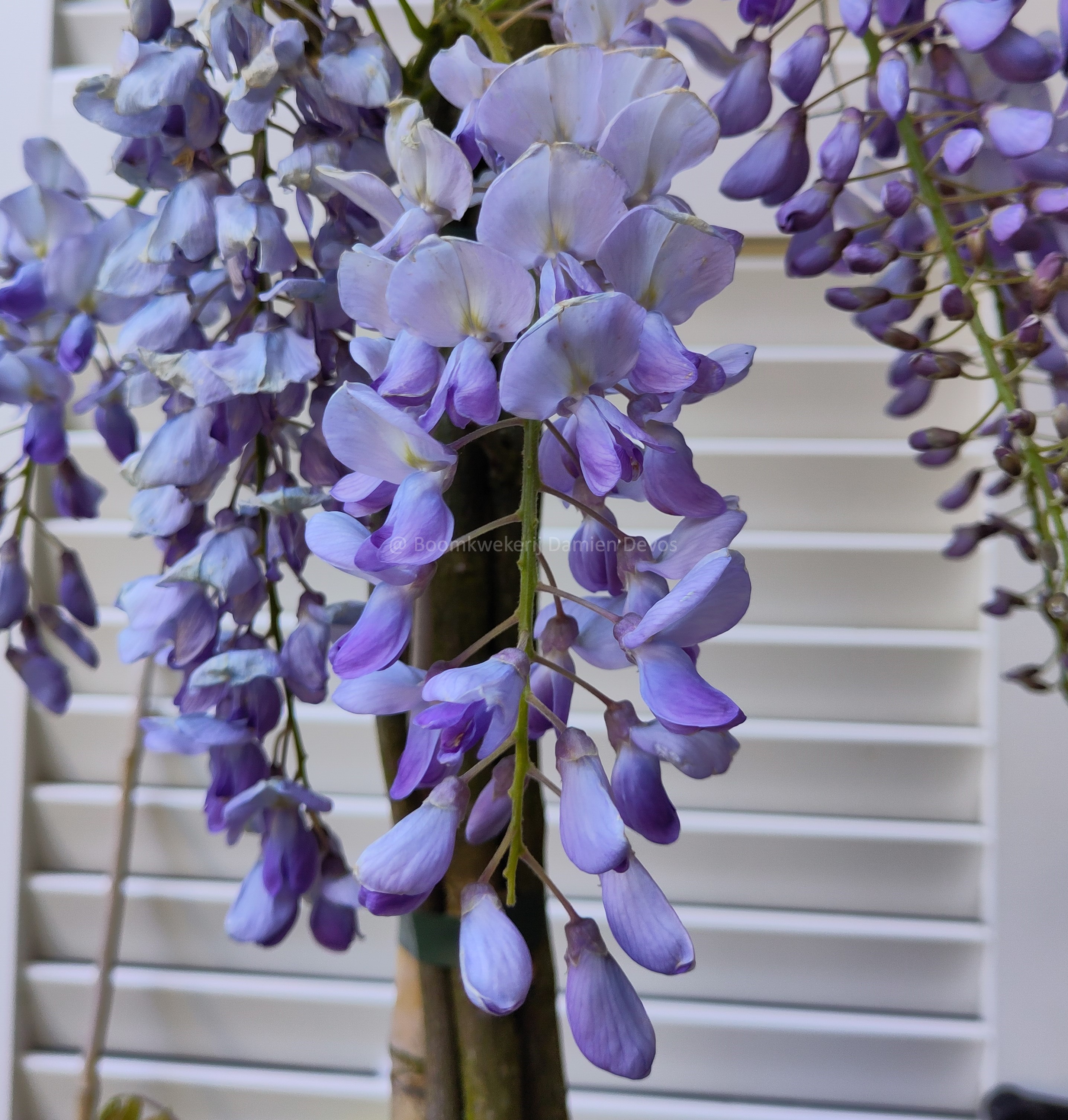 Wisteria sinensis 'Prolific' a de longues grappes de fleurs pointues d'environ 30 cm de long.