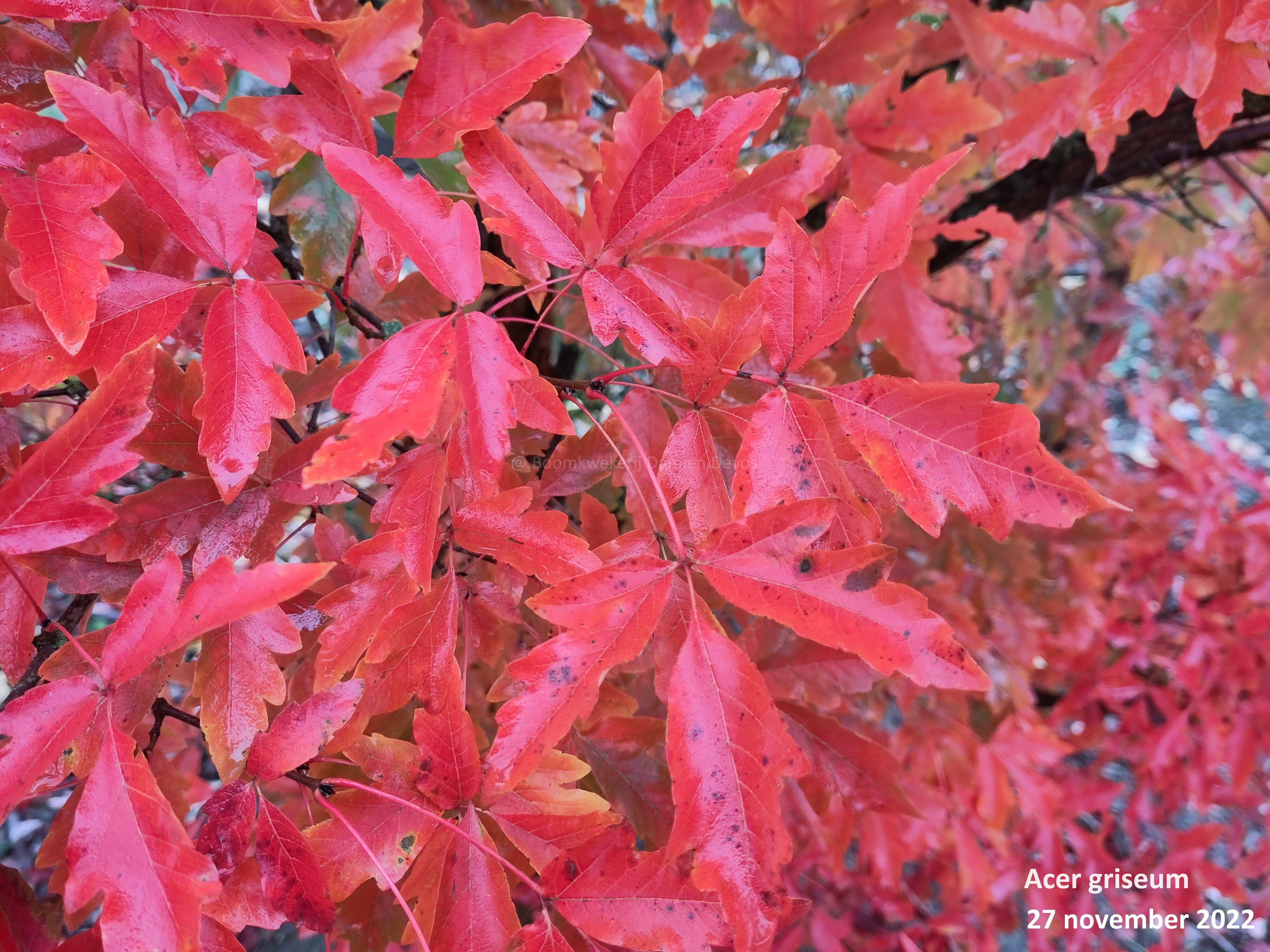 Wordt vooral gekenmerkt door zijn opmerkelijke, bruine, afschilferende stam. De bladeren verkleuren van grijsrood bij het uitkomen naar groen in de zomer om dan vervolgens te verkleuren naar schitterende herfstkleuren (oranje-rode herfstkleur). In het voorjaar verschijnen er onopvallende , lichtgele bloemen aan de plant. De plant is een rustige groeier en verkiest een plaats in de zon of in de half schaduw.