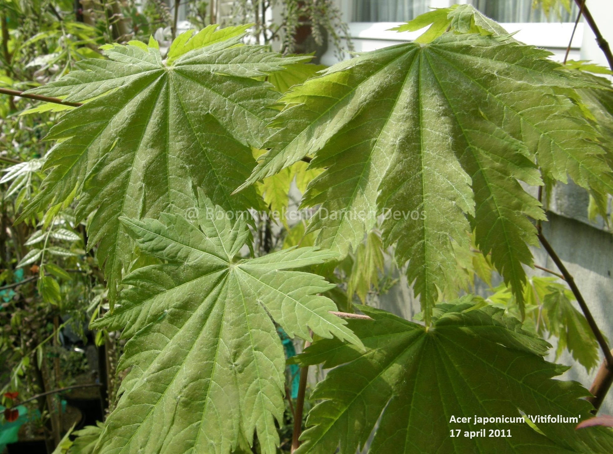 Acer japonicum 'Vitifolium' heeft zachtgroene bladeren in de lente die mooi feloranje en later karmozijnrood verkleuren in de herfst.