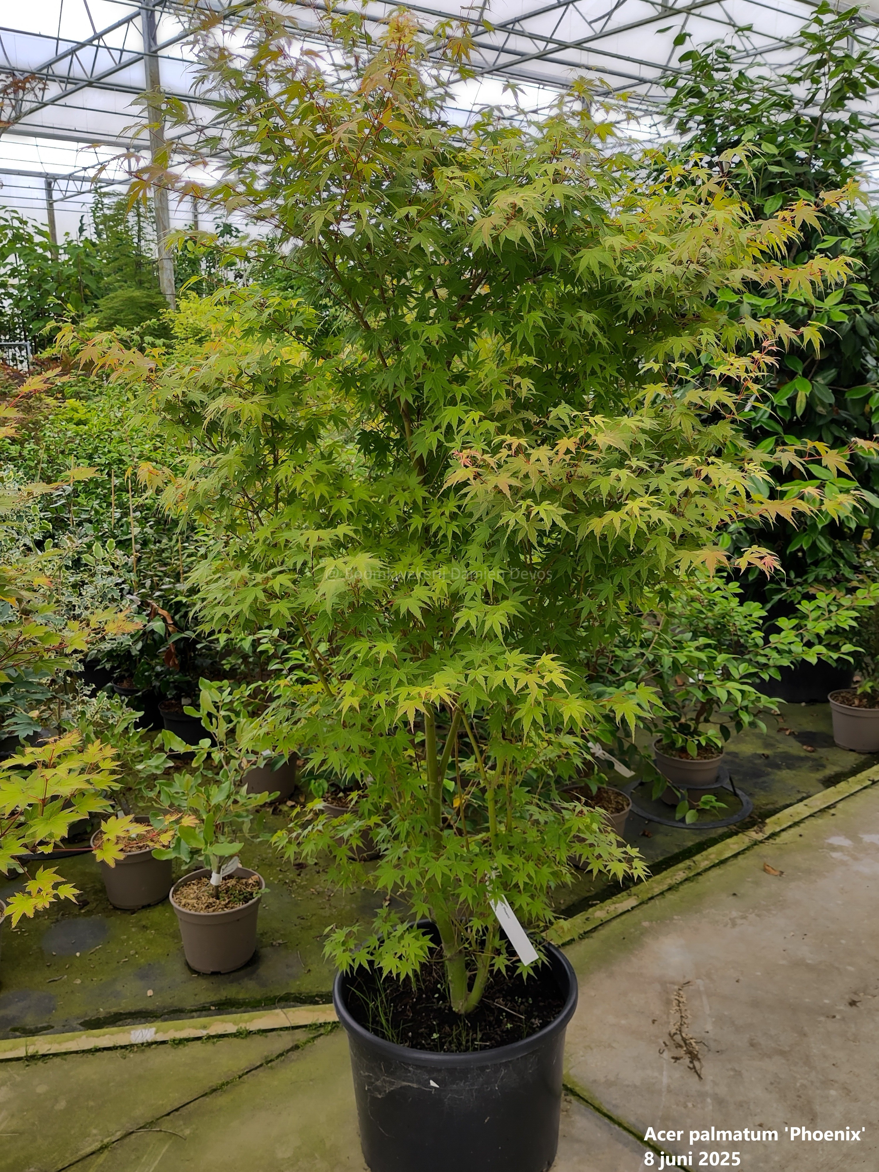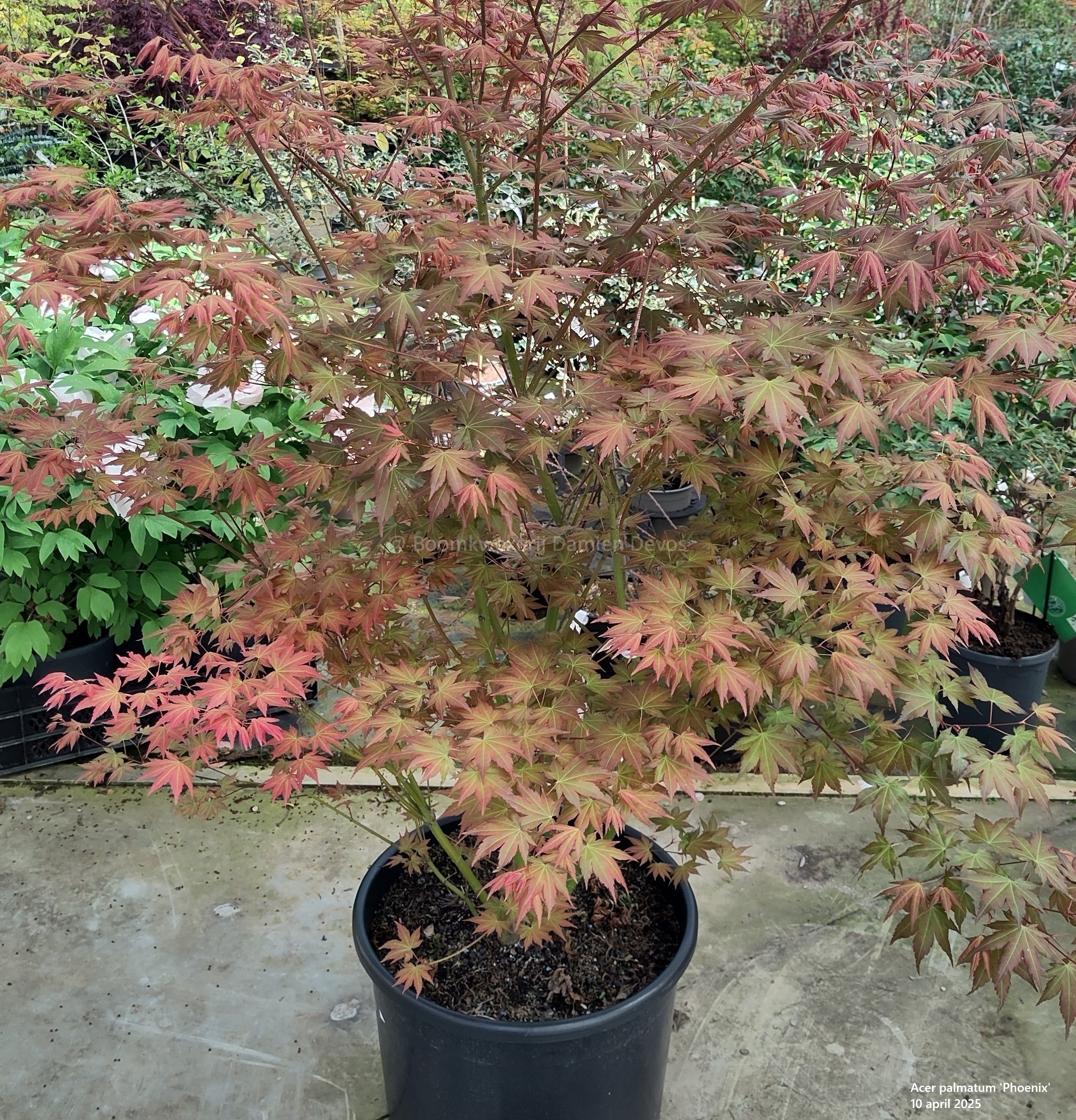 De Acer palmatum ‘Phoenix’ is een middelgrote, bladverliezende Japanse esdoorn. Deze variëteit staat bekend om zijn spectaculaire blad dat door de seizoenen heen van kleur verandert: in het voorjaar lichten de jonge koraalrode scheuten op in de zon om erna te verkleuren tot een frisgroen zomerblad. In de herfst kleurt het blad geel-oranje tot rood.