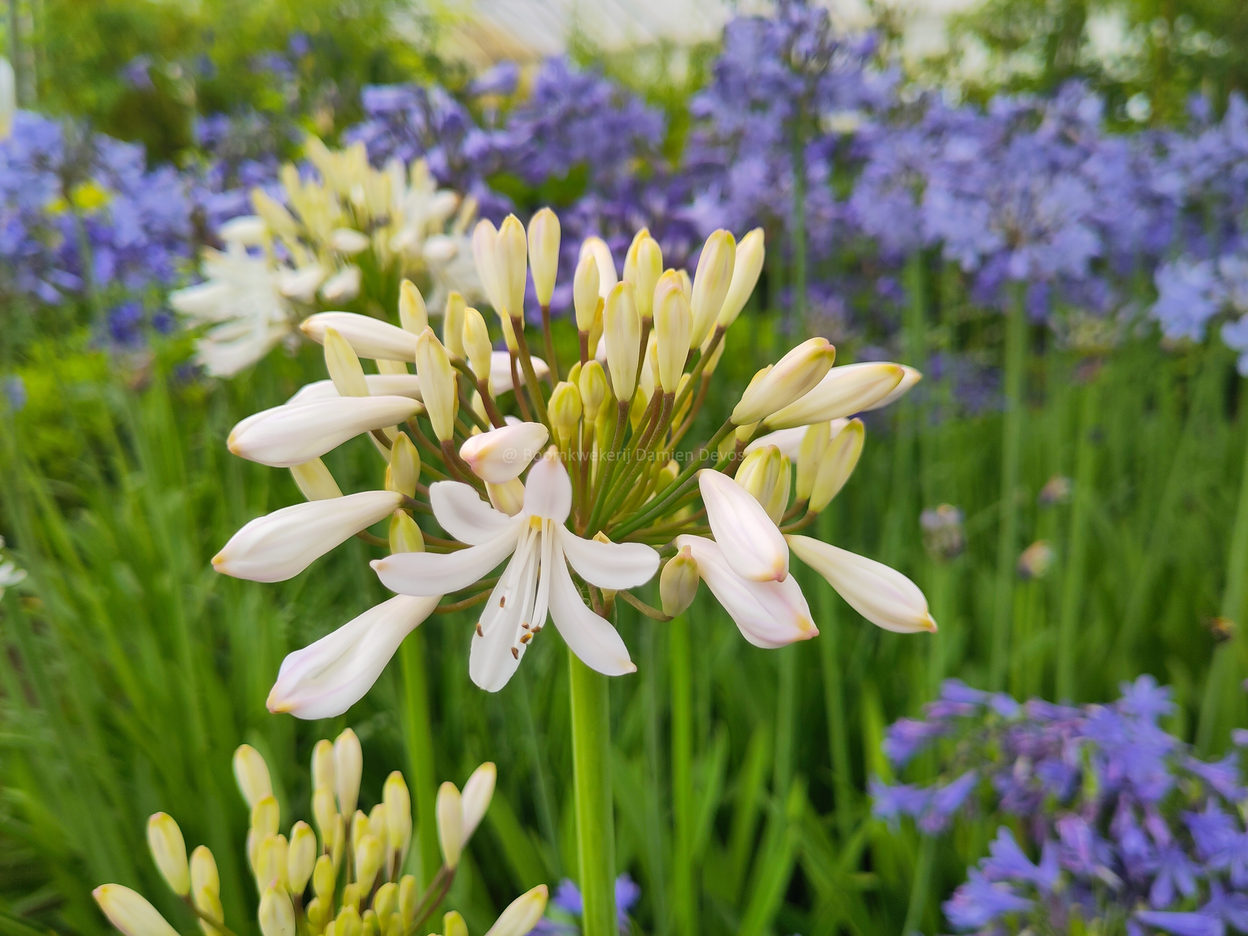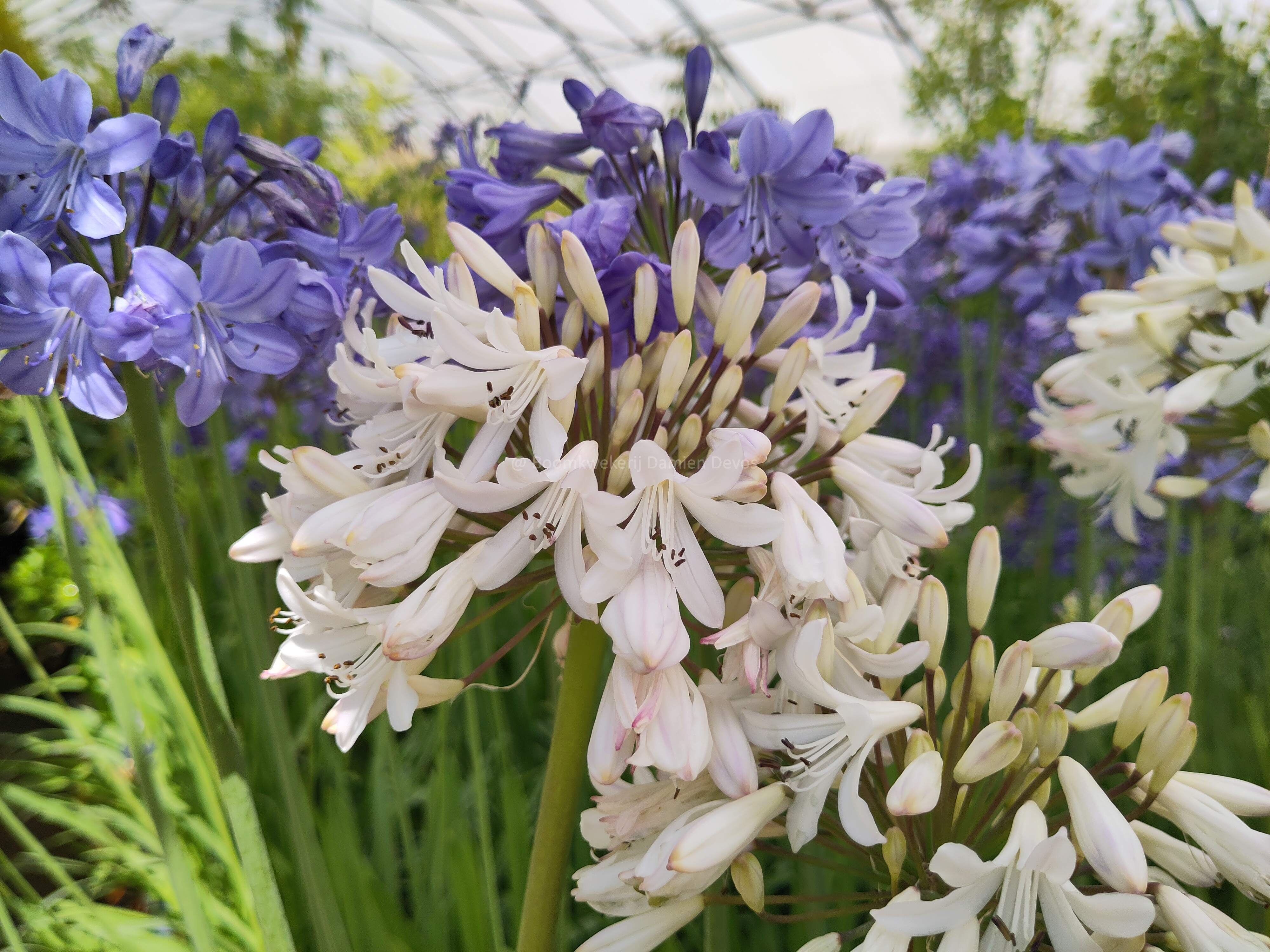 Deze Agapanthus 'Margarita' heeft prachtige witte bloemen, met een roze schijn. De bloemsteeltjes zijn donkerbruin.