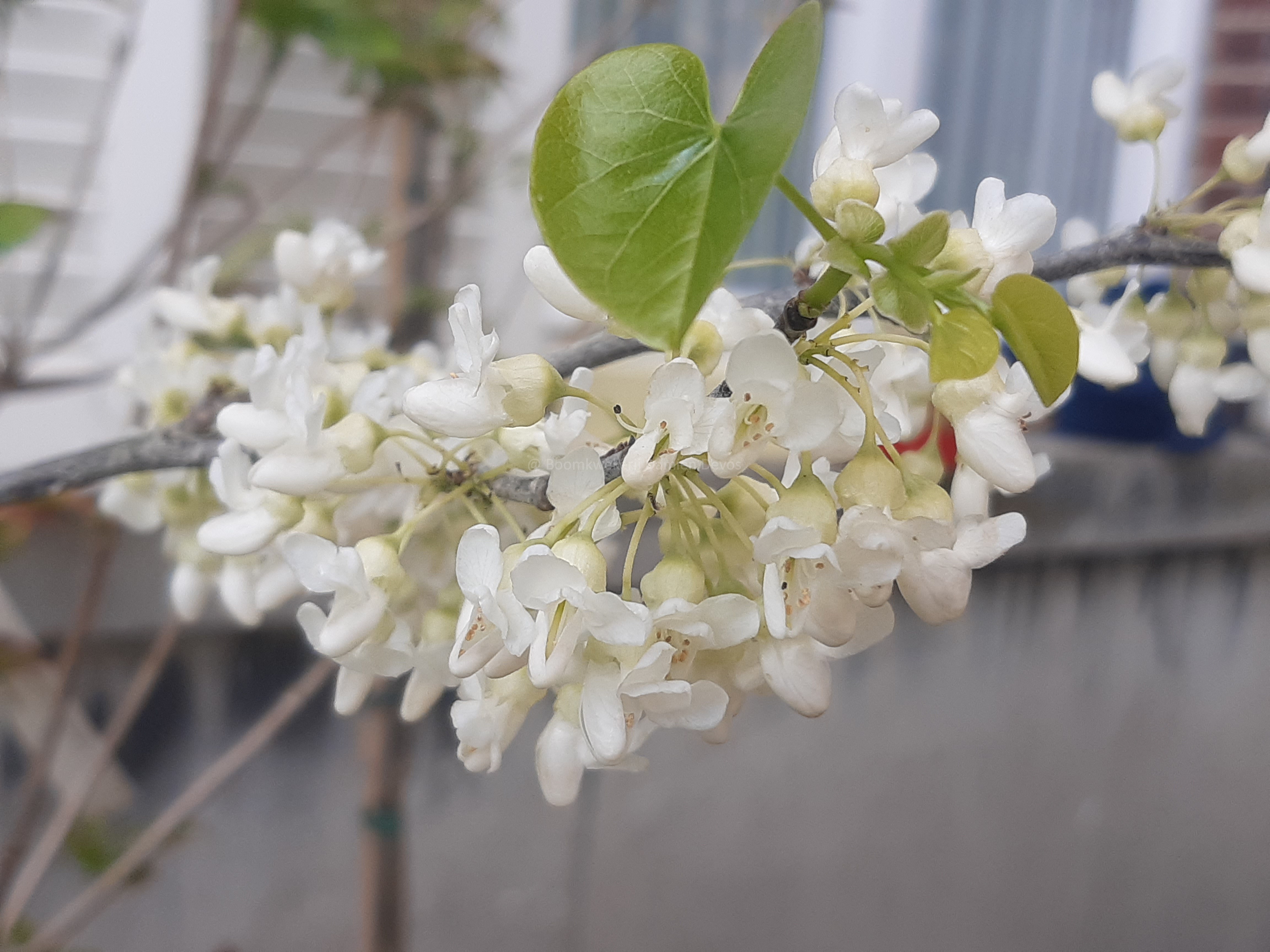 Cercis canadensis 'Texas White' bloeit in het voorjaar (april - mei) met schitterende, kleine witte bloempjes. Daarna verschijnt het mooie hartvormige blad.
