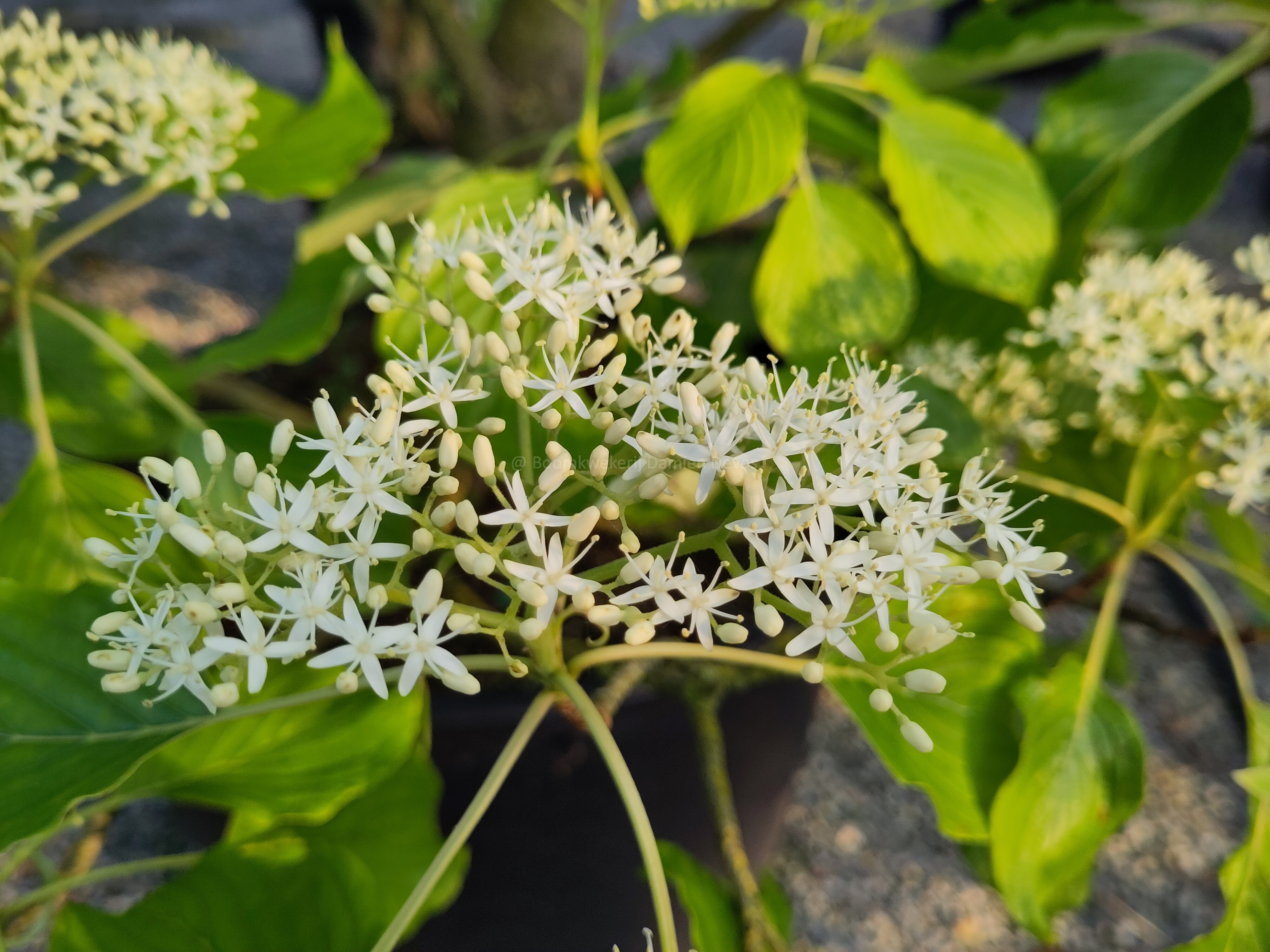 Reuzenkornoelje is een middelgrote struik dat gekenmerkt wordt door zijn groeiwijze in etages. De bladeren zijn glanzend groen en verkleuren in de herfst naar een prachtig paarsrood. Vanaf juni gaat deze soort rijkelijk bloeien met crèmewitte schermvormige tuilen. De bessen die eruit voortkomen zijn klein en donkerblauw en erg geliefd bij de vogels.
