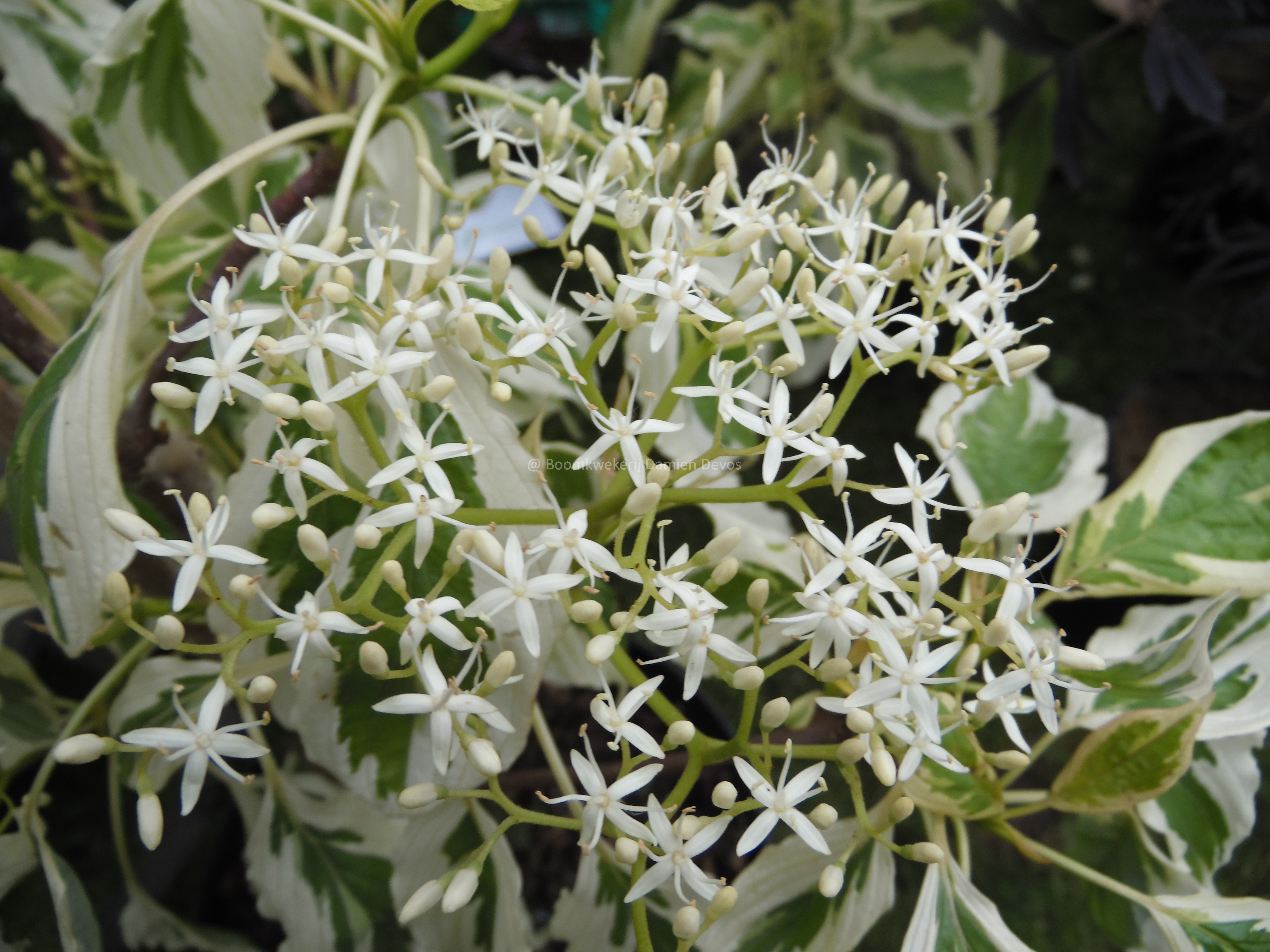 In mei verschijnen witte, stervormige bloemen op Cornus controversa 'Variegata'.