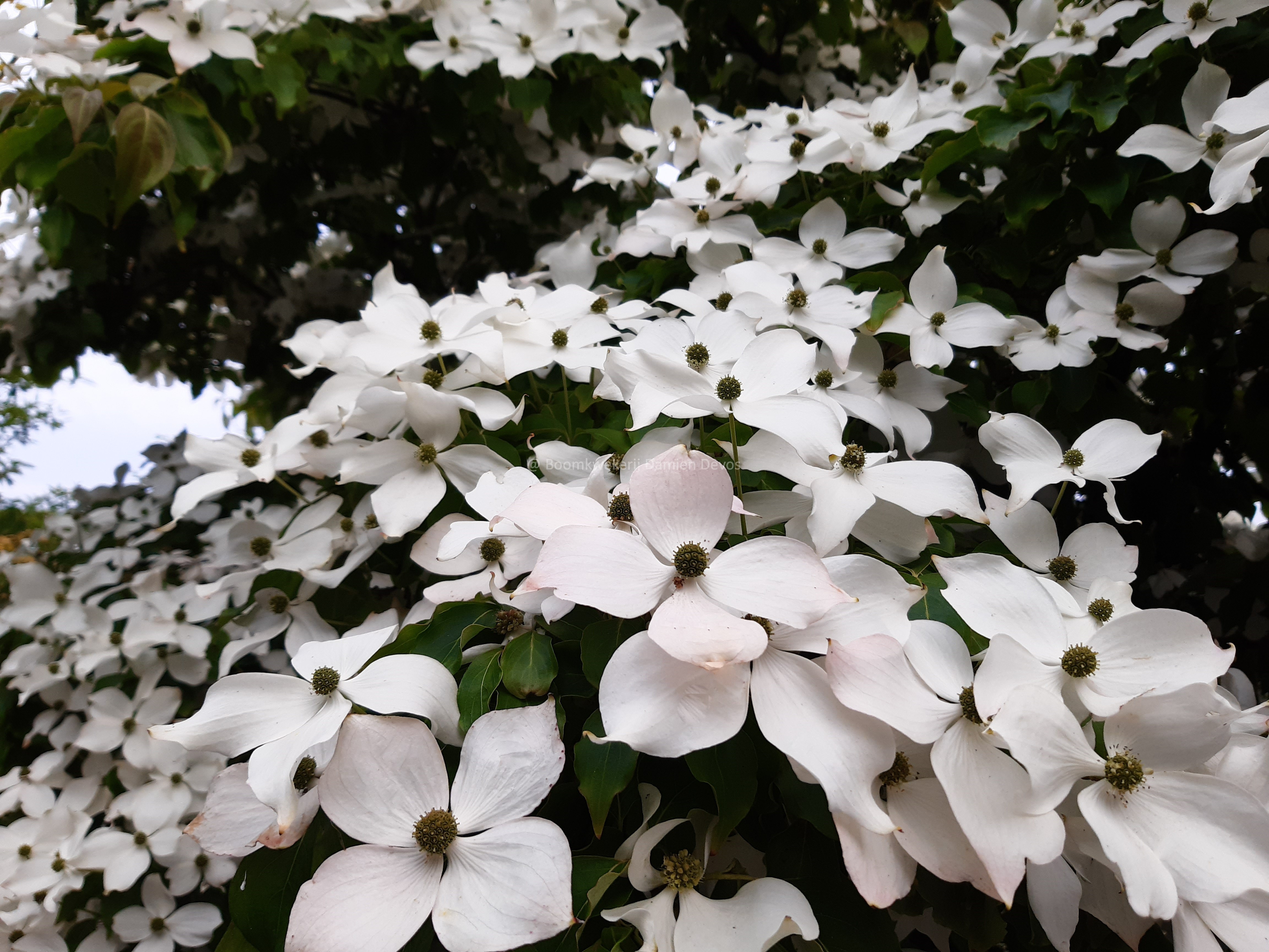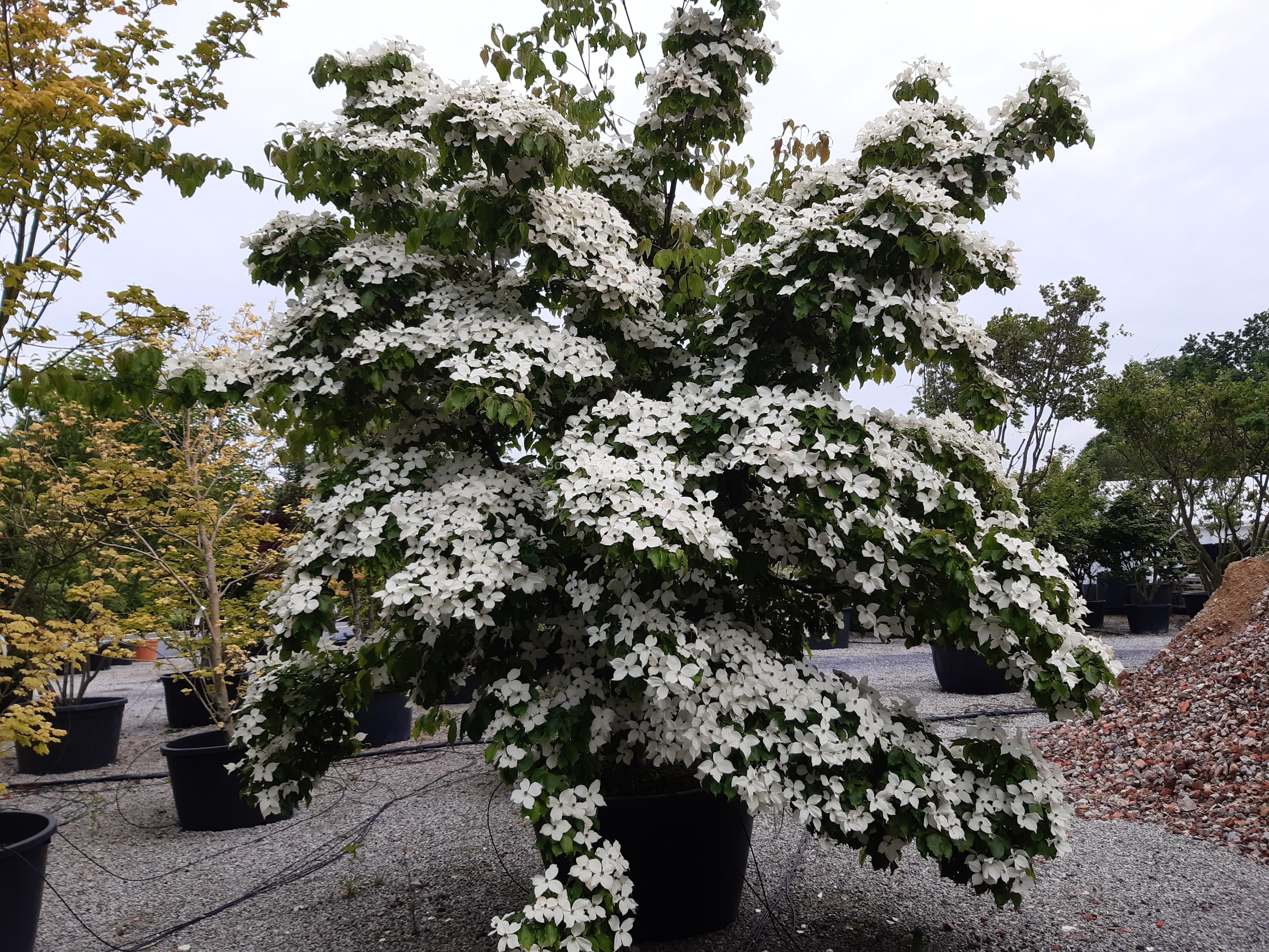 Deze meerstammige boom bloeit in mei en juni met een zee van prachtige grote witte bloemen, die op het einde van de bloei een rozige punt krijgen.