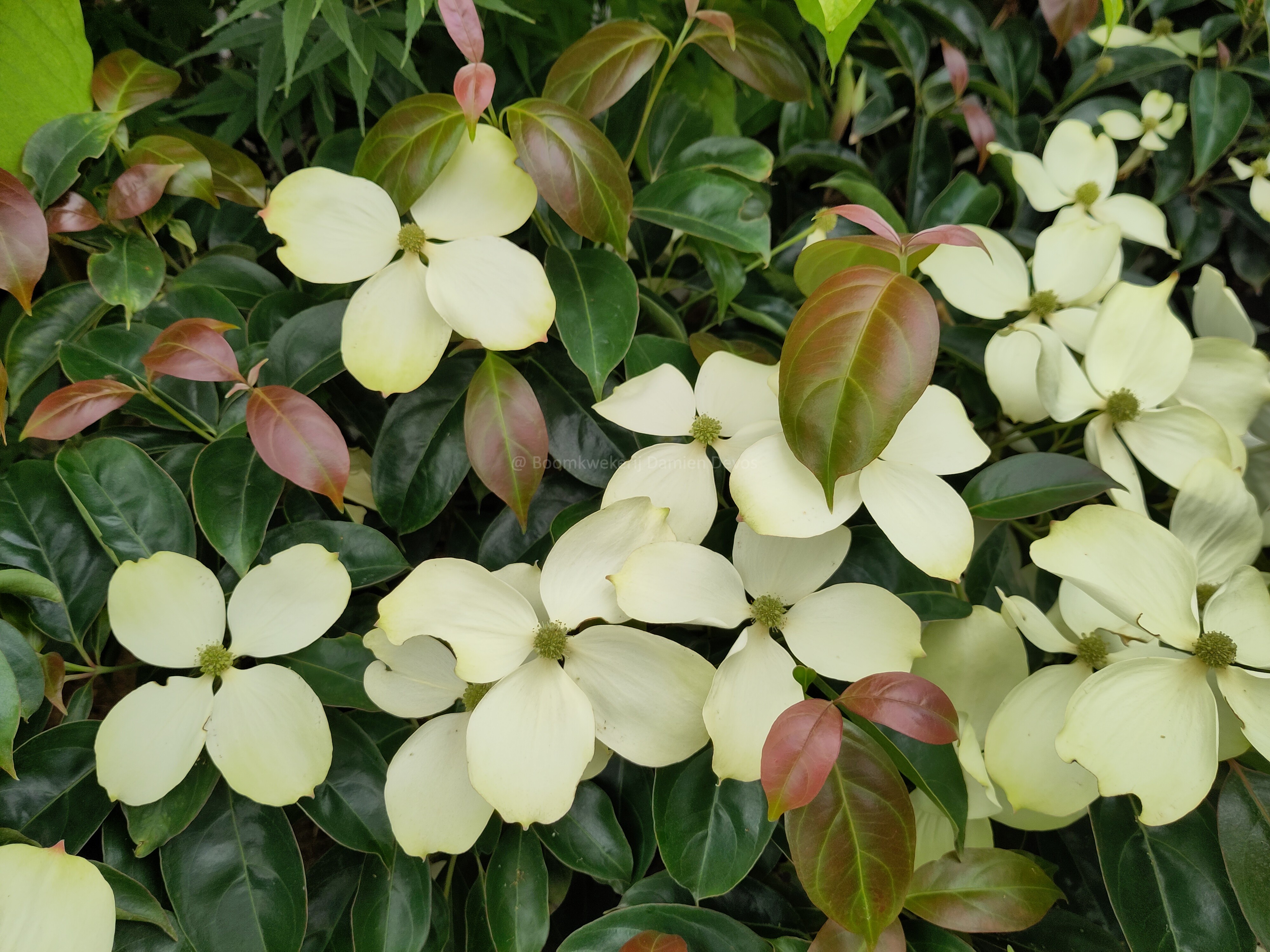 Het nieuwe blad van dit kleine boompje is bronskleurig en wordt daarna glanzend groen.