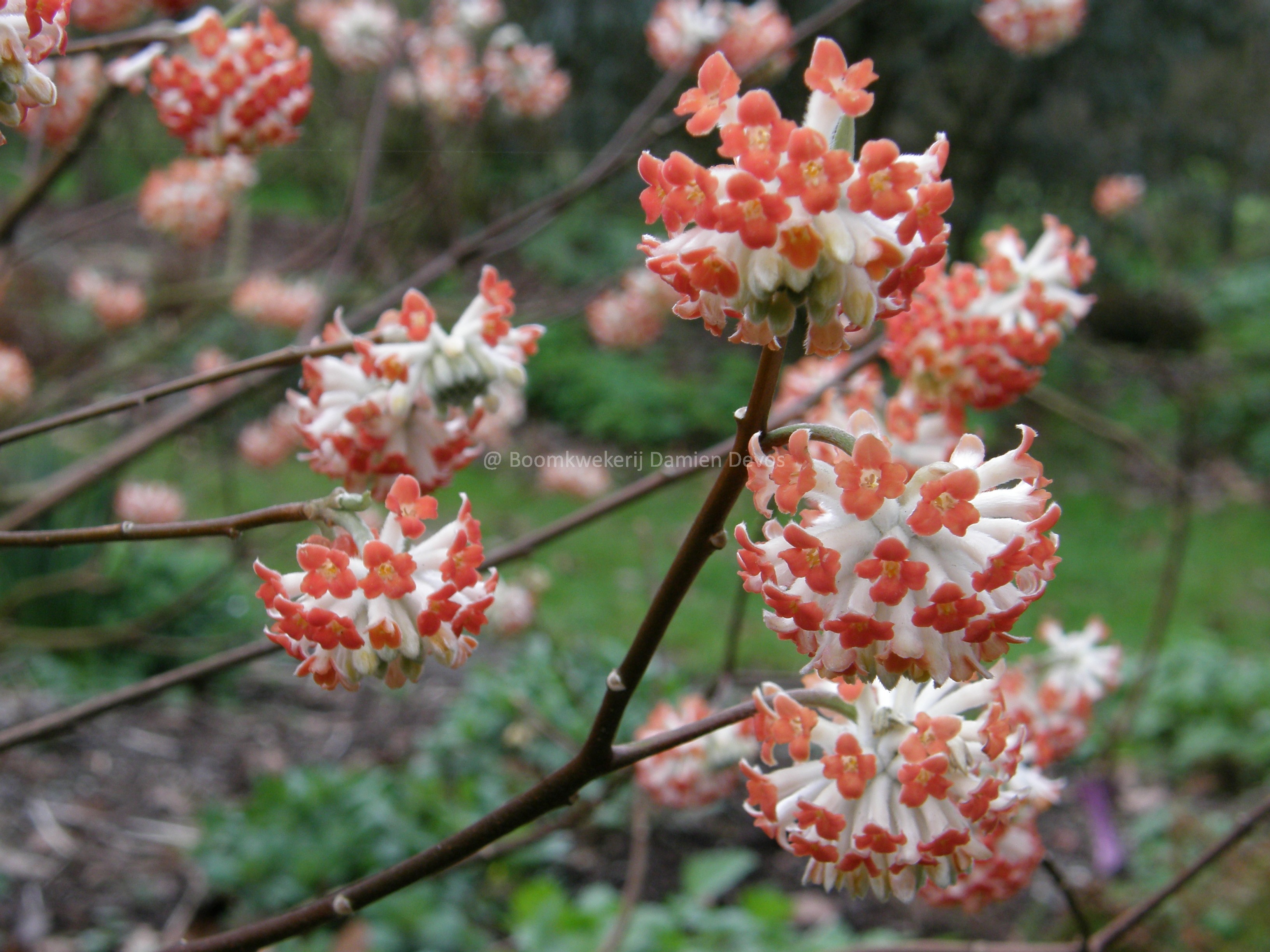 Dit is een zeldzame, roodbloeiende Edgeworthia! Deze soort Papierstruik groeit traag maar zal al rap in het voorjaar voor mooie kleuren zorgen in de tuin. Vanaf februari verschijnen er trossen bloemen aan de uiteinden van de kale takken. De buisvormige bloemen zijn wit met rode uiteinden en verspreiden een sterke geur. Uit de uitgebloeide bloemen verschijnen later de groene, purperkleurige bessen. Na de bloei komen de groene bladeren uit. Staat het liefste in de zon of half schaduw en verkiest een goed gedraineerde bodem. De plant is matig winterhard.