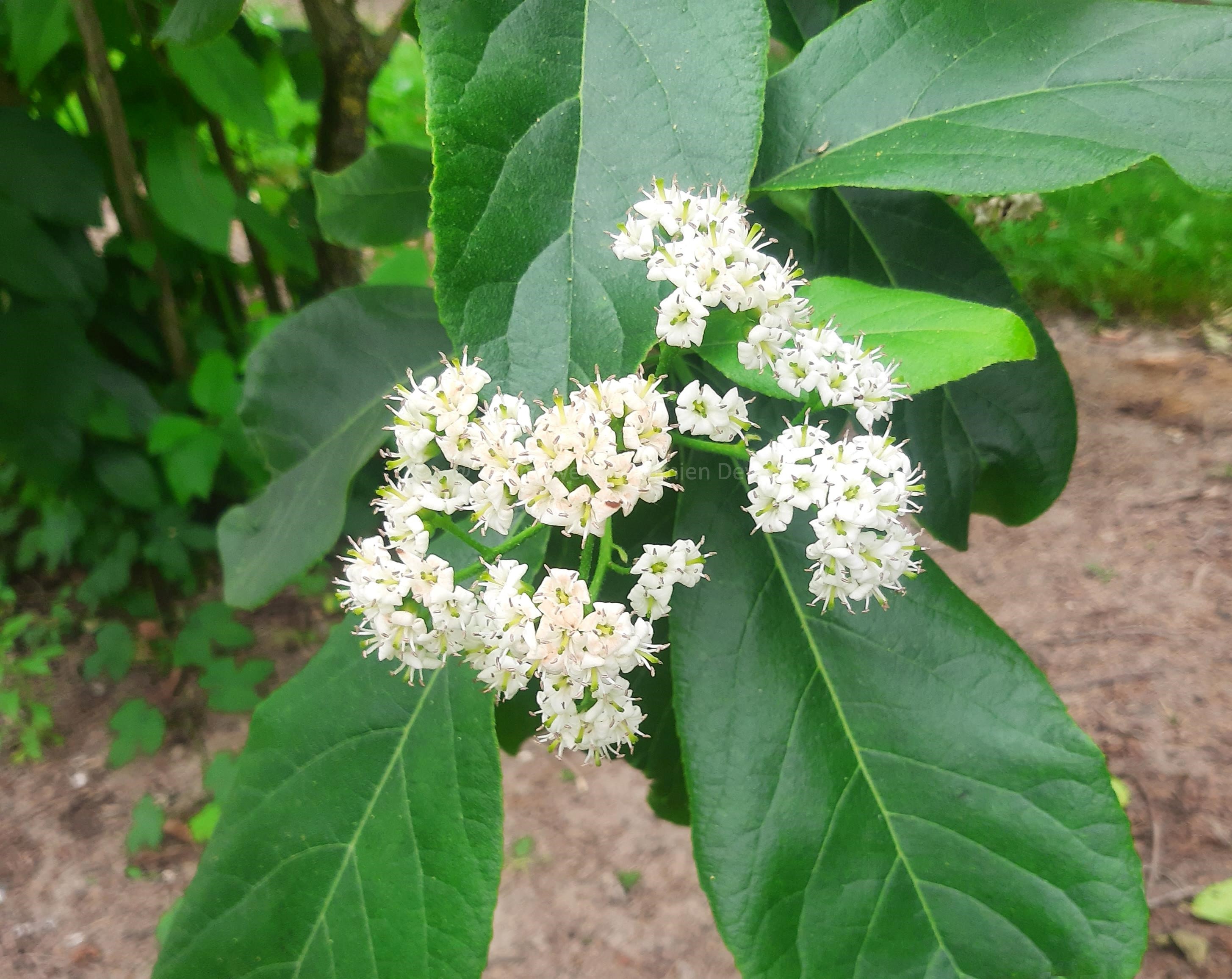 In de zomer verschijnen witte, lichtgeurende blomen.