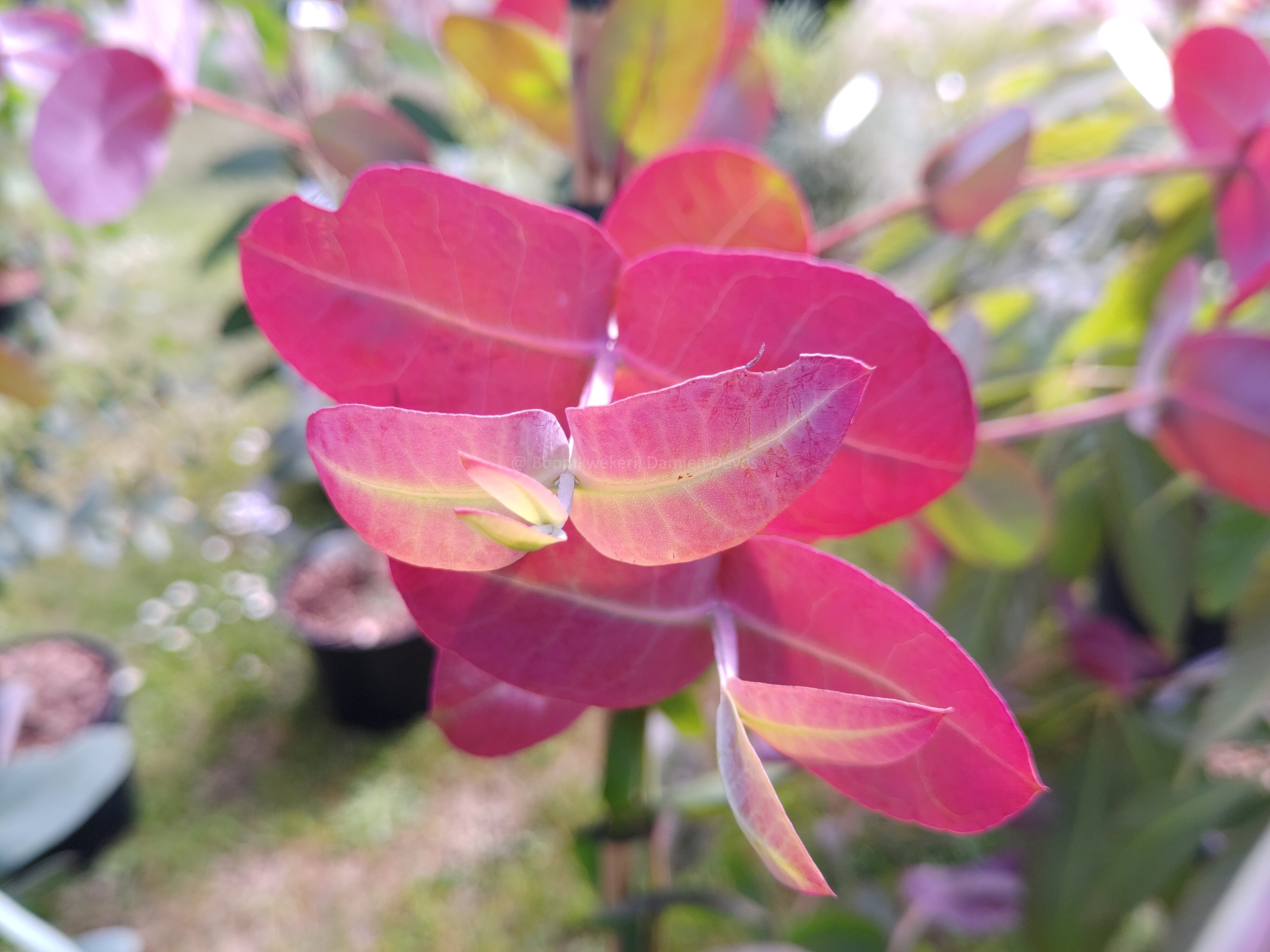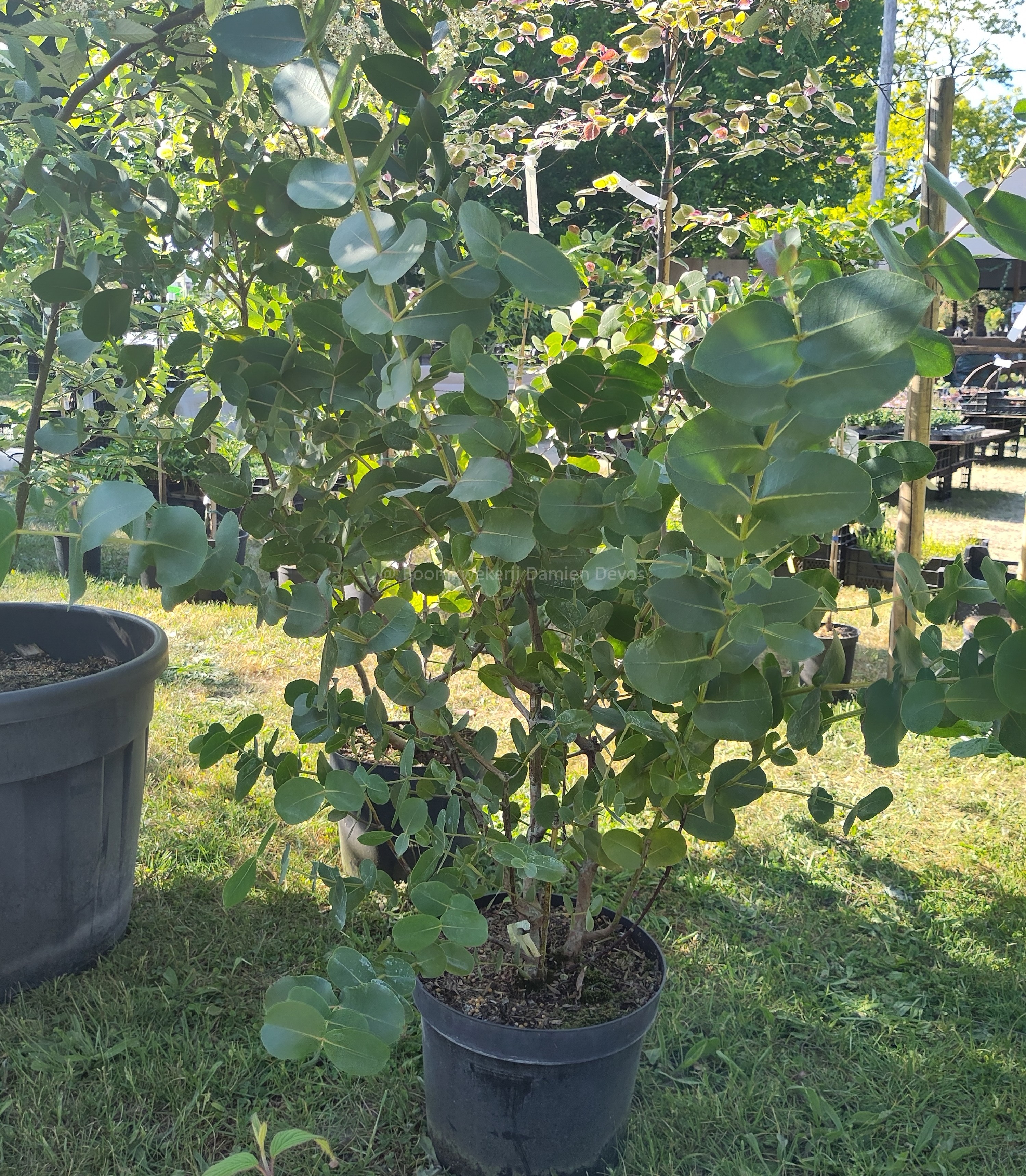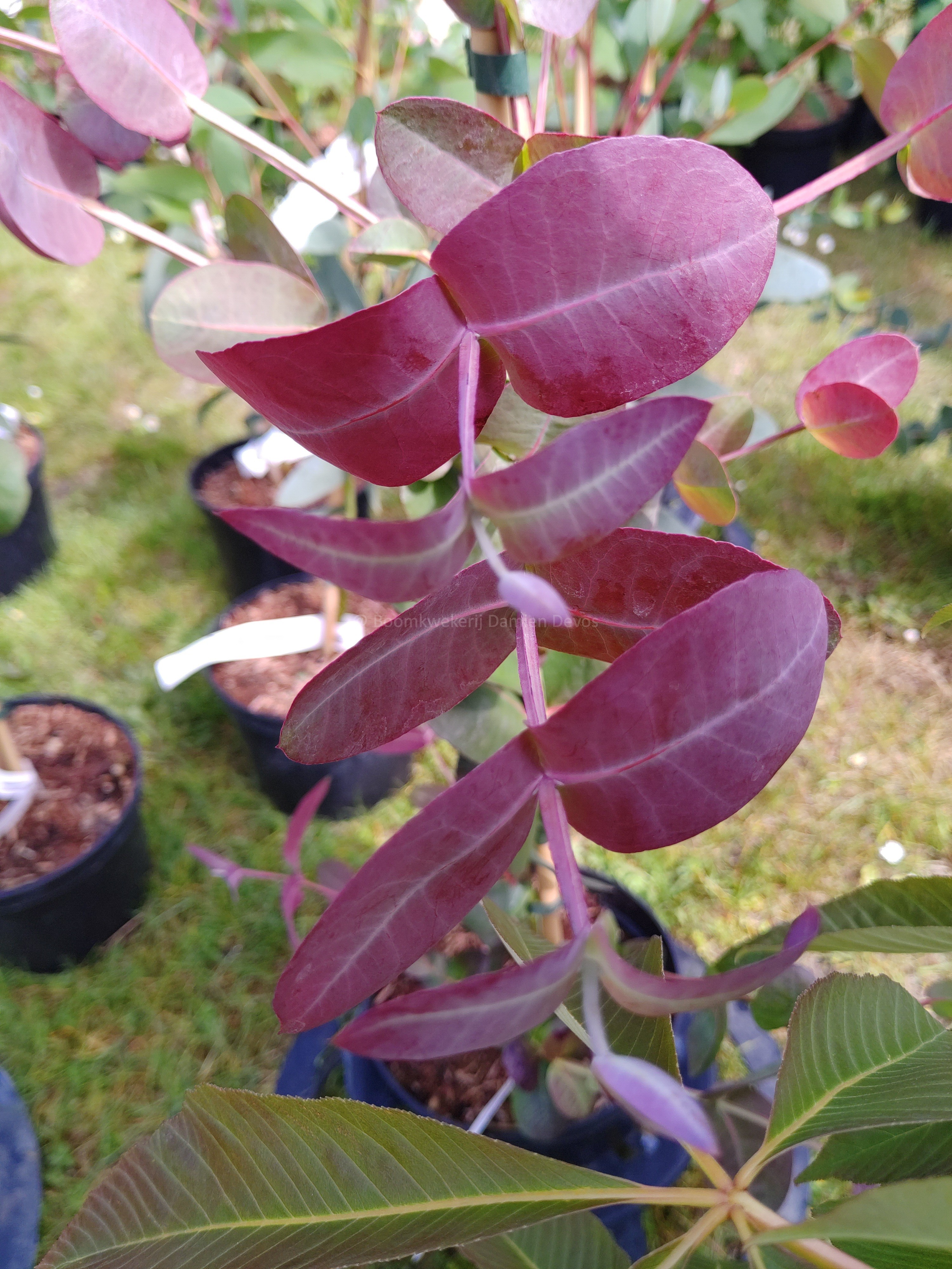 Eucalyptus neglecta heeft grote, ronde, grijsgroene bladeren die zeer aromatisch zijn. Het jong schot van de bladeren heeft een rode tint.