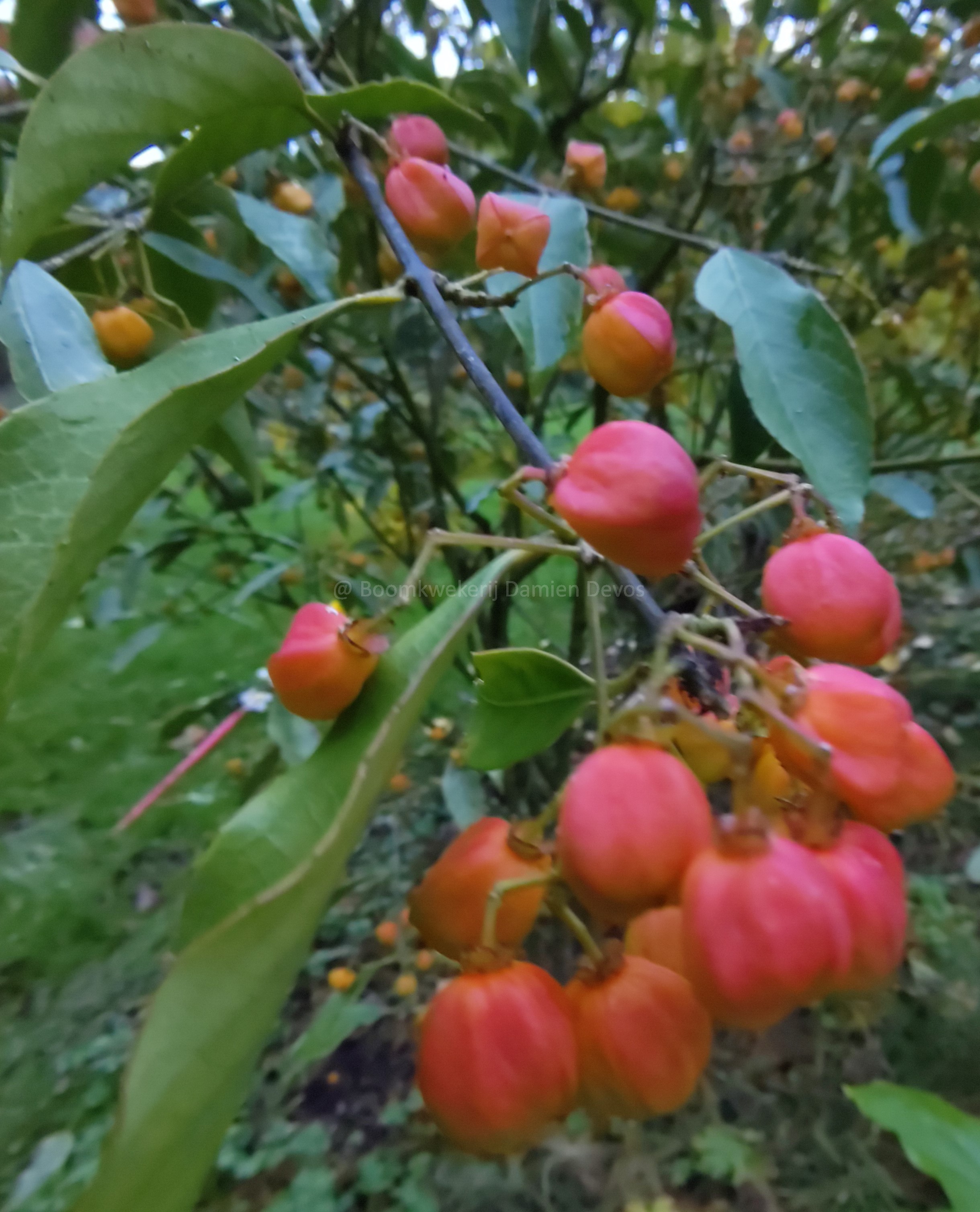 Euonymus myrianthus is een zeldzame groenblijvende sierheester die in mei-juni bloeit met geelgroene bloemen. In de herfst draagt deze struik zeer decoratieve oranjerode vruchten.
