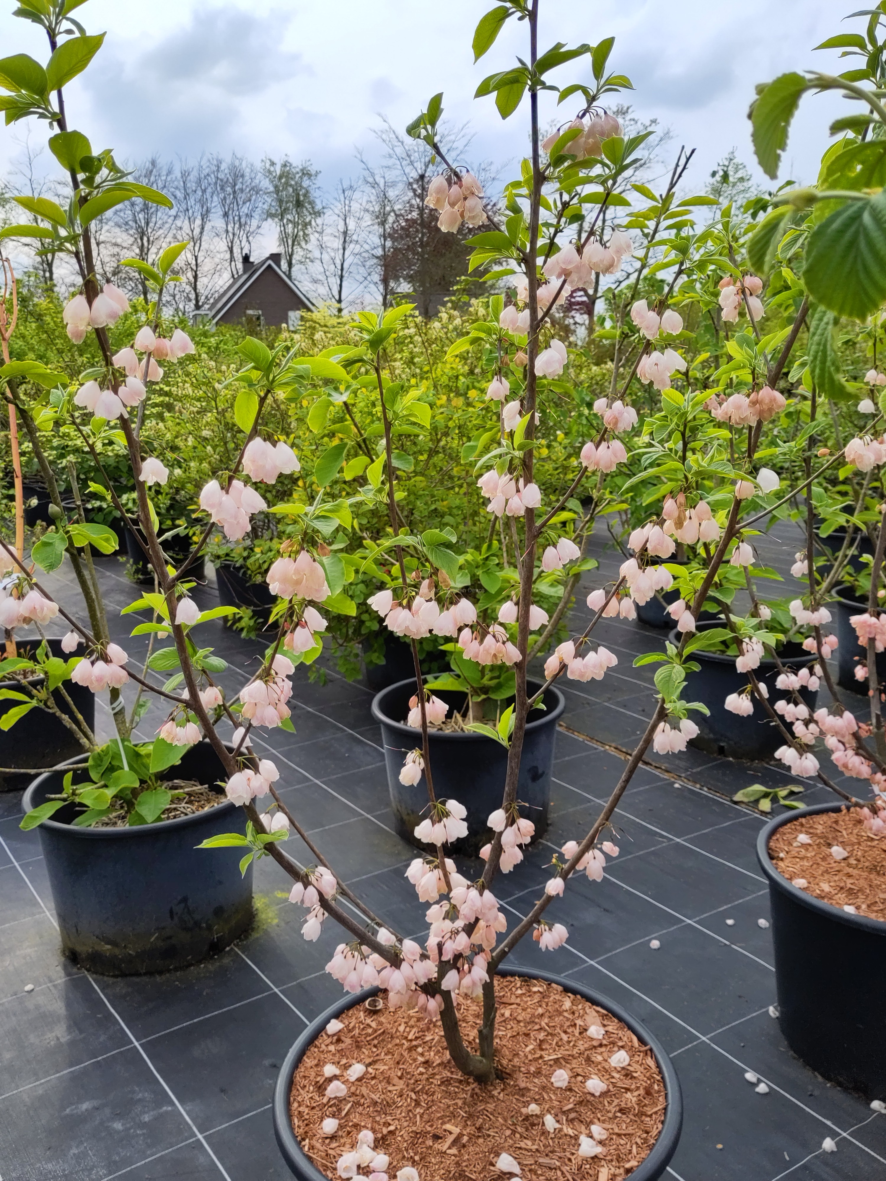 Halesia carolina 'Arnold's Pink' bloeit in april en mei met klokvormige roze bloemetjes die in trossen bij elkaar hangen.