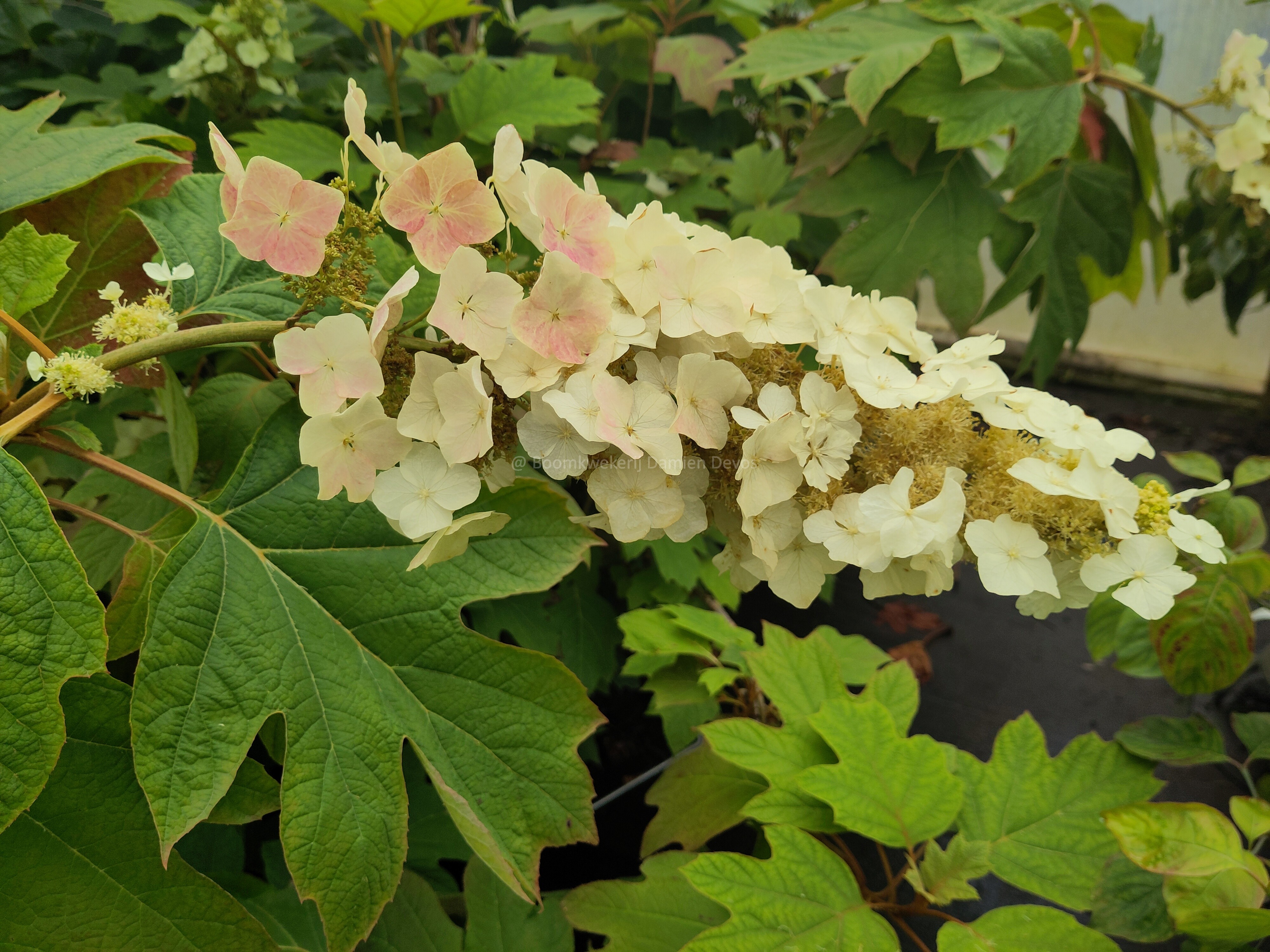 Hydrangea quercifolia 'Back Porch' is een eikenbladhortensia die in de vroege zomer bloeit met witte bloemen, die daarna rozig verkleuren.