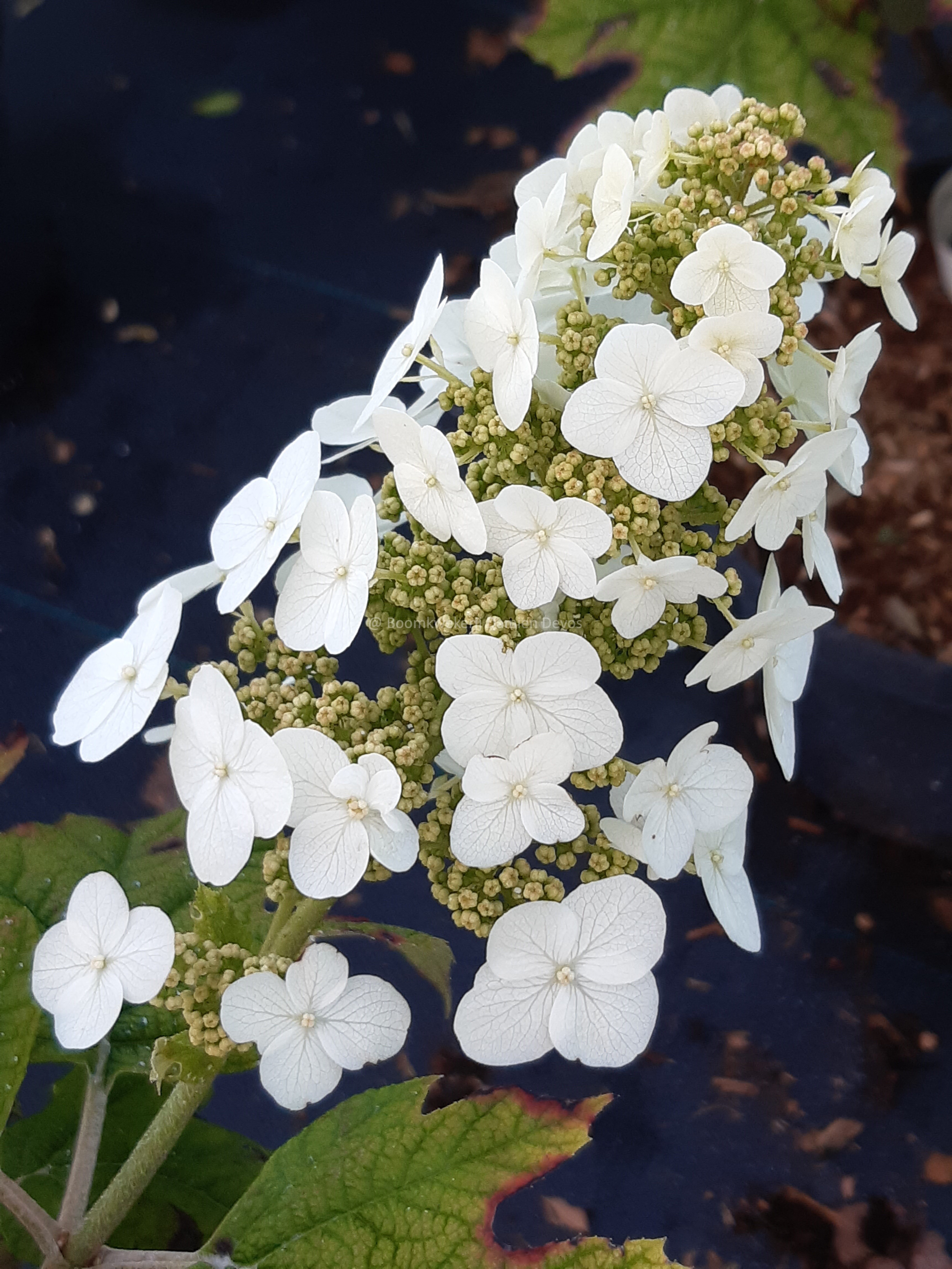 Eikenbladhortensia die in de zomer, iets later dan de andere eikenbladhortensia's, witte bloemen krijgt, die zelfs (op het einde van de bloei) naar roze gaan.