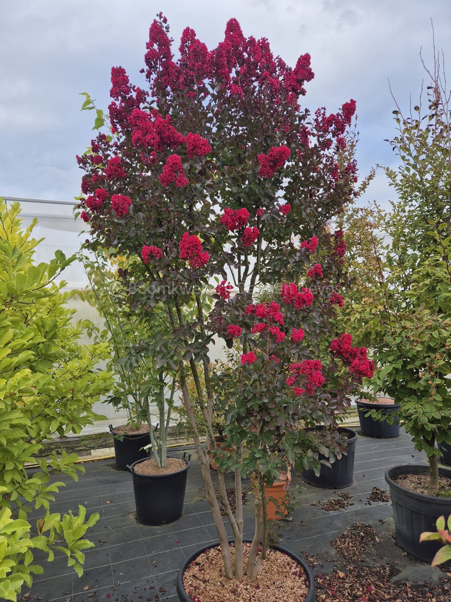 Lagerstroemia 'Dynamite' is een bijzonder mooie cultivar met bladeren die eerst rood uitlopen en vervolgens donkergroen worden.