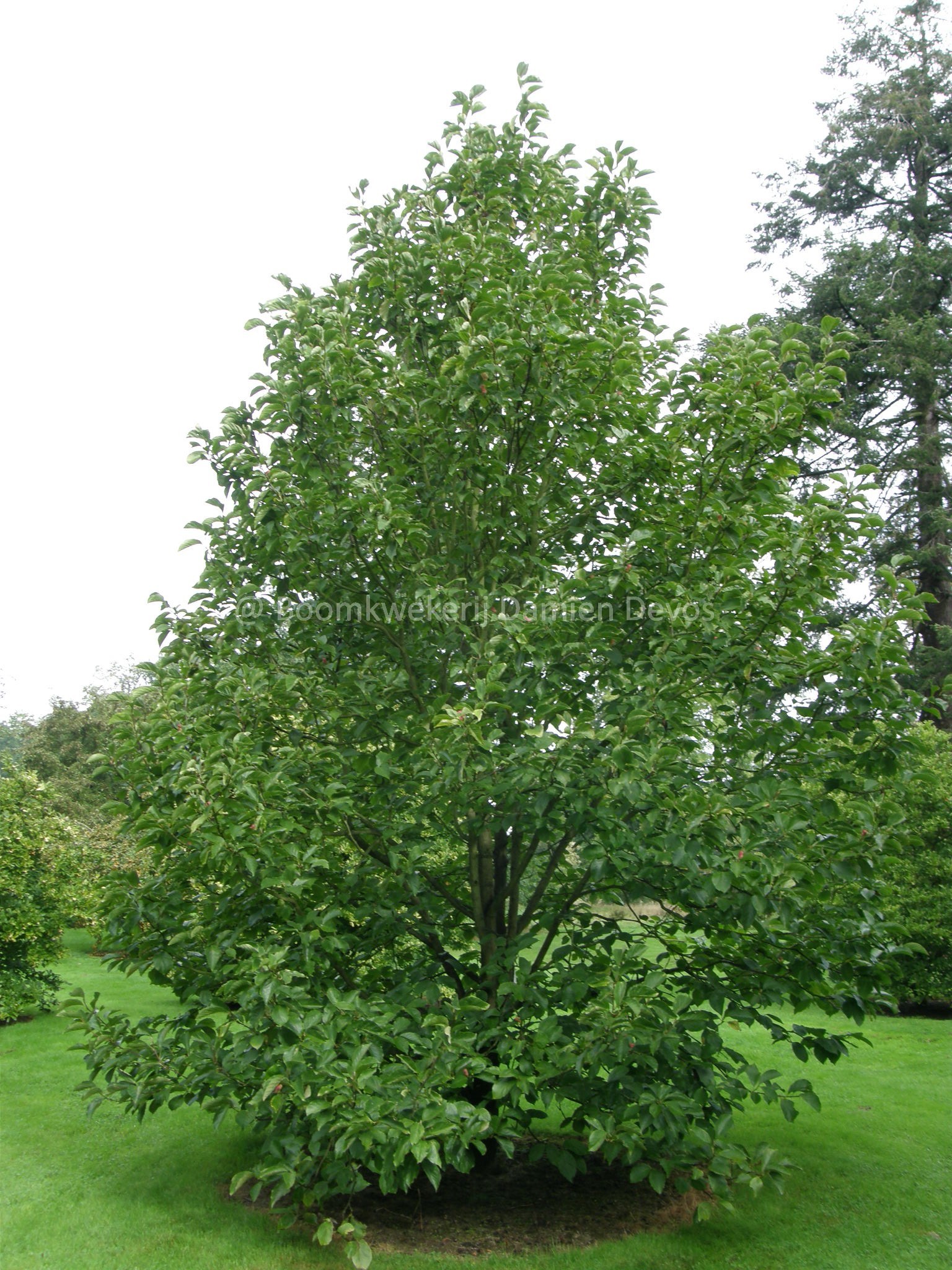 De habitus is opgaand, pyramidaal en wordt een 6-8 meter.