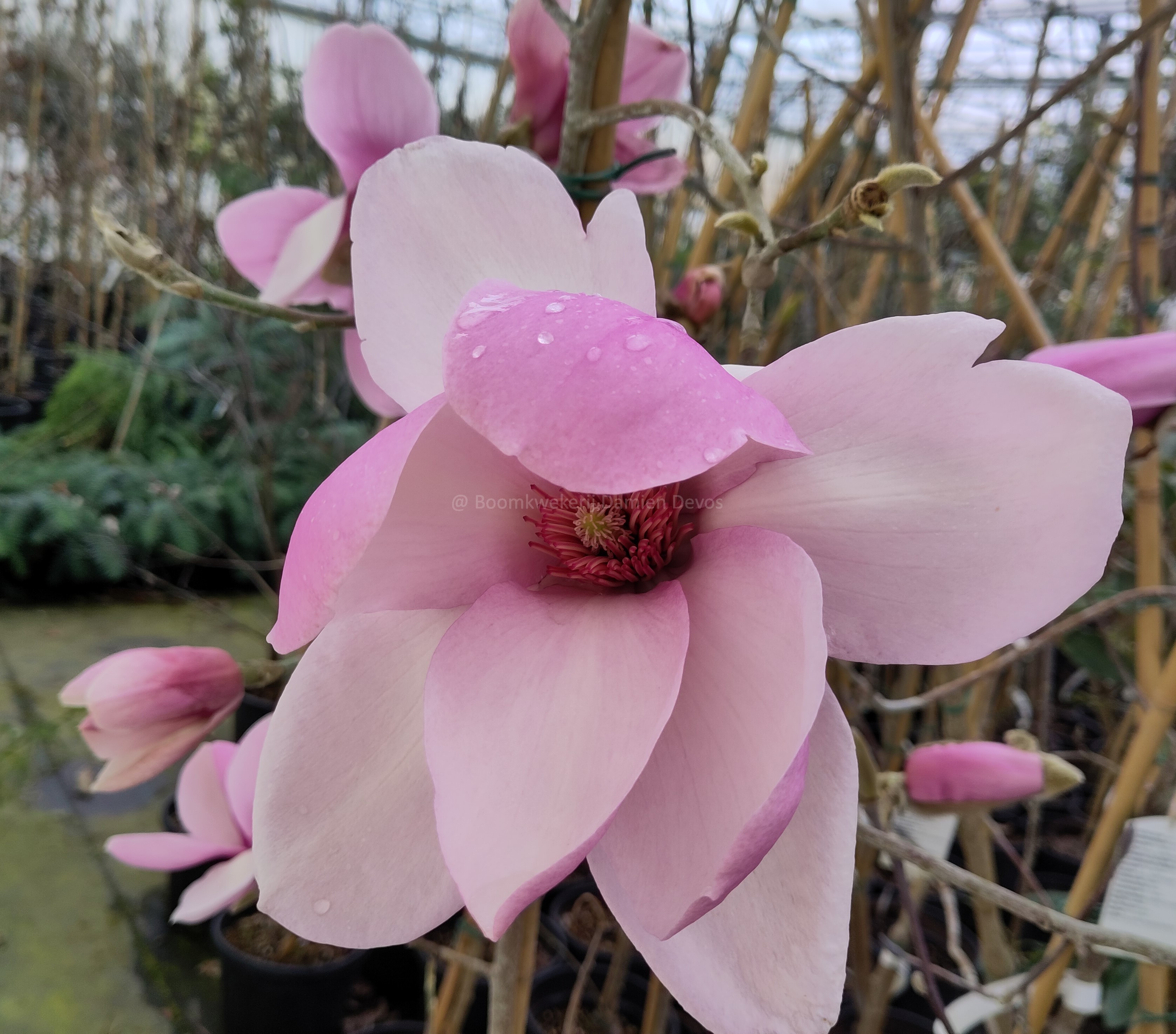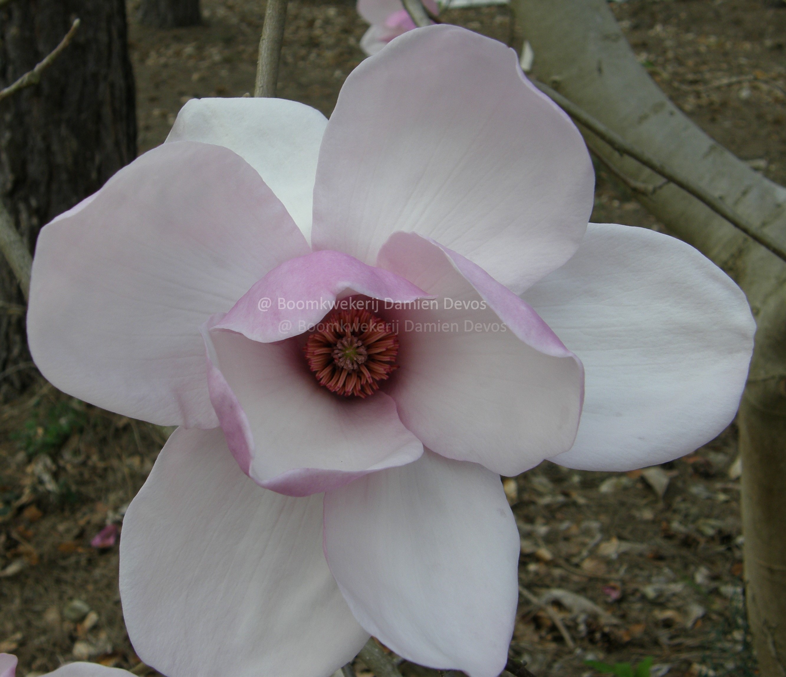 Magnolia met opvallende wit-roze bloemen. Op de buitenkant van deze bloemblaadjes is er naast de witte kleur ook een roze-paars vleugje.