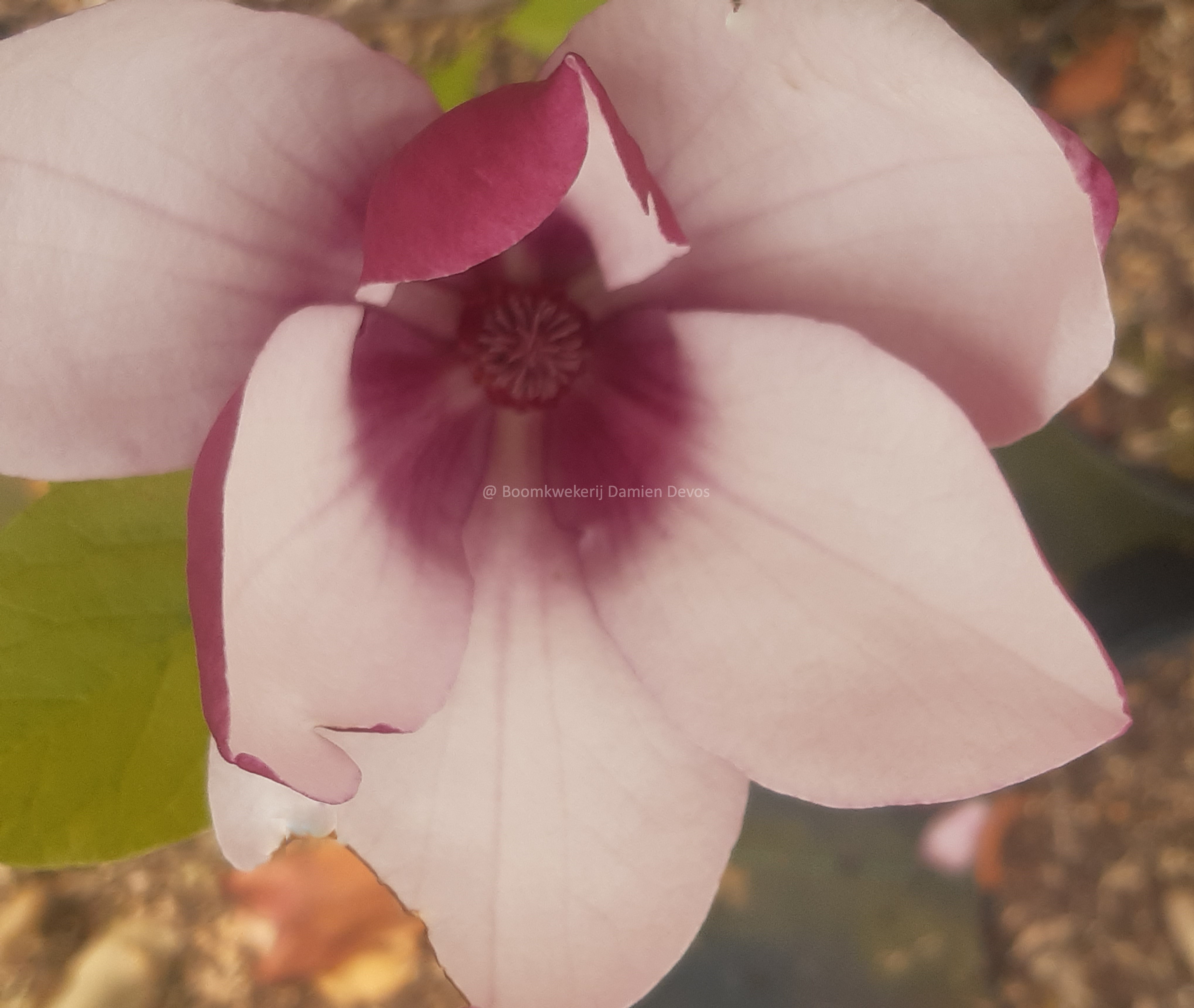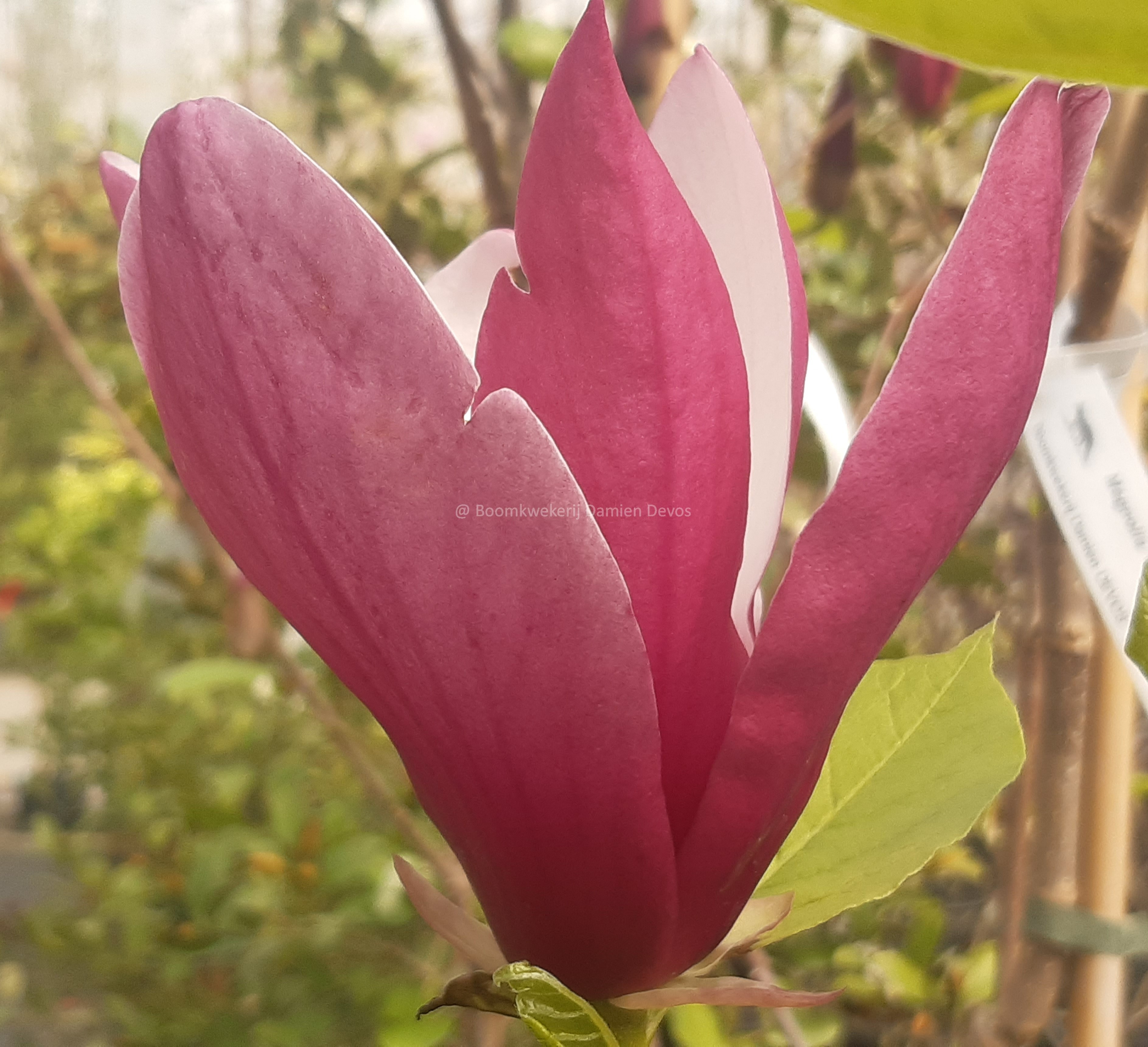 Deze prachtige Magnolia heeft grote bloemen die wijnrood aan de buitenkant, maar wit van binnen zijn.