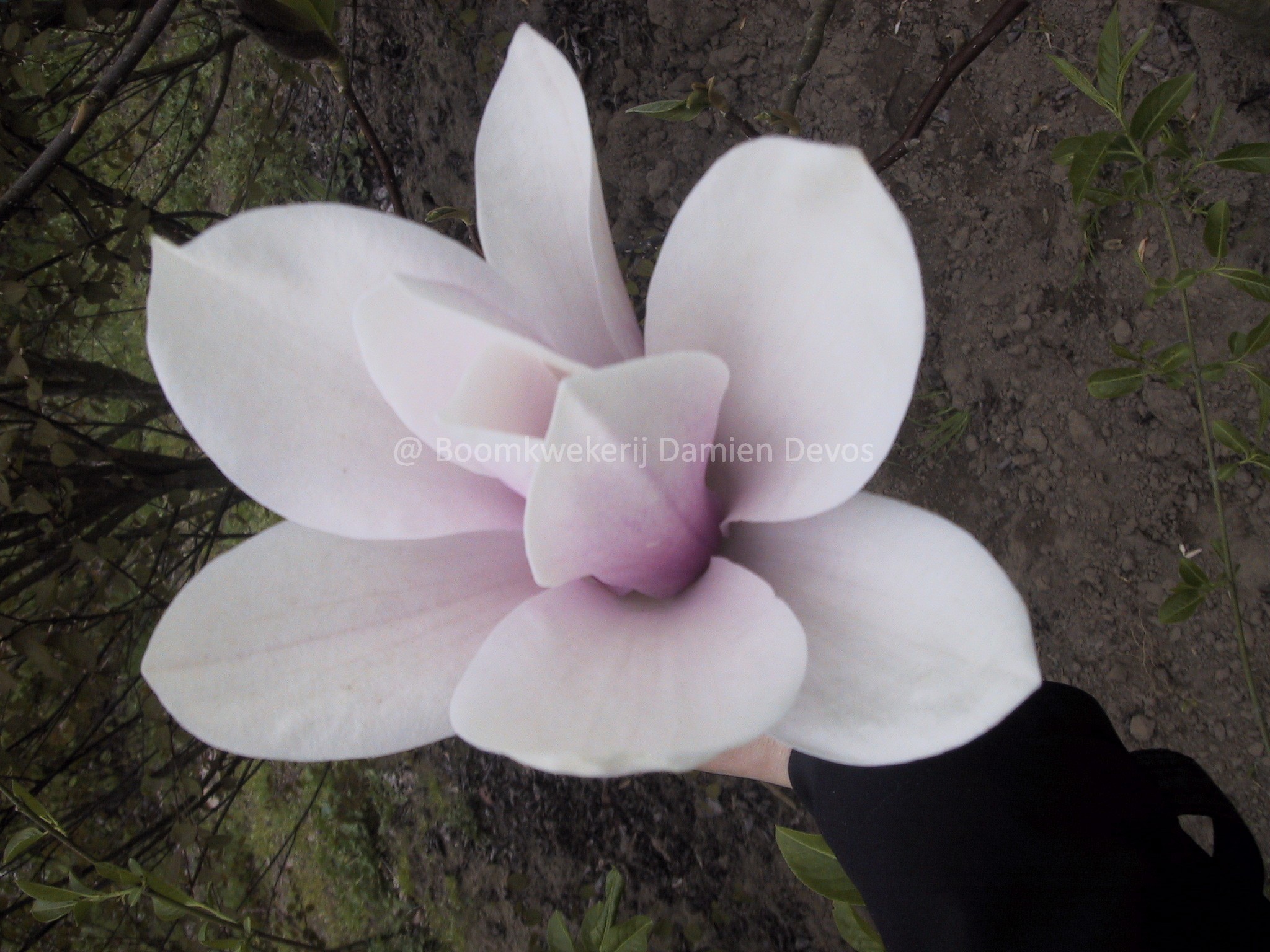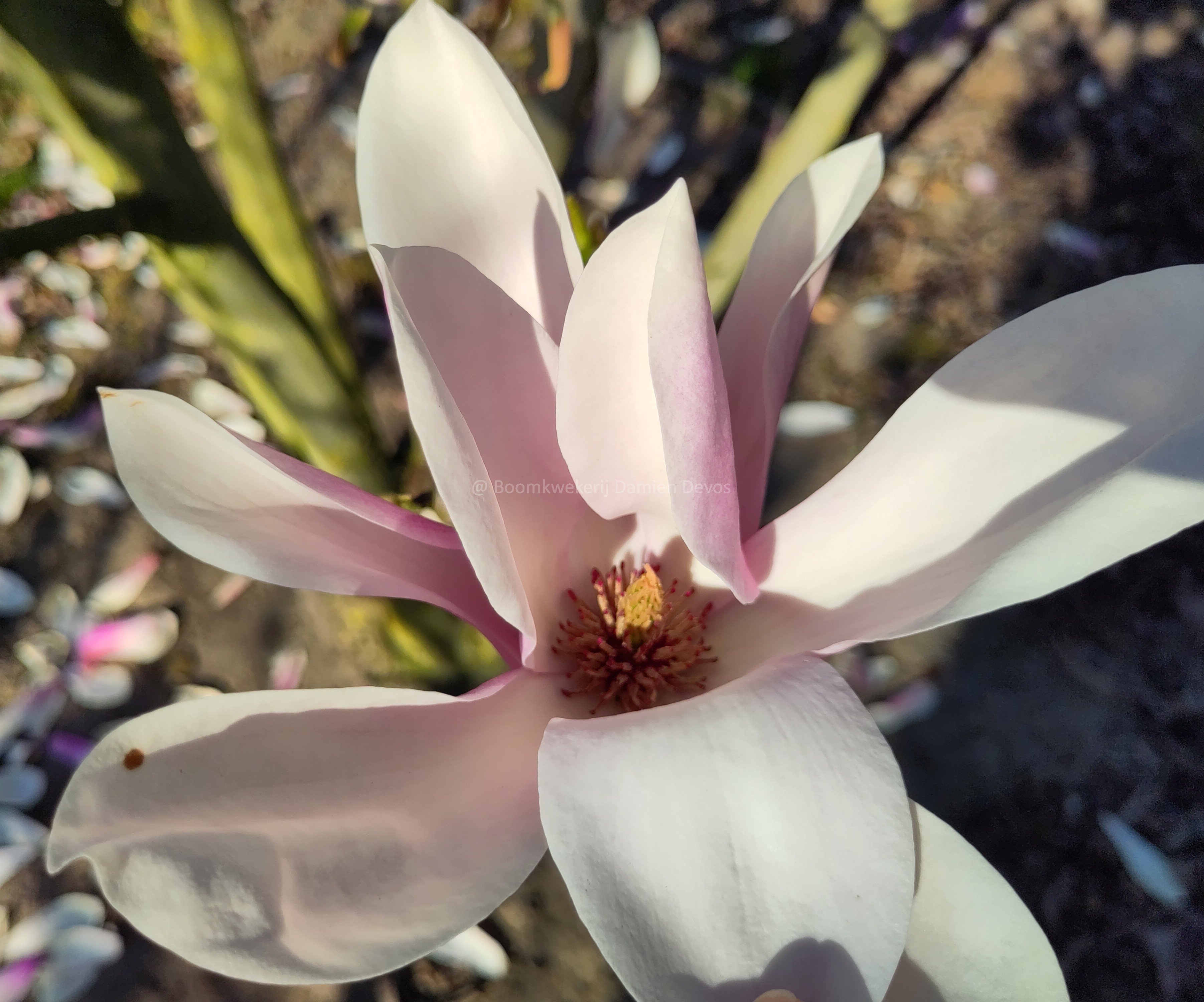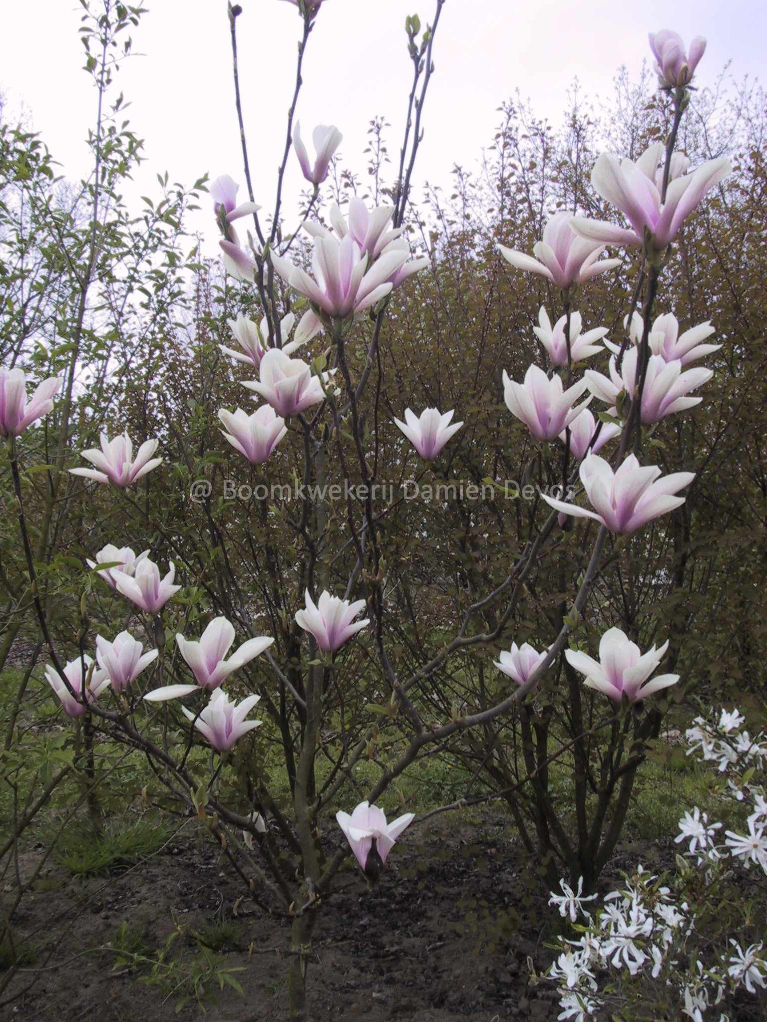 Rijk bloeiende Magnolia waarop in april prachtige, bekervormige, roze bloemen die binnenin wit zijn verschijnen in april.