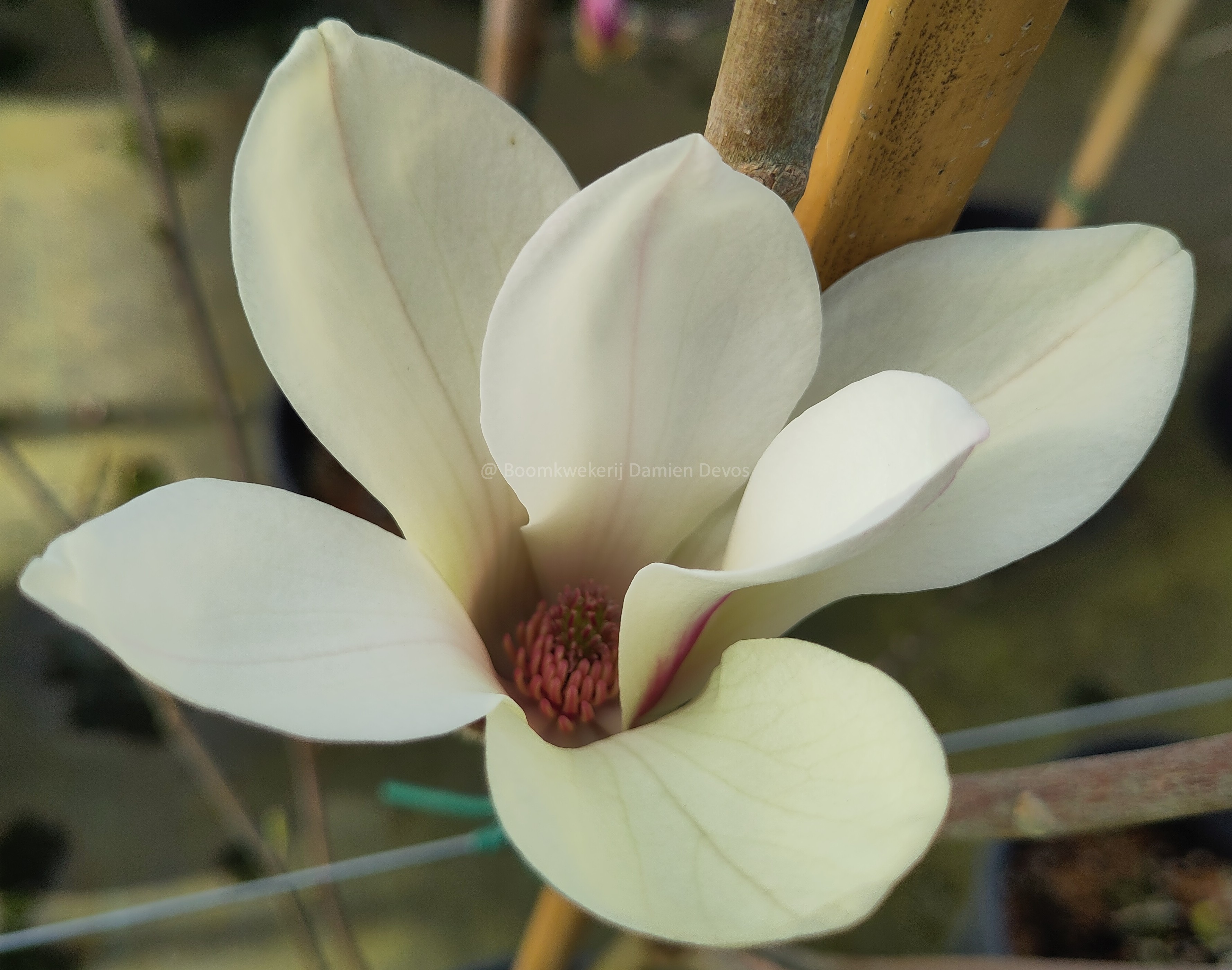 Begin april verschijnen op Magnolia 'Sunrise' ivoorkleurige à crèmekleurige, subtiel geurende bloemen met een prachtig rode vlammetje aan de buitenkant.