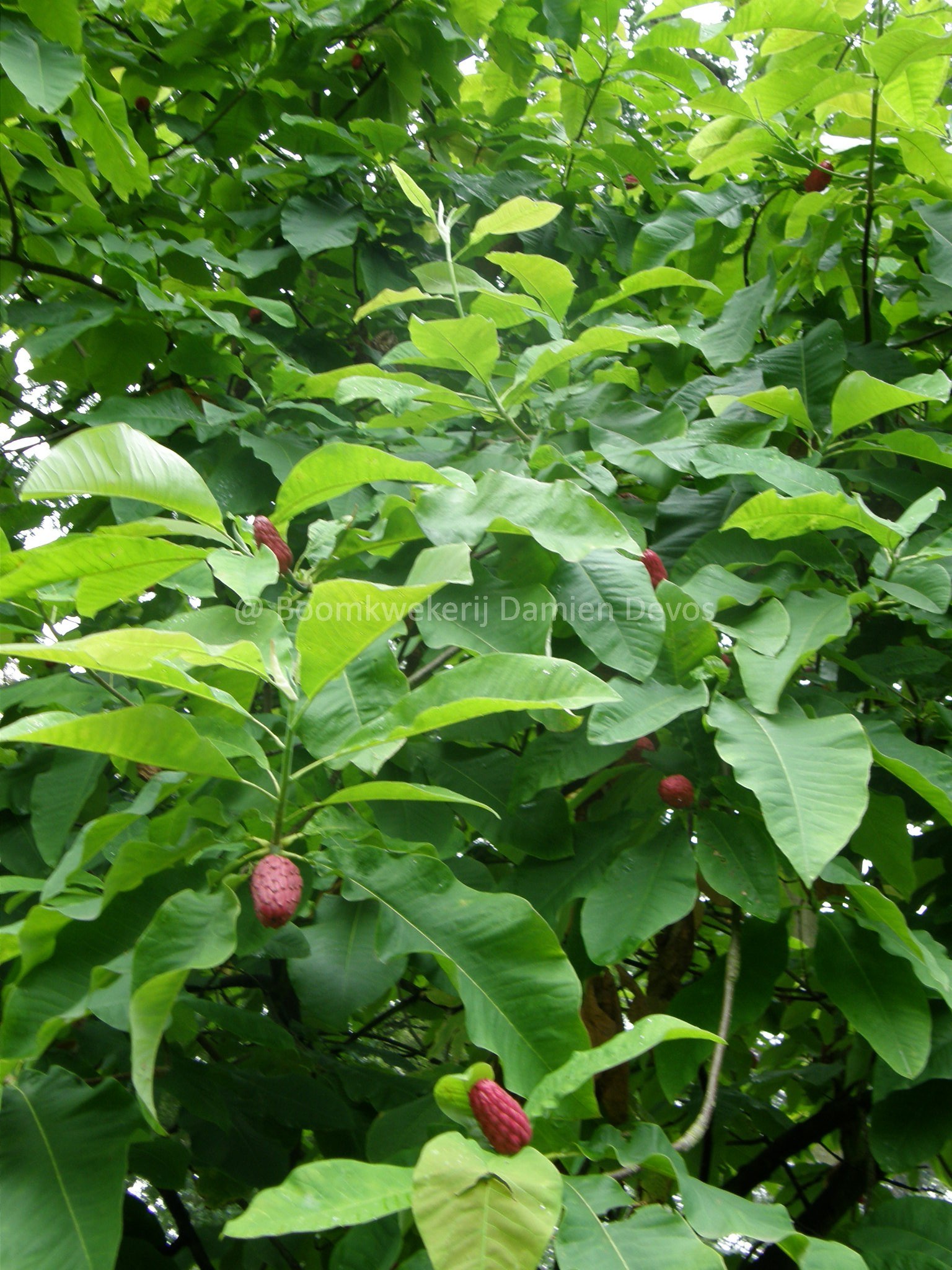 In het late voorjaar krijgt deze Magnolia witte bloemen. In de herfst verschijnen dan de rode vruchten.