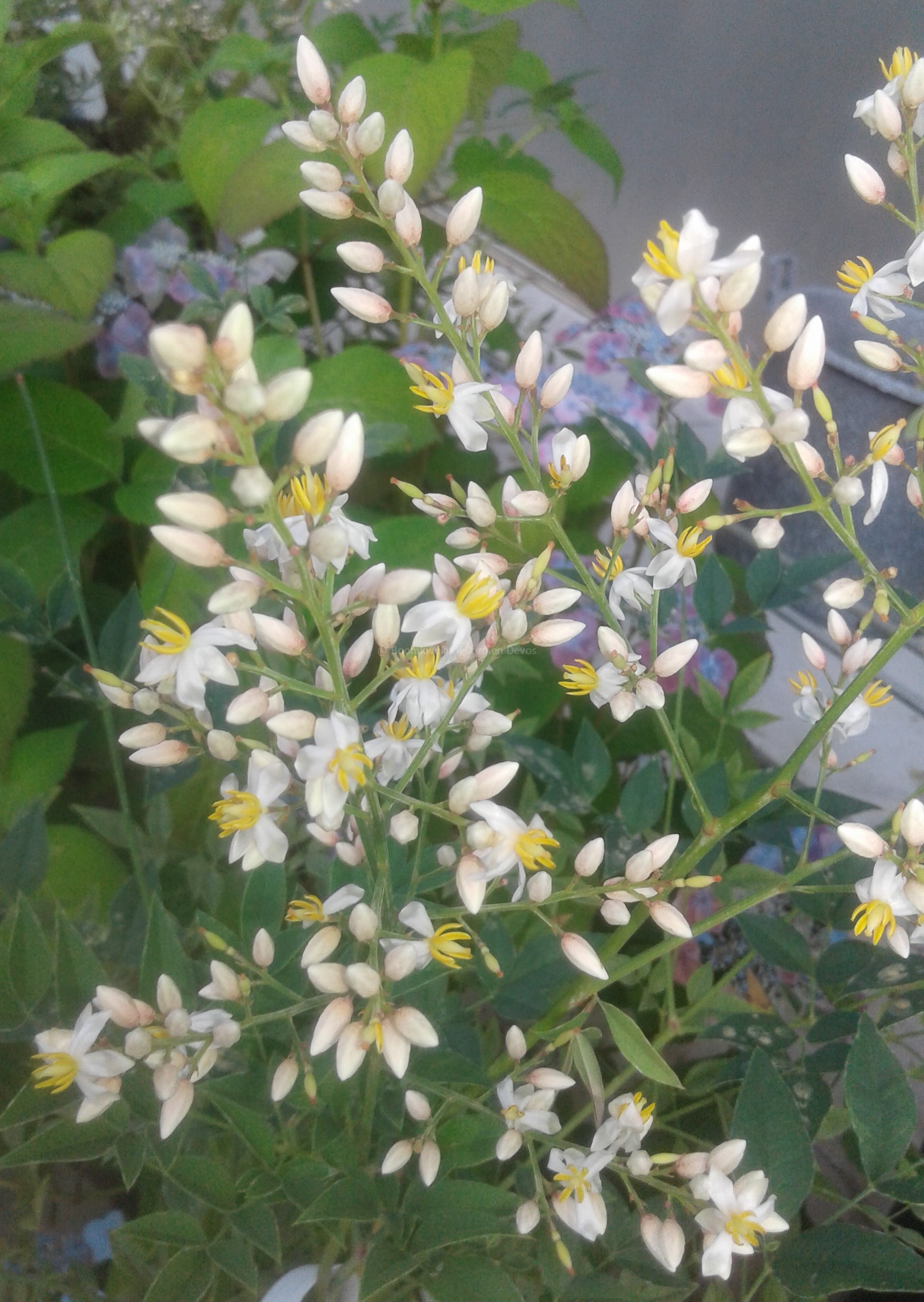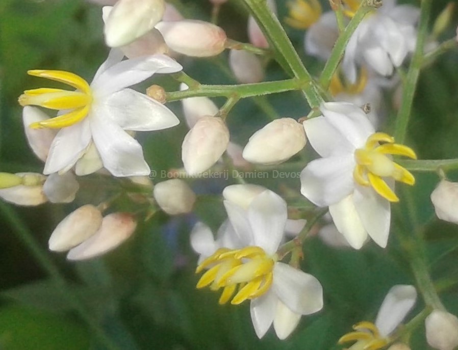 Deze plant bloeit met crèmewitte, stervormige bloemetjes aan lange trossen van mei tot juli, gevolgd door rode besjes.