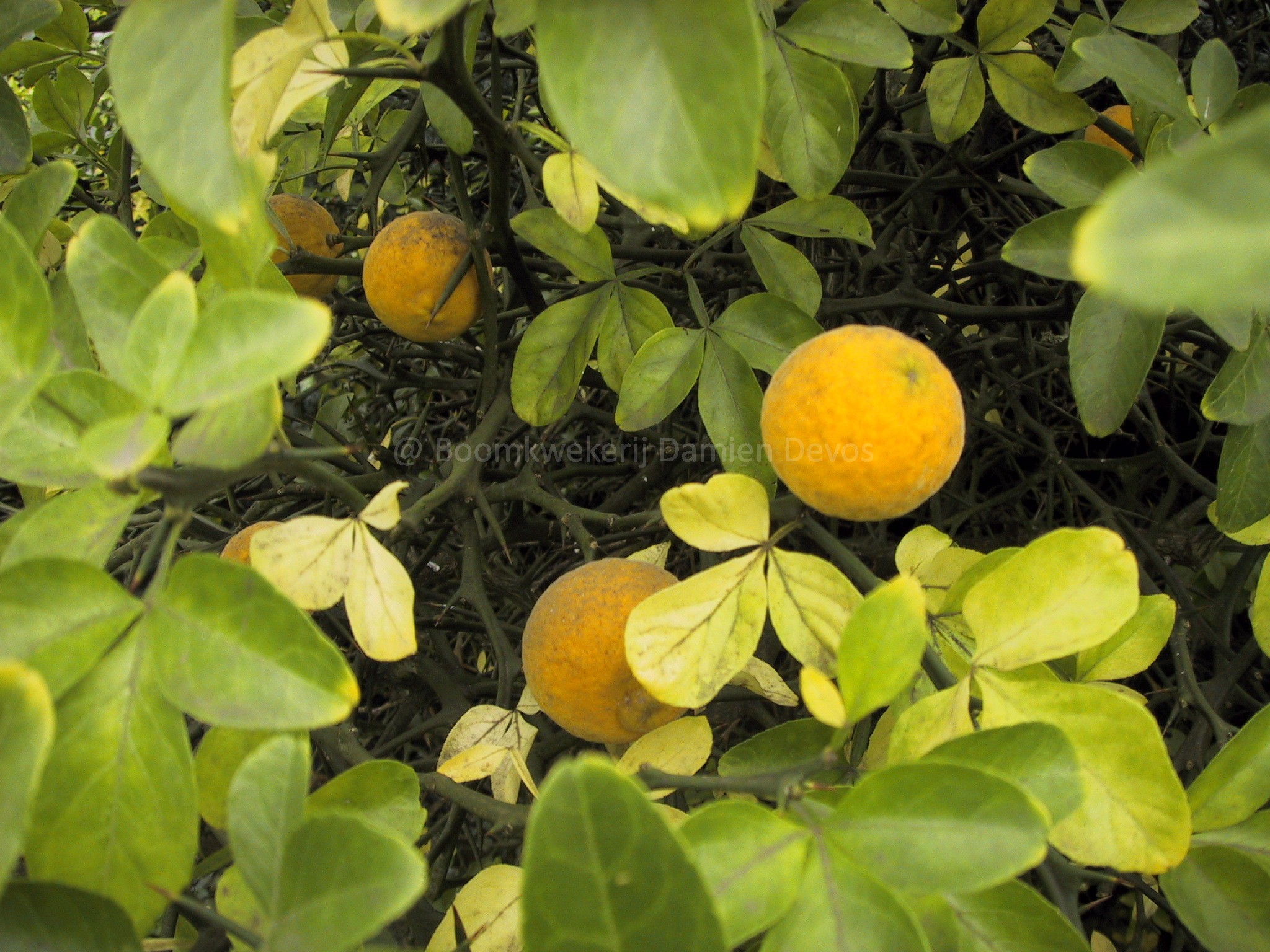 Poncirus trifoliata is de enige van de citrusachtigen die (goed) winterhard is in ons klimaat! In april komen er naar citrus-geurende bloemen aan de plant. Daarna komt het groene blad aan de struik. Op het eind van de zomer verschijnen dan kleine geurende sinaasappeltjes aan de Poncirus. Een schaaltje met een aantal van deze sinaasappeltjes op de tafel zorgt voor een aangename geur in huis! Op de plant zitten stekels, die duidelijk zichtbaar zijn als de plant zijn bladeren verloren heeft in de winter. Daarom is deze plant eventueel interessant als natuurlijke afsluiting.