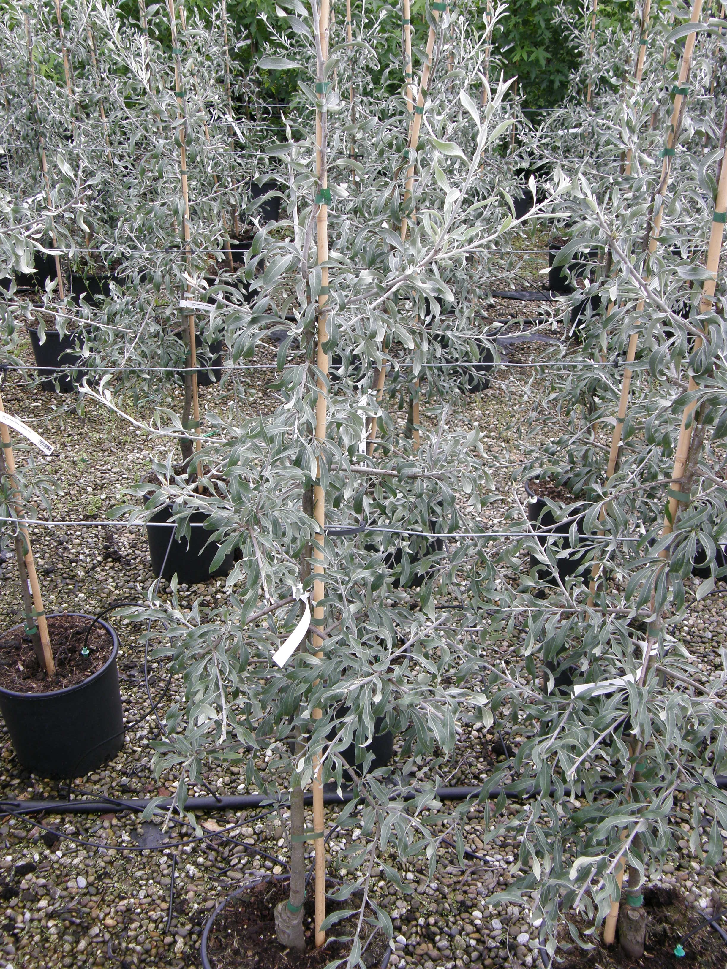 Klein elegant boompje met smal elliptisch blad dat grijs-groen is.