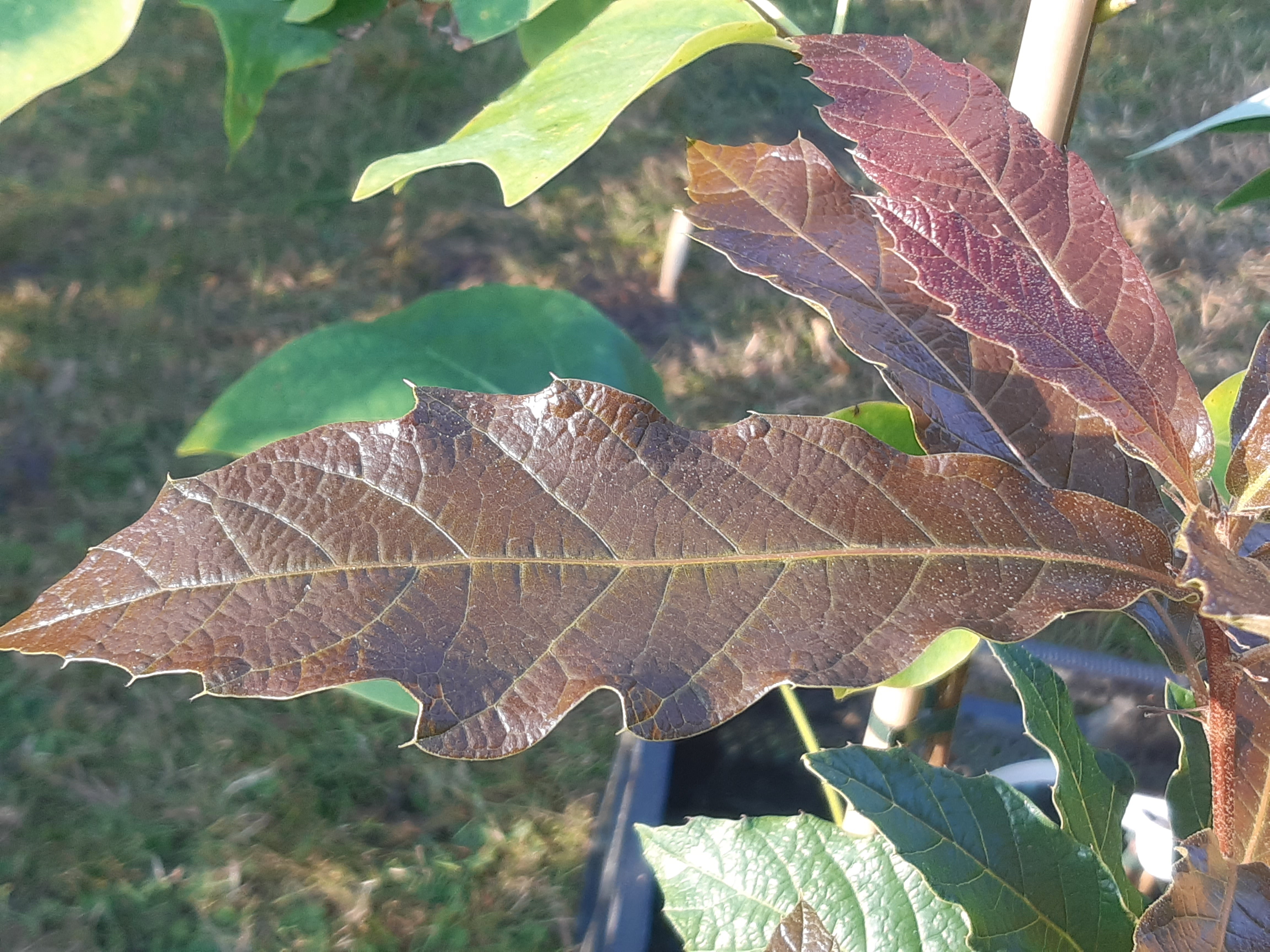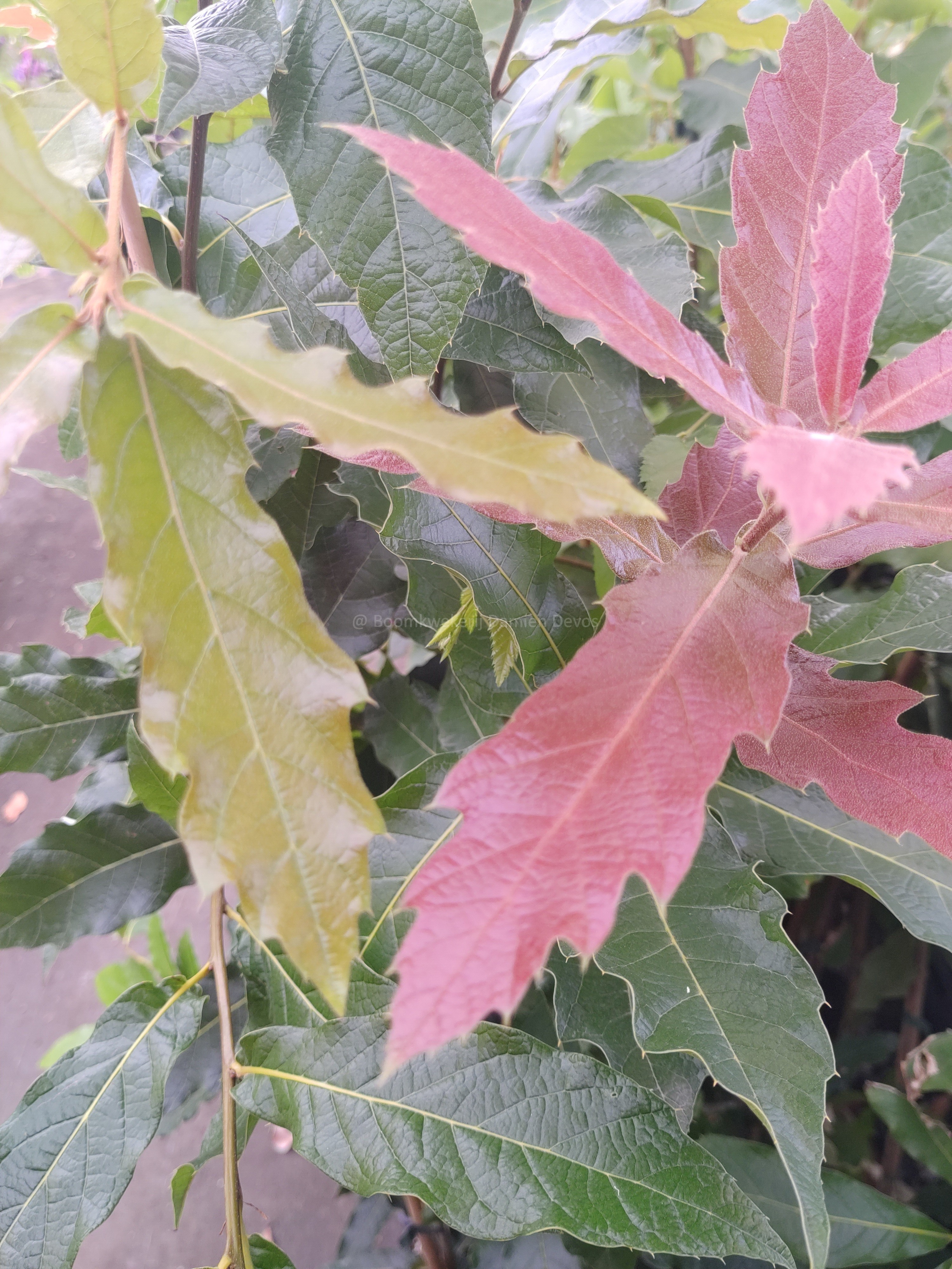 Deze Mexicaanse eik is een wintergroene soort met opvallende bladeren en een zeer opmerkelijke stam. De jonge bladeren hebben een diep rode kleur waardoor de plant bestaat uit een mengeling van groen en rood. De stam is donkergrijs en glad maar zal uiteindelijk gaan afschilferen waardoor de lichtere kleur eronder tevoorschijn komt.