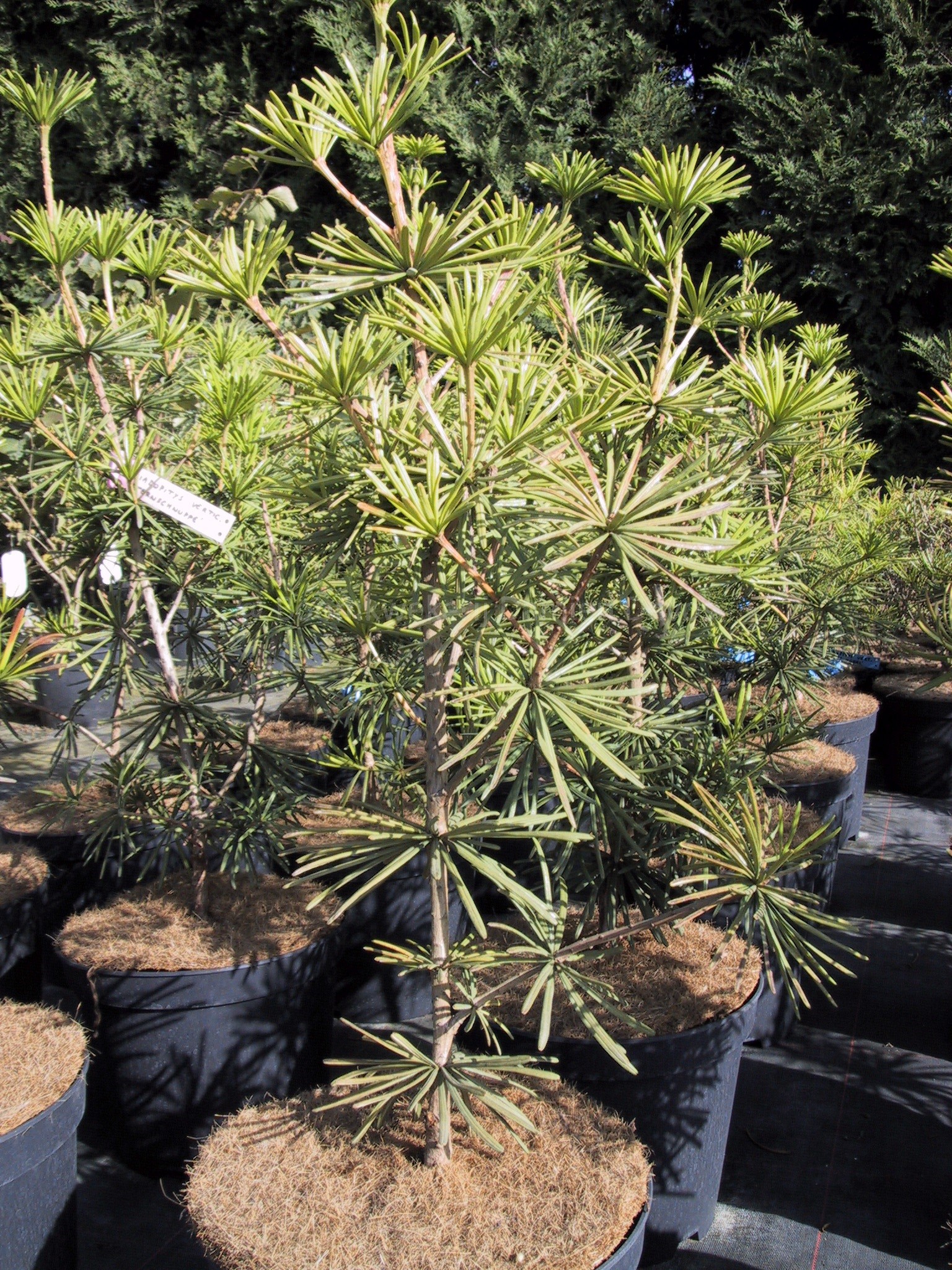Goed winterharde, kleinblijvende Japanse parasolden. Houdt het meest van een standplaats in de zon of halfschaduw. Wordt een goede 2 meter.