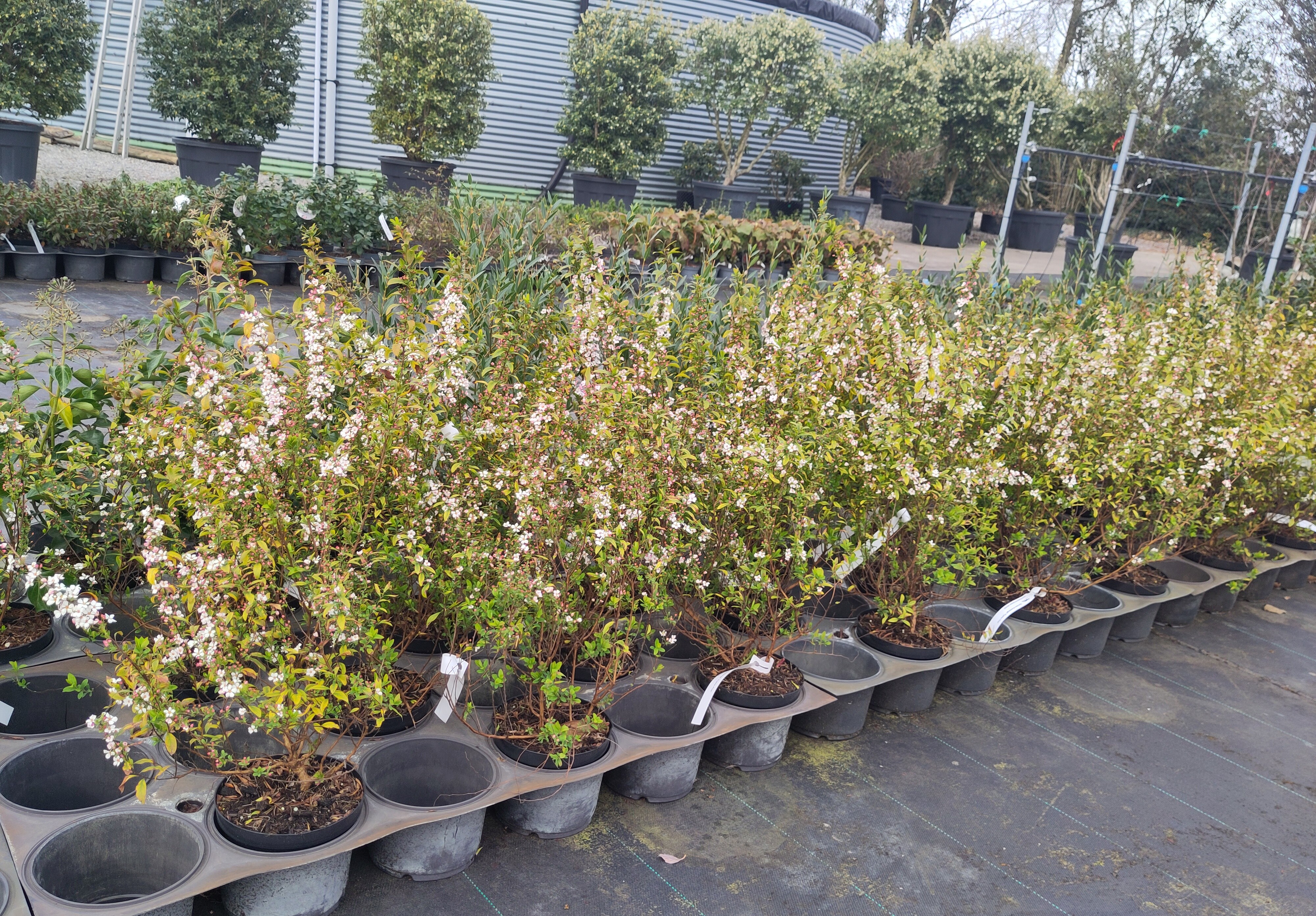 Spiraea thunbergii 'Fujino Pink' krijgt roze knopjes en erna eind maart - april fijne, witte bloempjes.